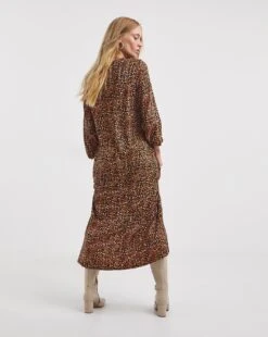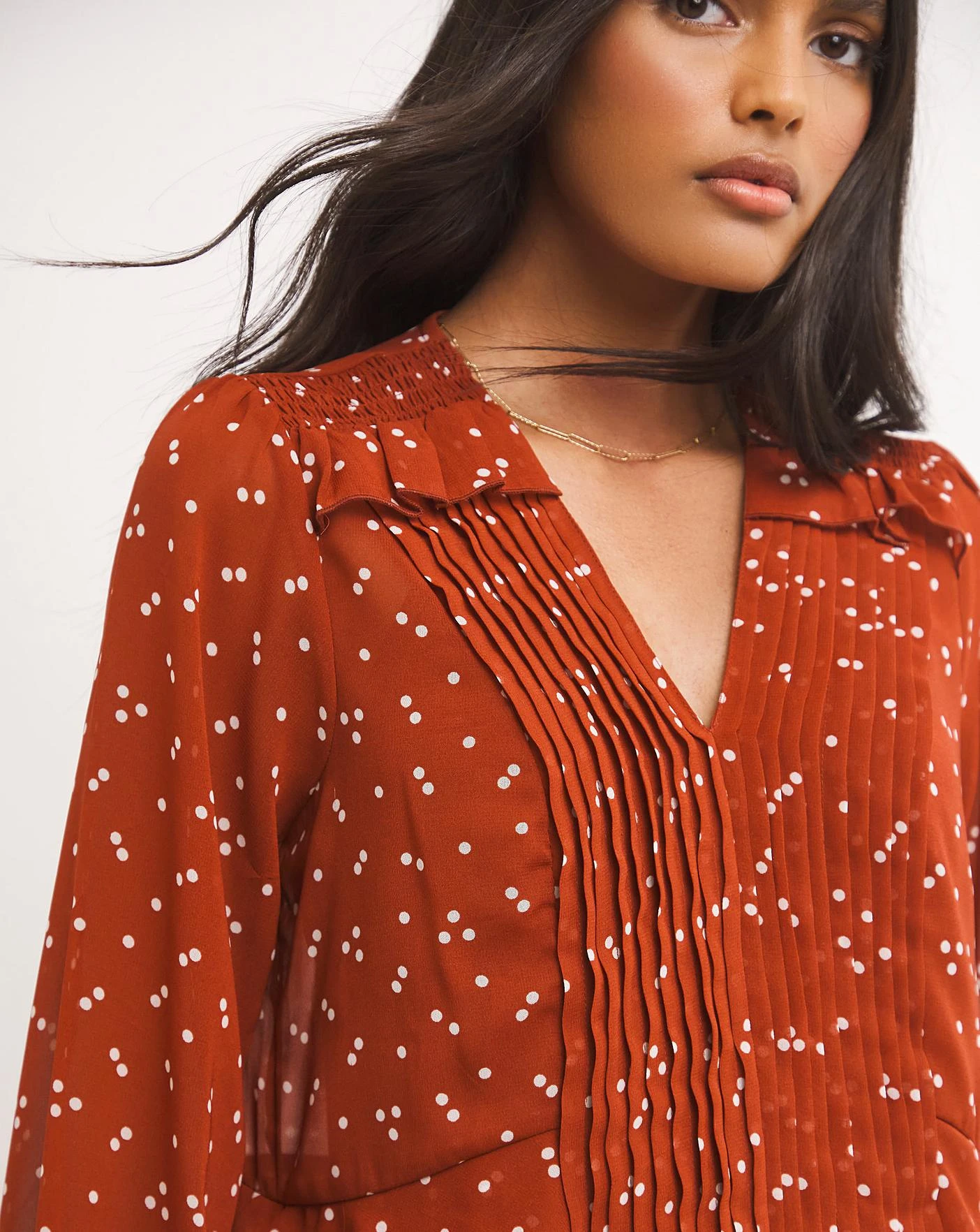 Adorned with pintucks, this dress is will carry you from office to dinner. Designed with shirring and frill detailing on the shoulders, long balloon sleeves with elasticated cuffs, and includes a matchining detachable, stretch cami lining.