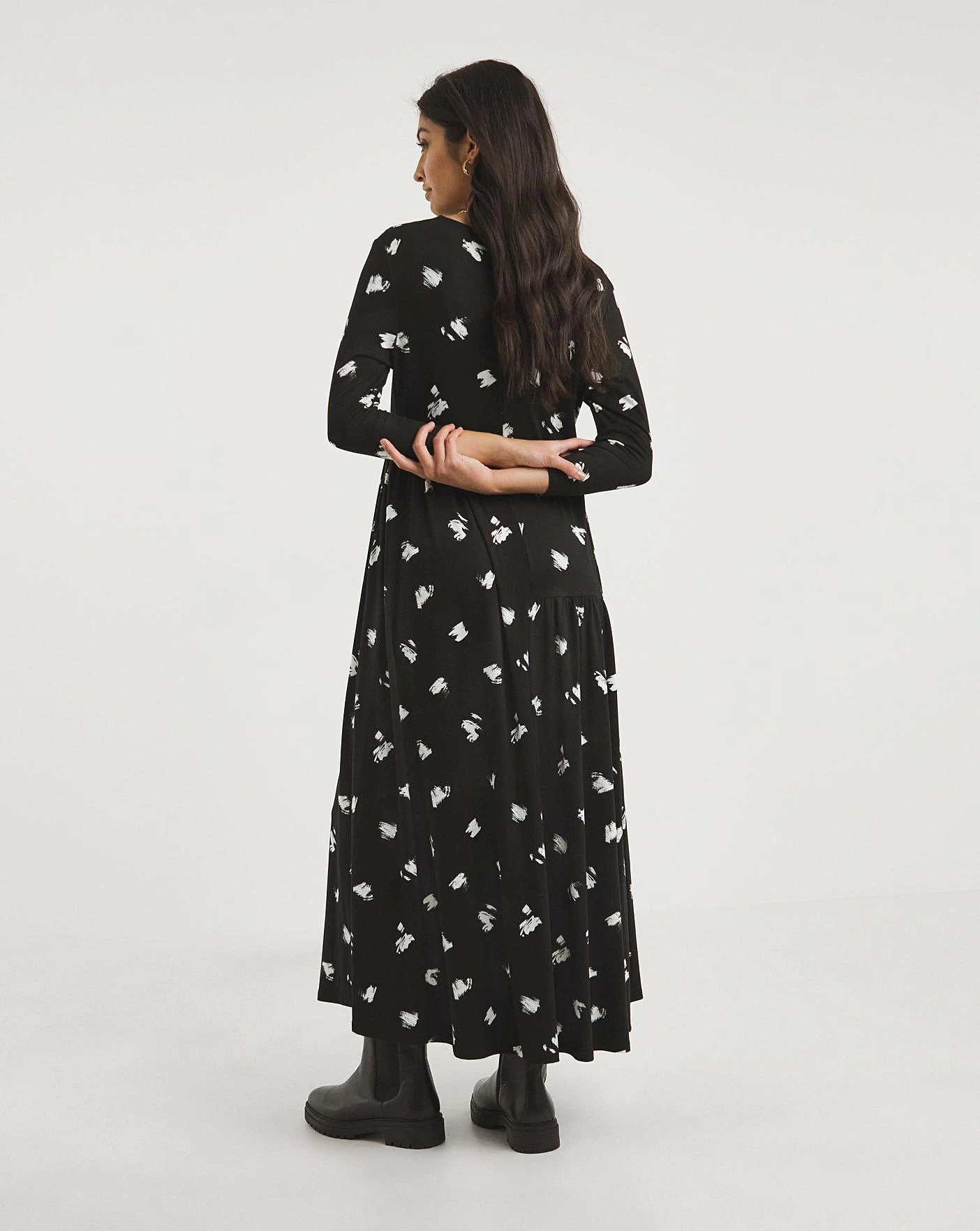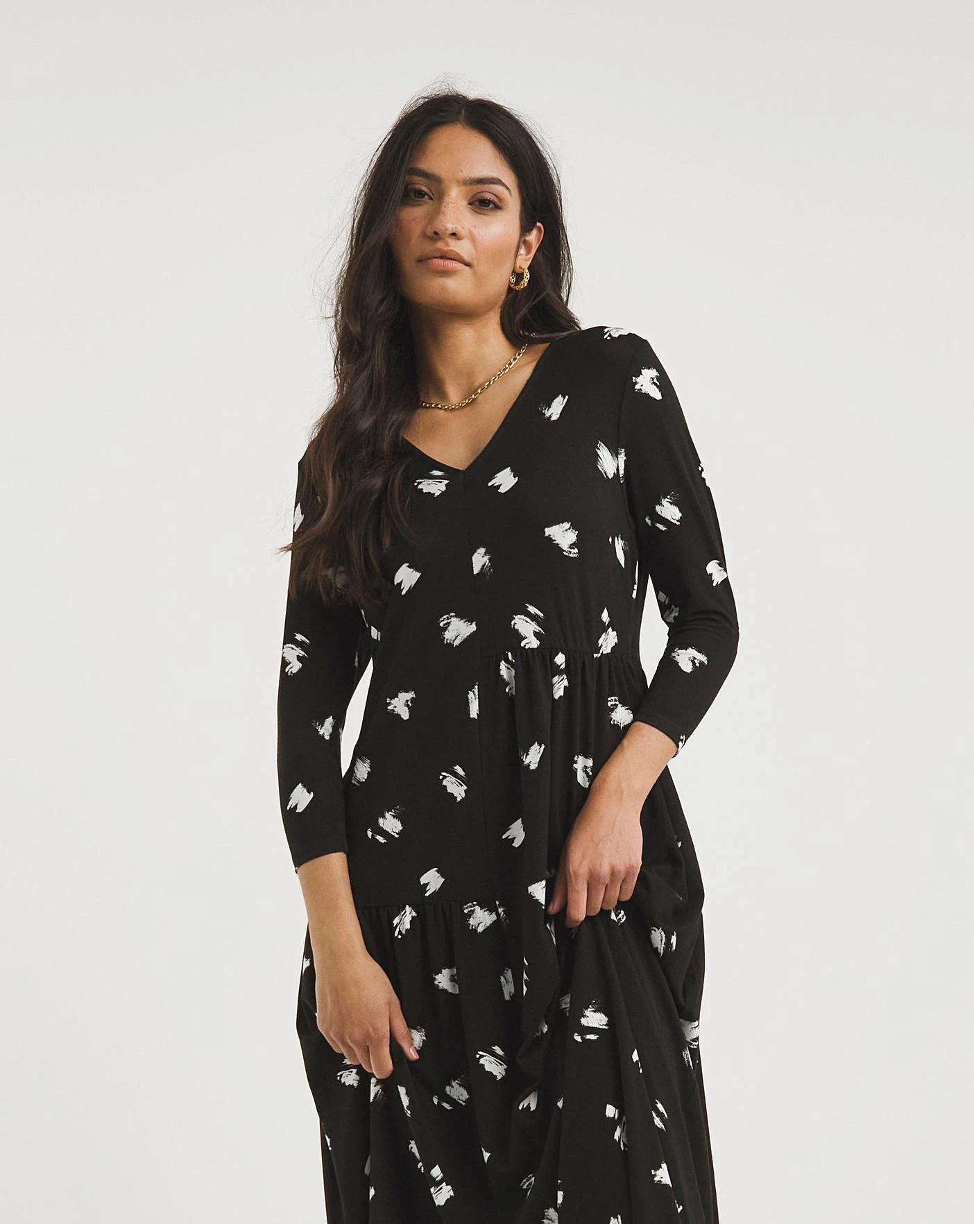 You will love the super soft feel of our best-selling Soft Touch Jersey fabric, consciously sourced from re-cycled materials. Featuring three quarter length sleeves, assymetric hems and an elegant v-neckline. Designed in a flattering smock shape, this easy versatile dress will be your go to throw on, perfect for everyday styling.