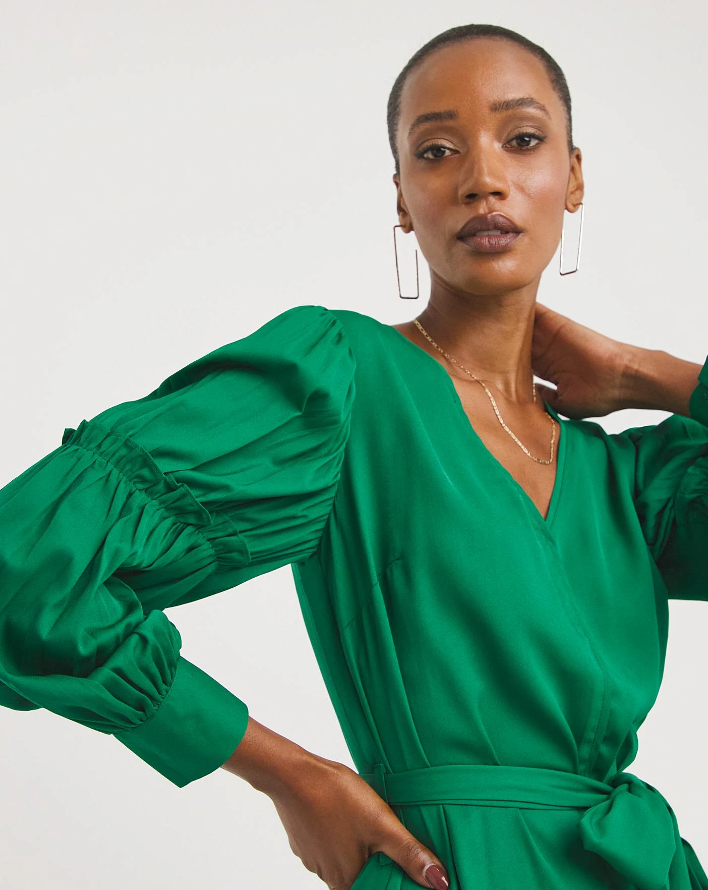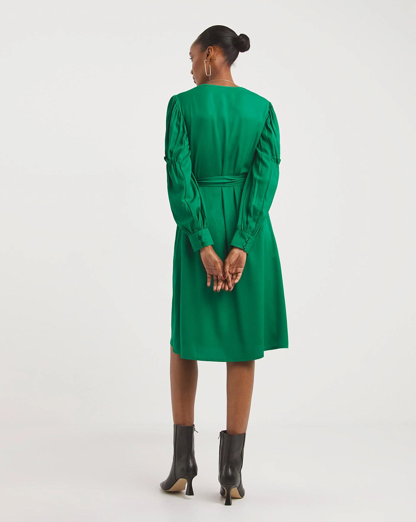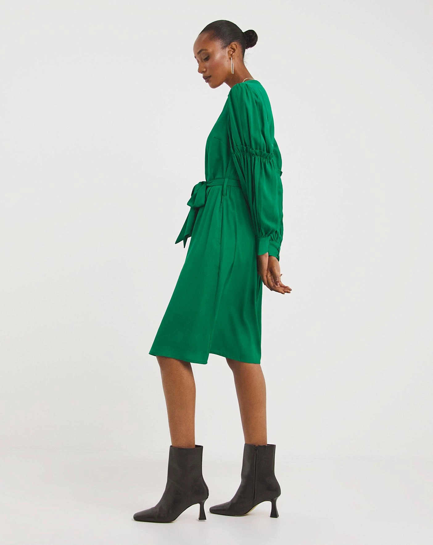 The perfect dress for any occasion! With balloon frill sleeves and button cuffs, a detachable waist belt to give you the option of a relaxed or fitted style and side pockets for practicality. This dress is designed in a beautiful green. Complete the look with a pair of your favourite heels or dress down with boots for more of a casual feel.