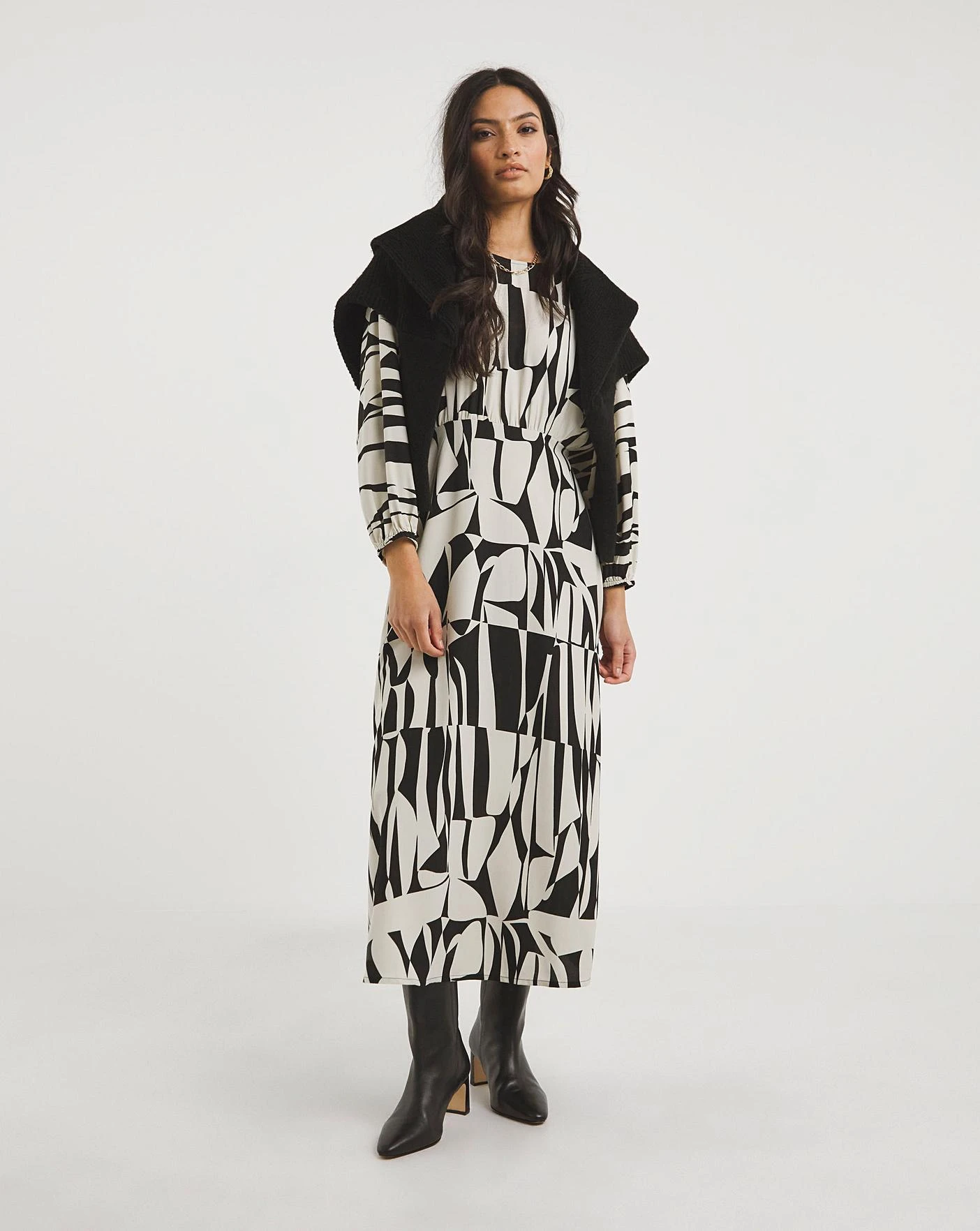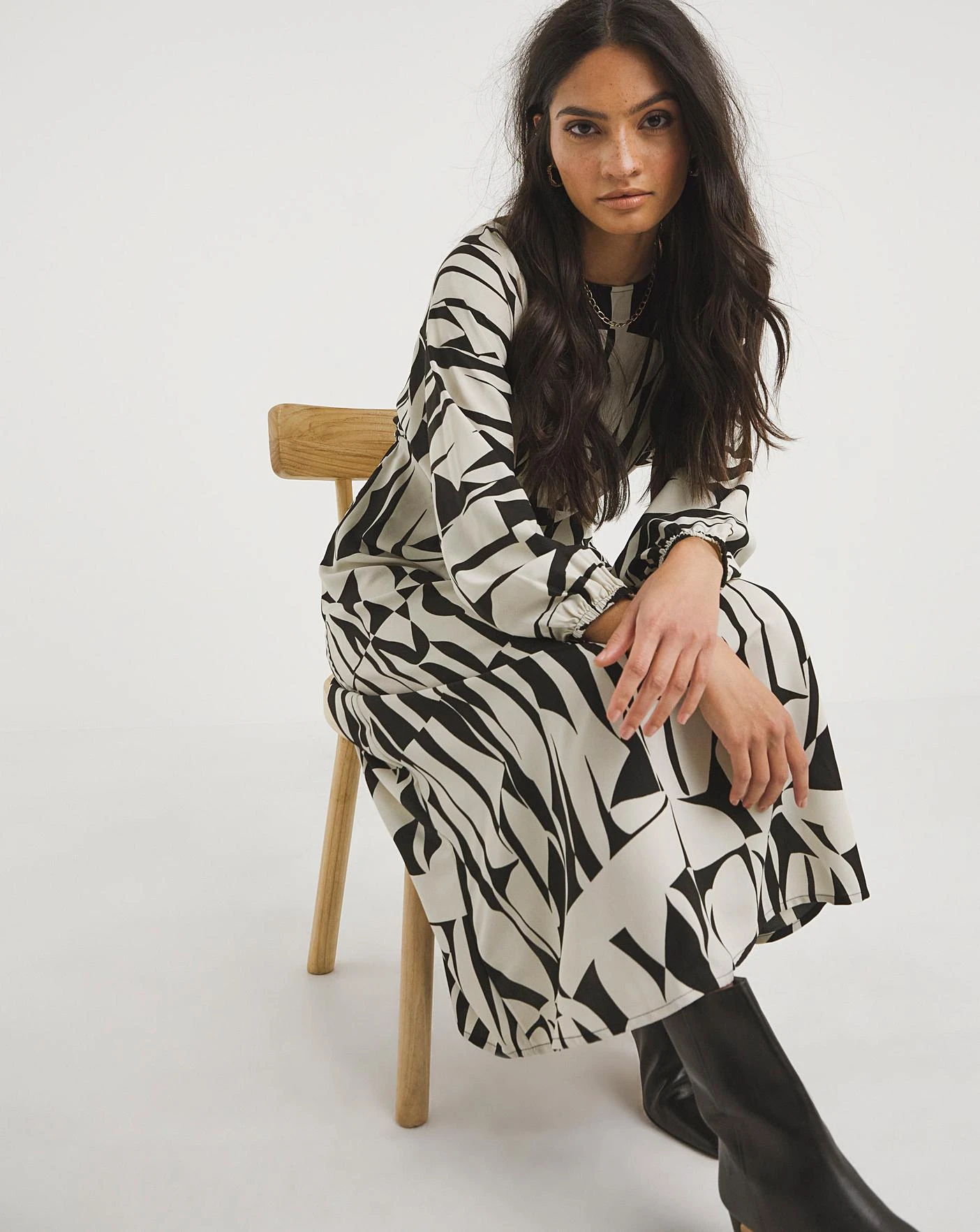 Elevate your wardrobe this season with this high neck midi tea dress. Featuring a high ruched waist seam with back elastic, a keyhole at the back of the neckline with a small button making it easy to slip in and out of the dress and balloon sleeves with elasticated cuffs. Designed in unique mono geometric print, perfect for day or night occasions.