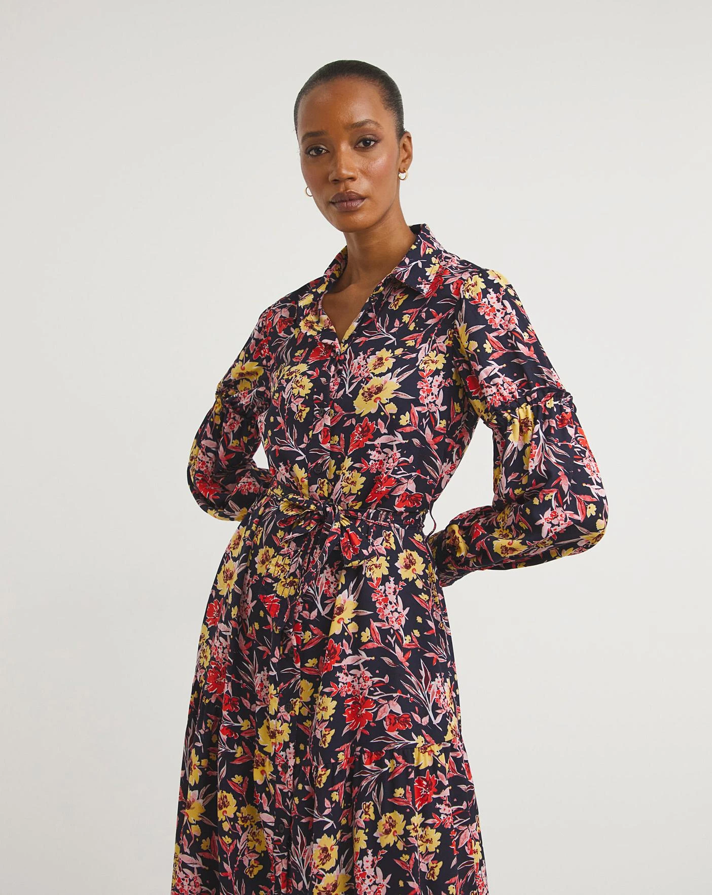 Get Autumn ready in this striking floral dress designed in a colourful print. This shirt dress features balloon sleeves with deep button cuffs adding sophistication, a button through front and a detachable tie belt to accentuate the waist.