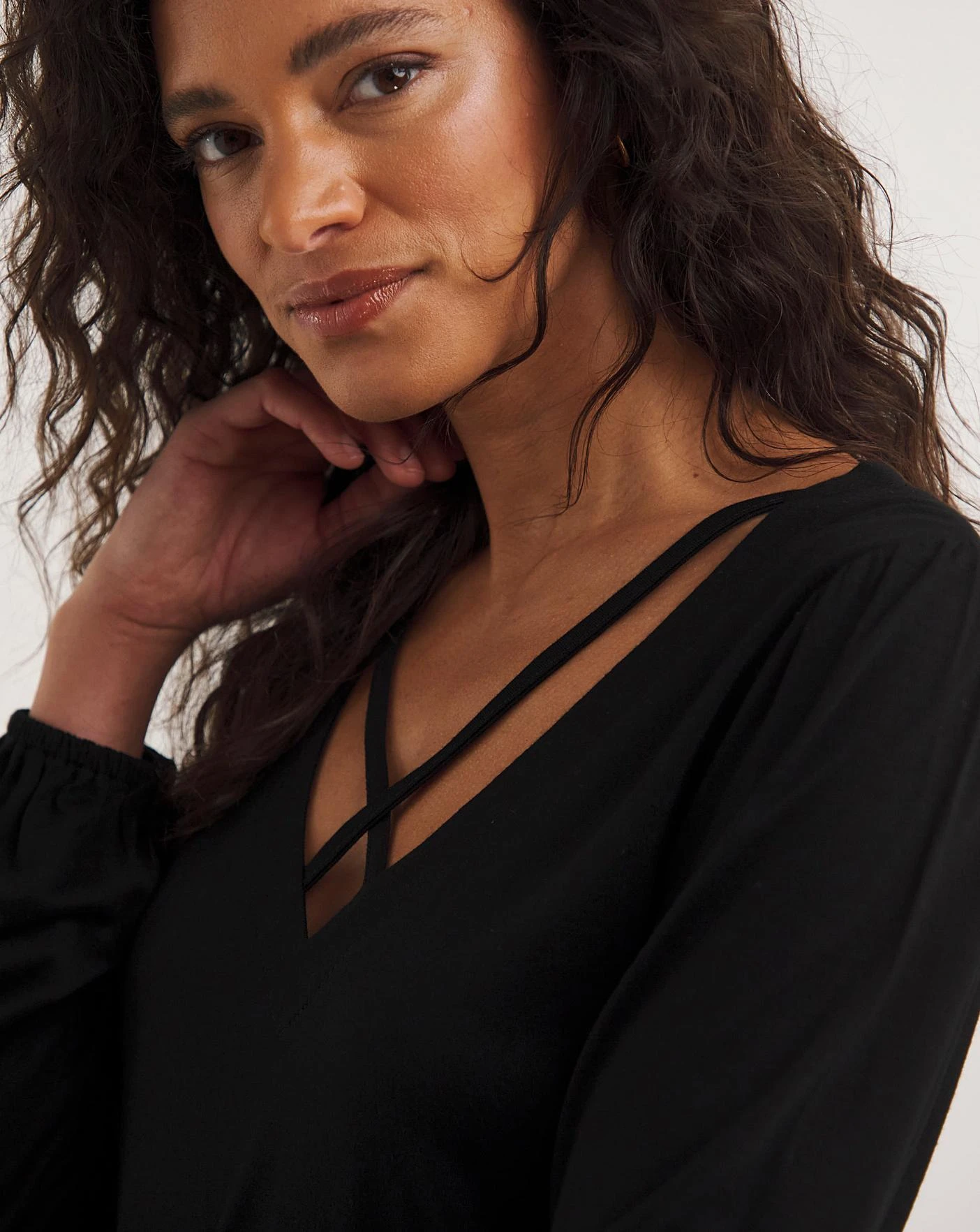 Feel fabulous and feminine in our long sleeved tea top. In a flattering shape, this top comes with a stylish cross over neck detail which adds a sprinkle of newness to your wardrobe. Pair easily with jeans and boots for a going out look.