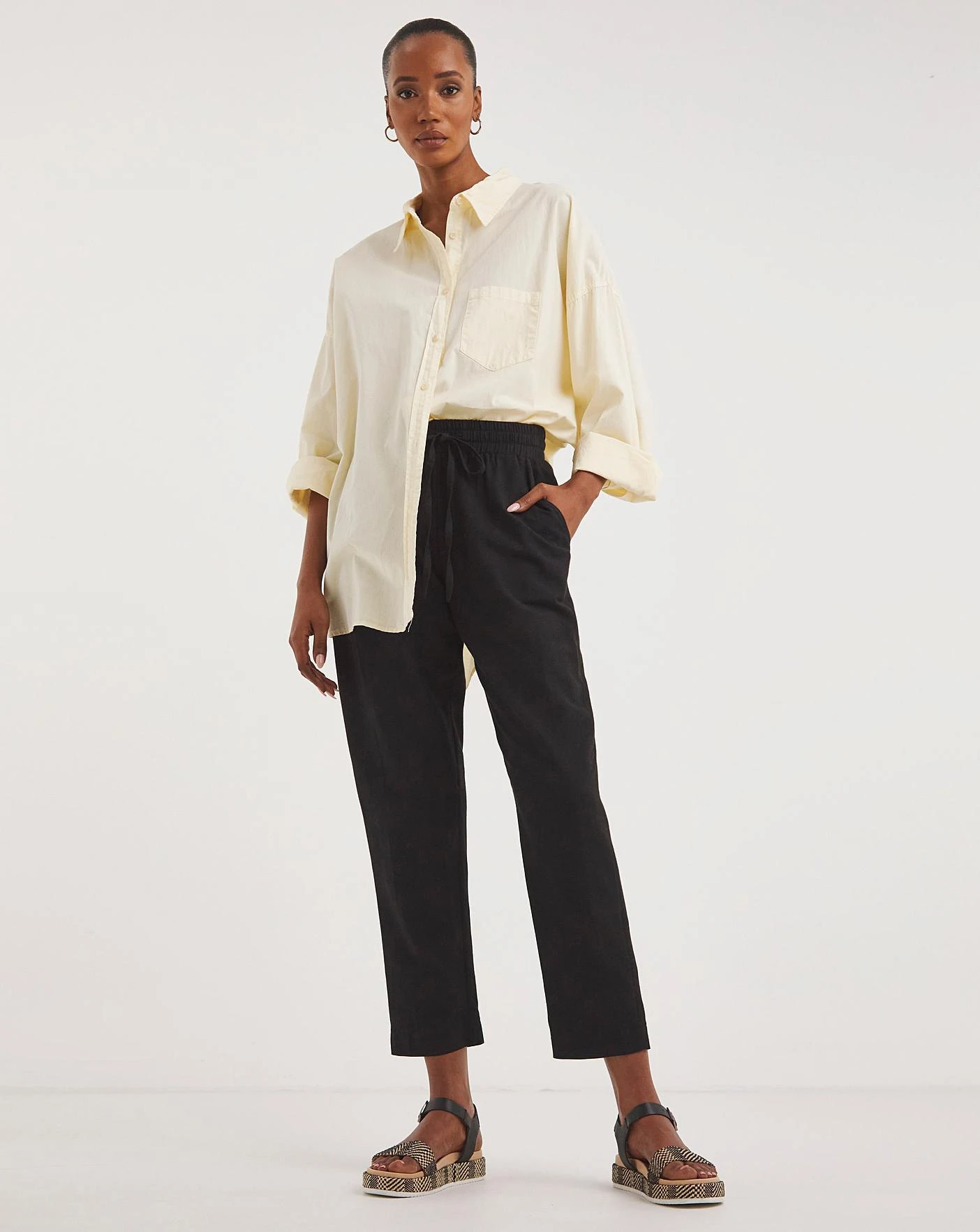 In our best selling linen blend fabric, these trousers are an essential for every wardrobe. Super comfortable and super easy to style, these trousers have a pull on waistband for ultimate comfort as well as a tapered jogger leg shape which is easy to pair with any footwear. Perfect for summer months, these trousers sit high on the waist providing a flattering shape.