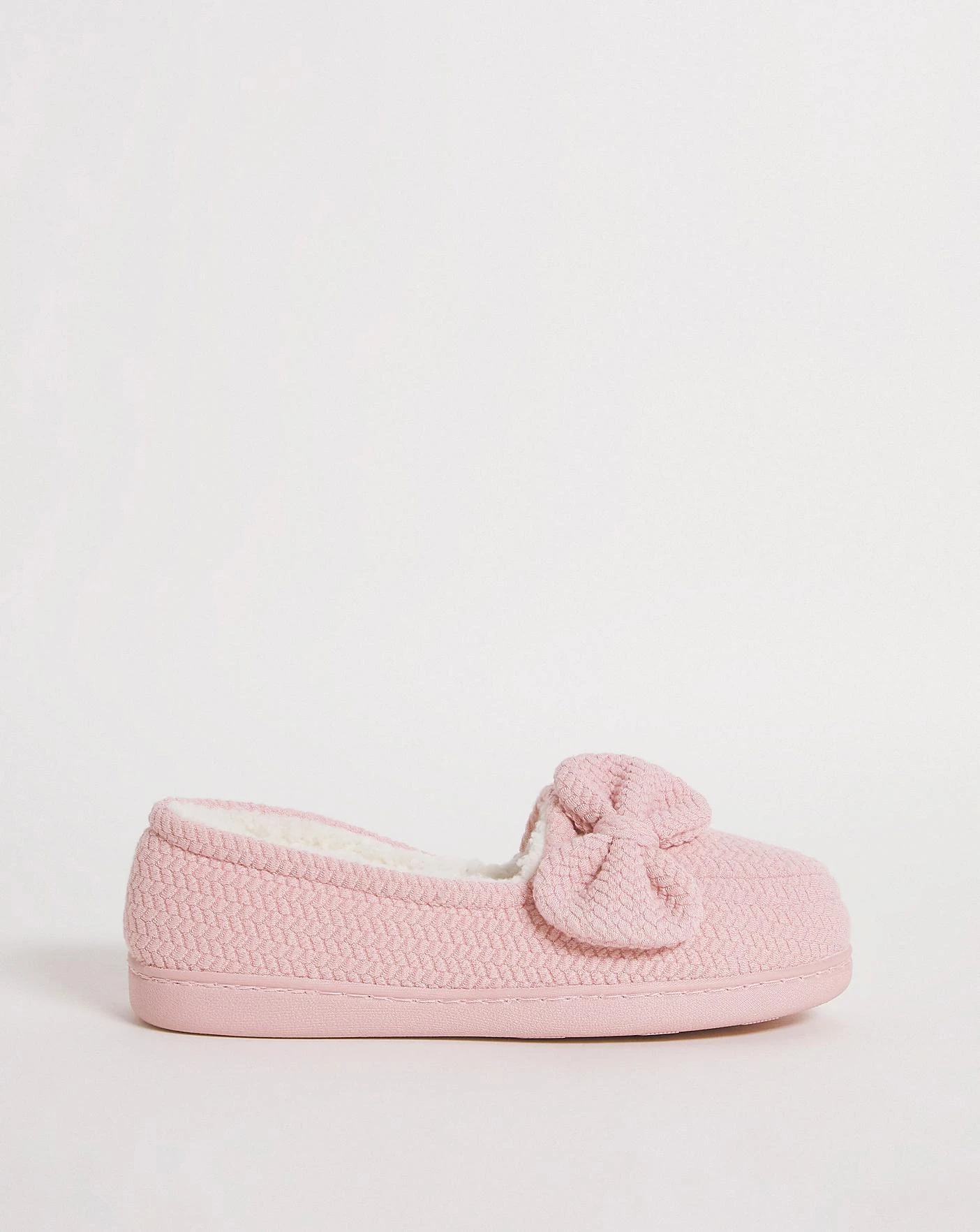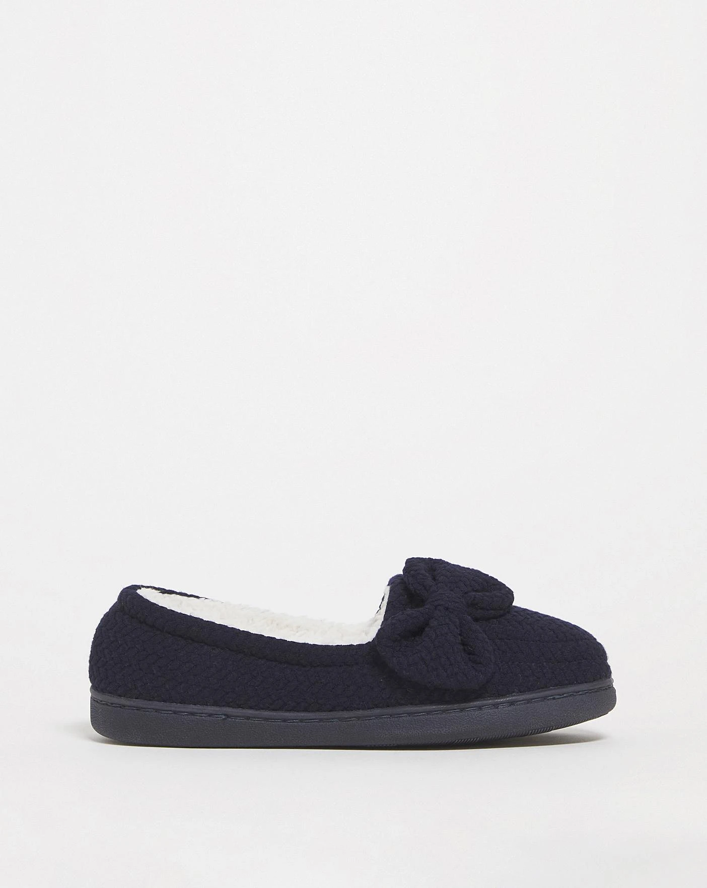 Keep your feet nice and warm in these cosy slippers. They feature a soft plush lining and bow detail.