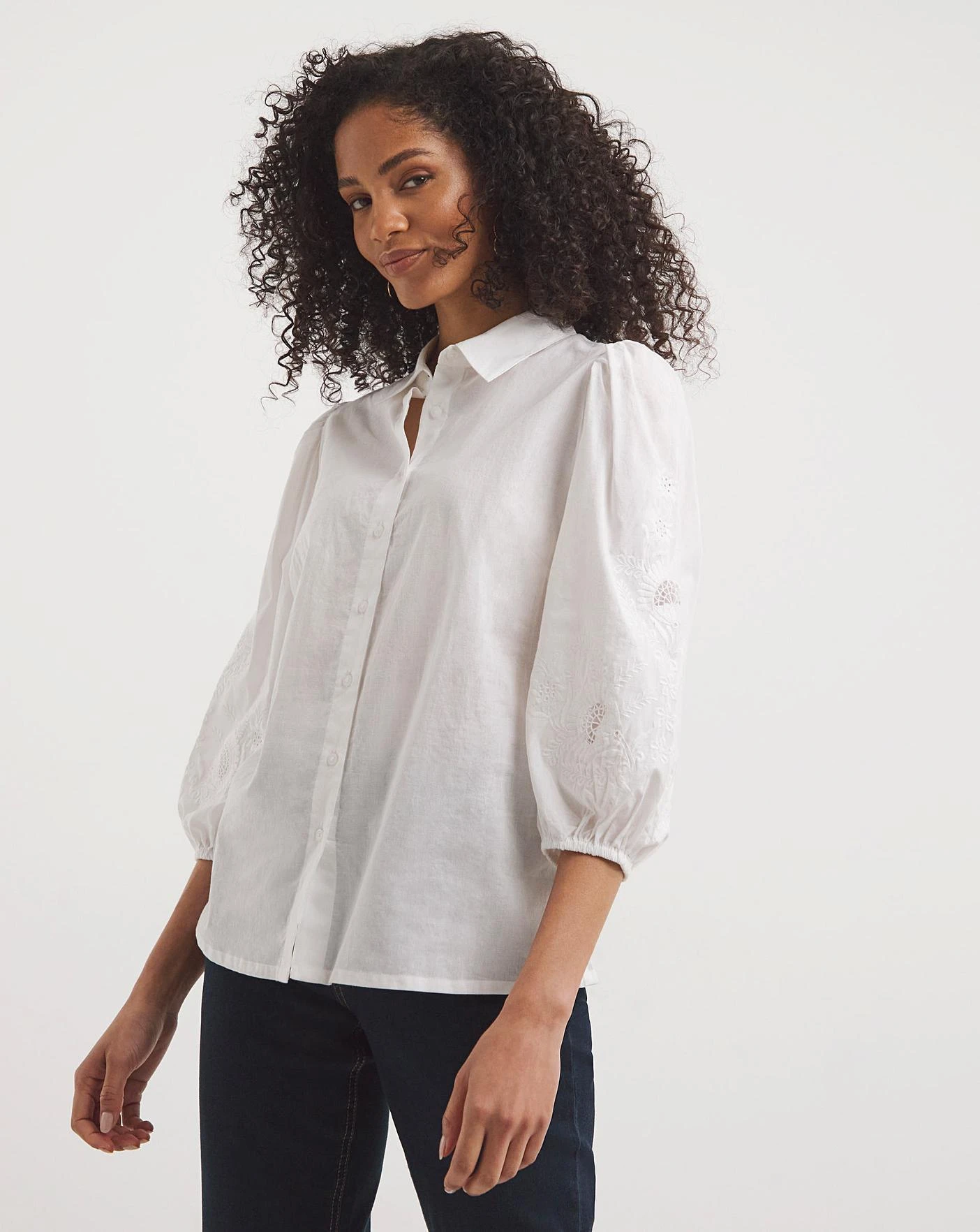 This shirt is a great day time piece that can be paired easily with casual jeans or trousers. Featuring a flattering broderie sleeve detail, this shirt is perfect for multiple occassions. Please note that this top comes in a relaxed fit so that you can stick to your usual size.