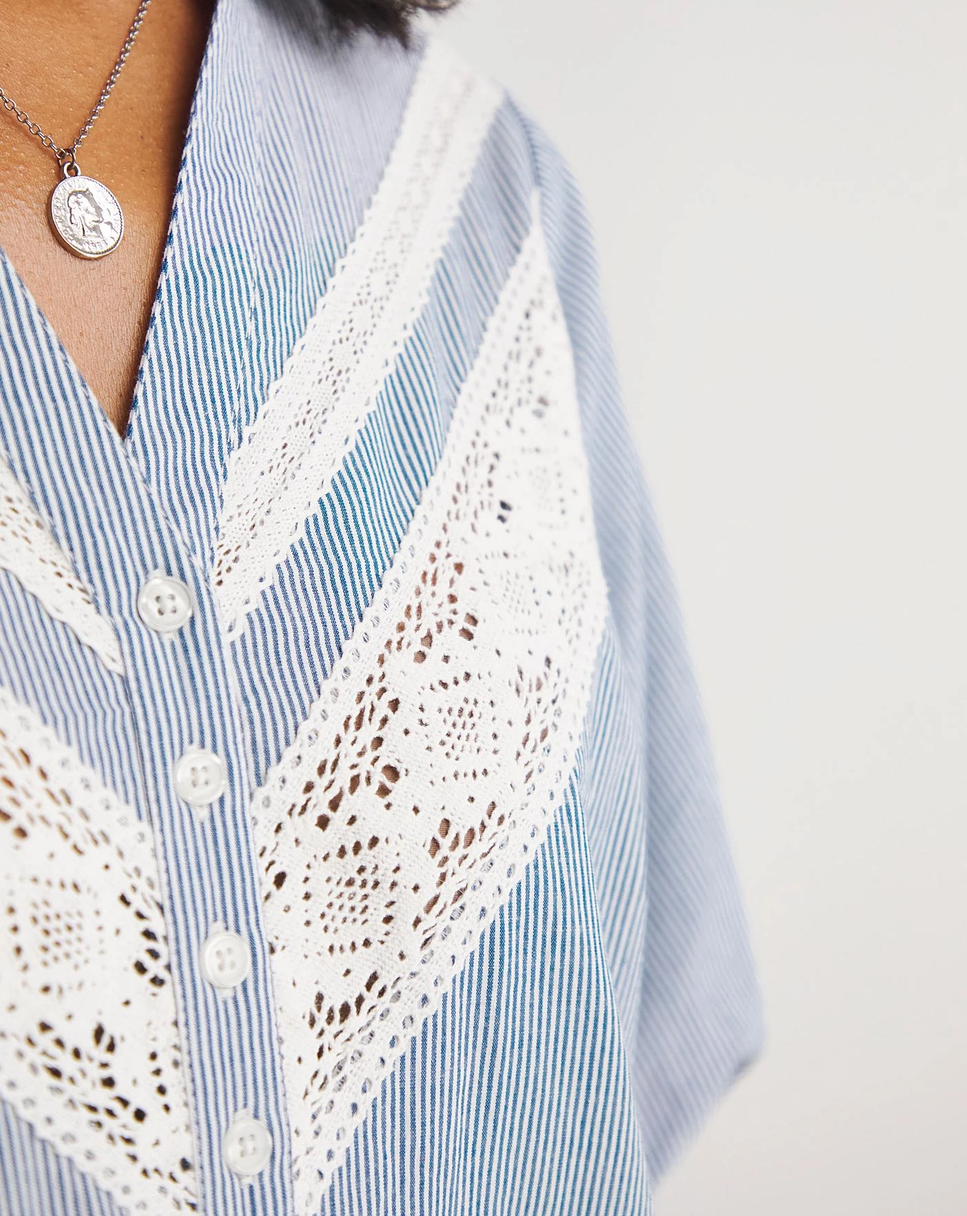 Our Button Front Lace Insert Top is a great day time piece that can be paired easily with jeans. In a flattering blue stripe and with a stunning lace detailing, this top can be styled tucked in or out dependent on your preference. Please note that this top comes in a relaxed fit and is made of a non-stretch fabric.