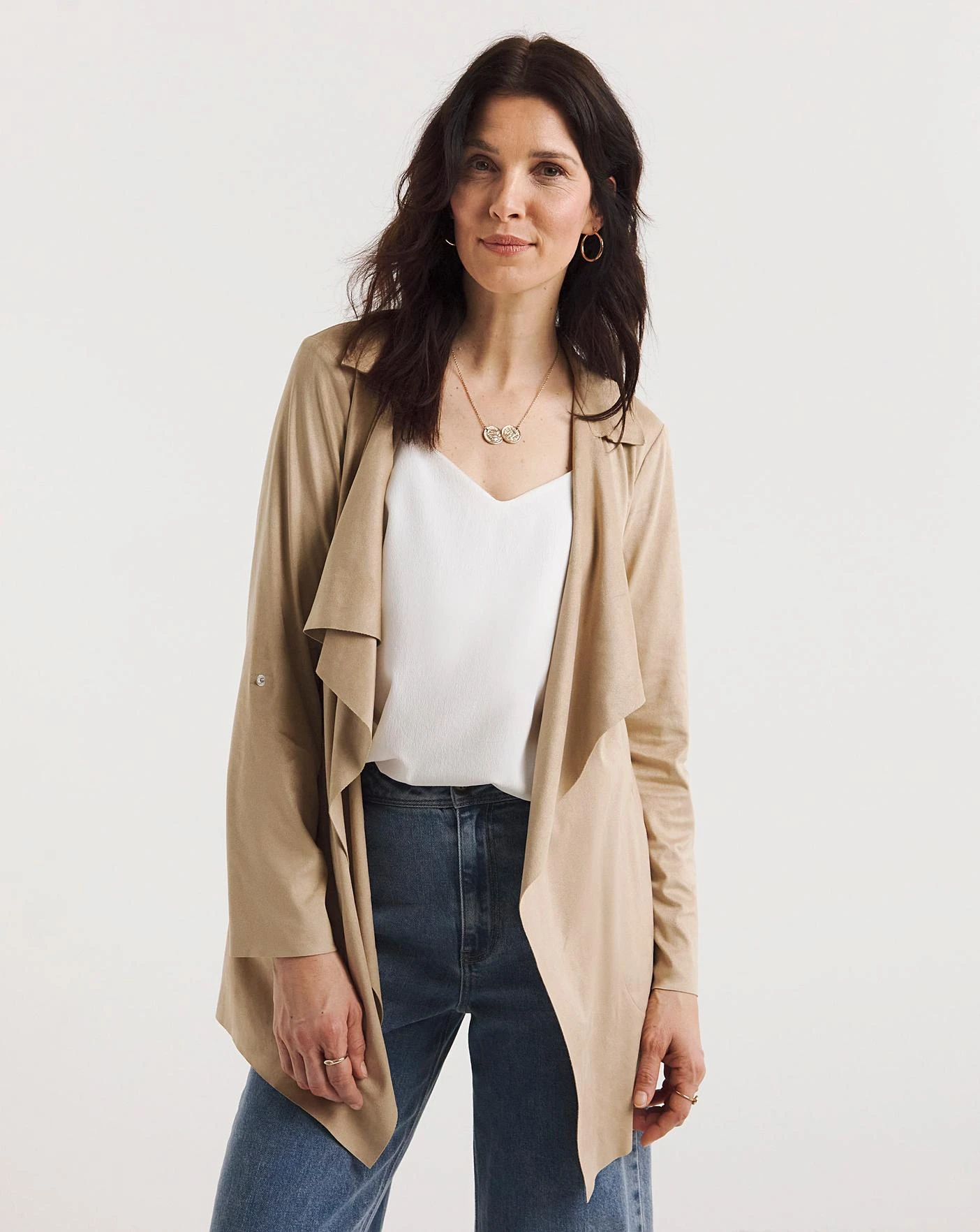 New in, our Suedette Waterfall Jacket! Featuring a beautiful, soft suedette fabric, adjustable cuffs for styling up or down and a super flattering waterfall front. The perfect easy to wear jacket, day or night.