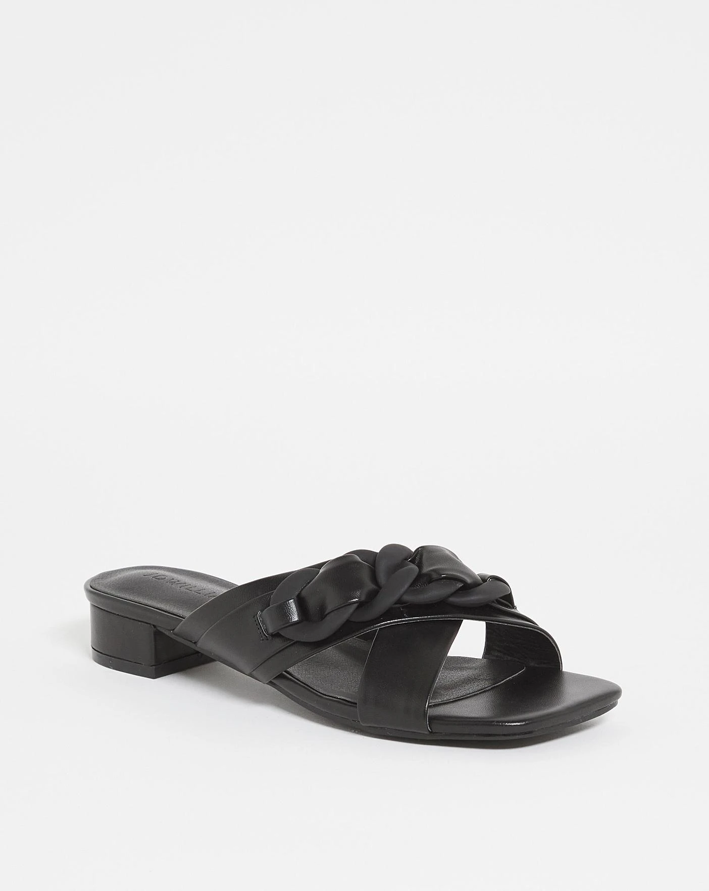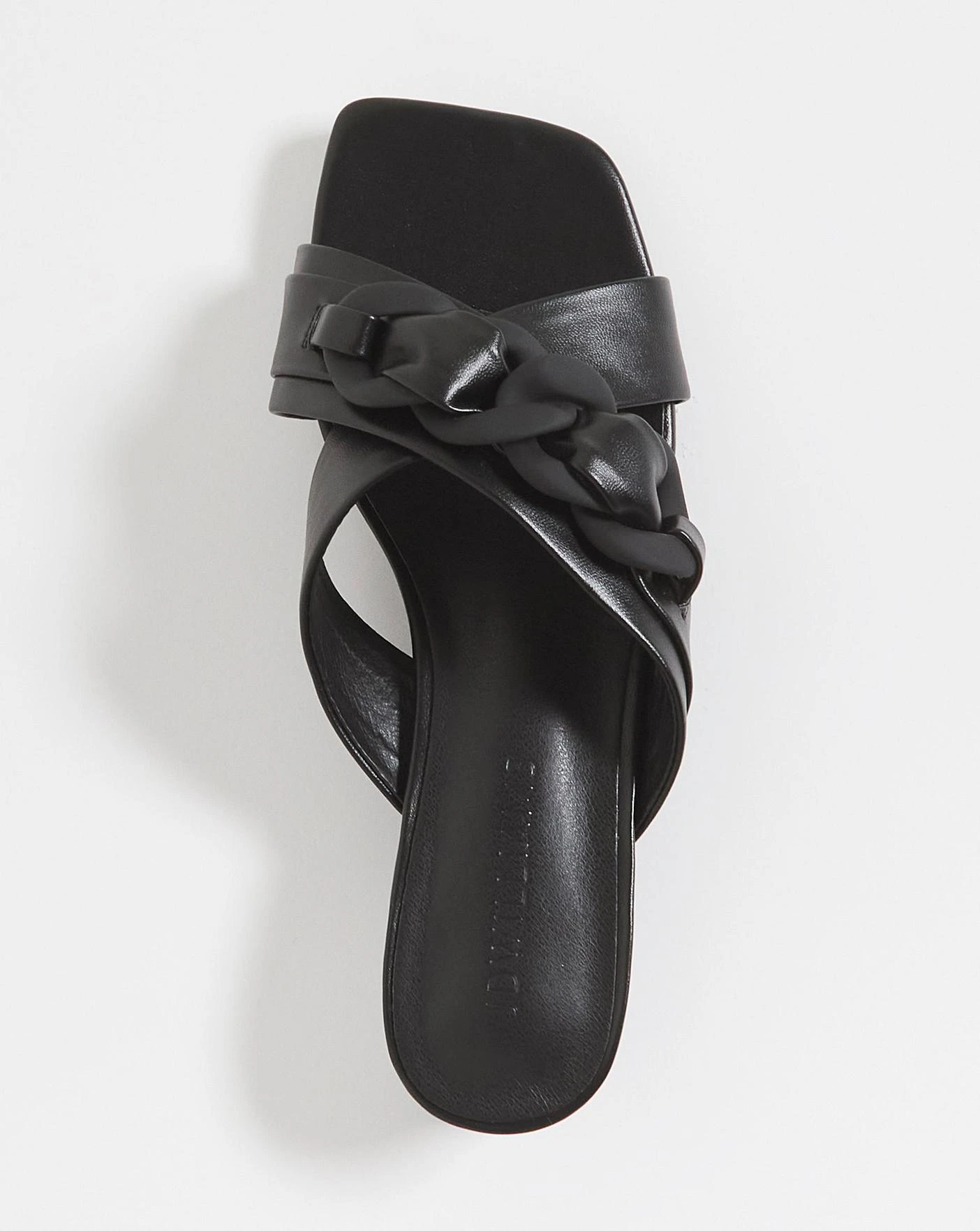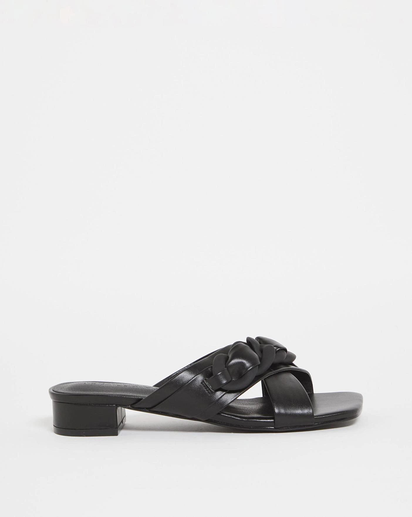 Our new sqaure toe mule is the perfect summer sandal. Designed with a crossover vamp with self-coloured chain detailing and a padded sock, this mule combines style and comfort for all day wear.