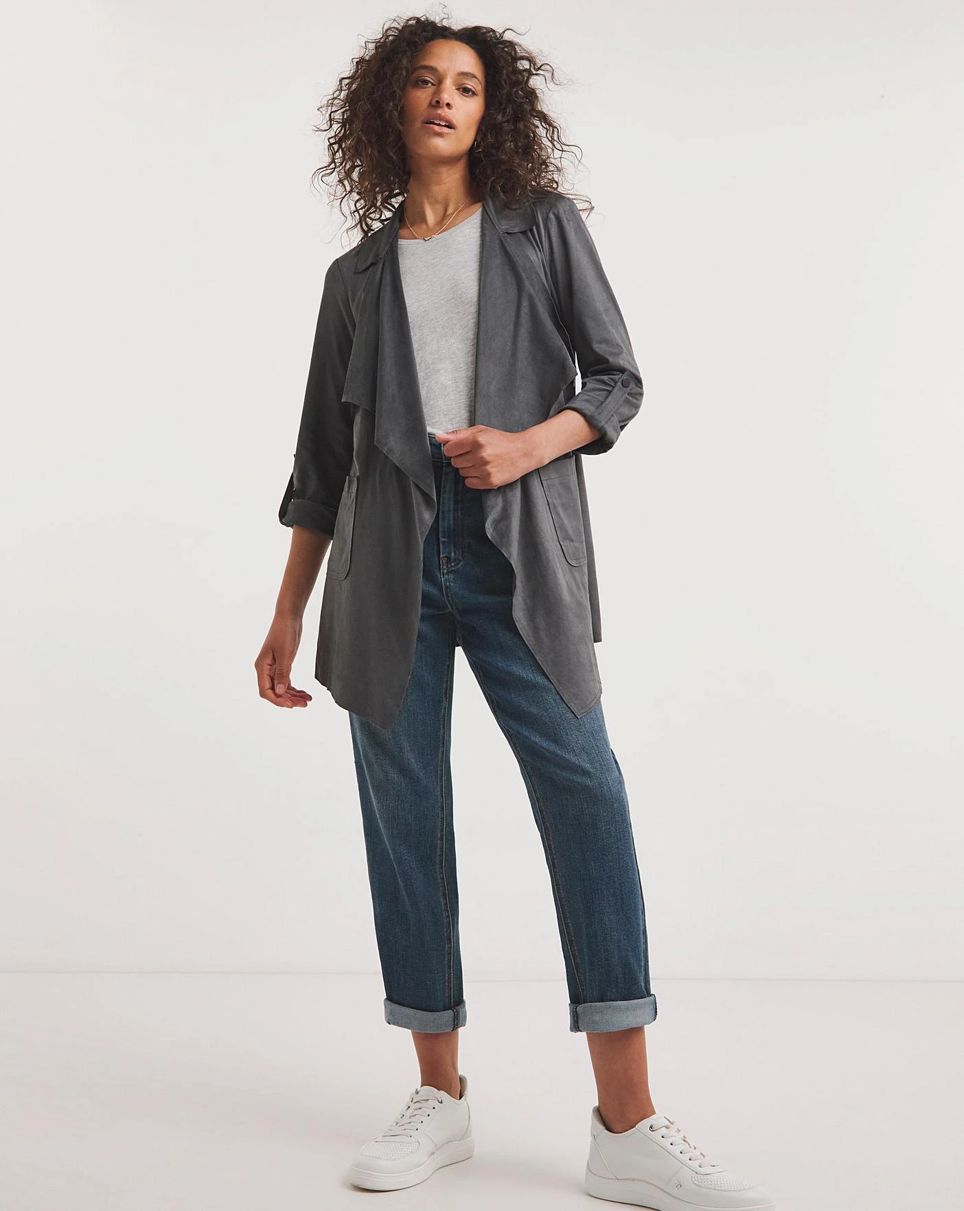 New in, our Suedette Waterfall Jacket! Featuring a beautiful, soft suedette fabric, adjustable cuffs for styling up or down and a super flattering waterfall front. The perfect easy to wear jacket, day or night.