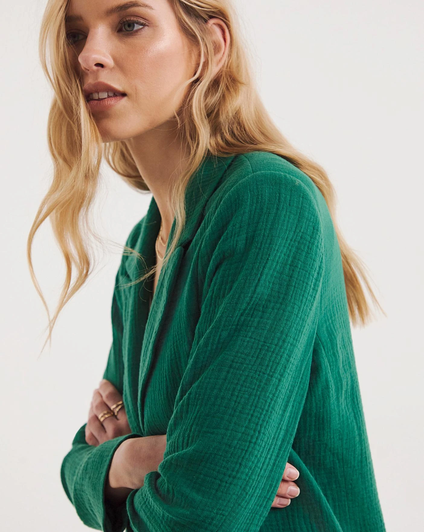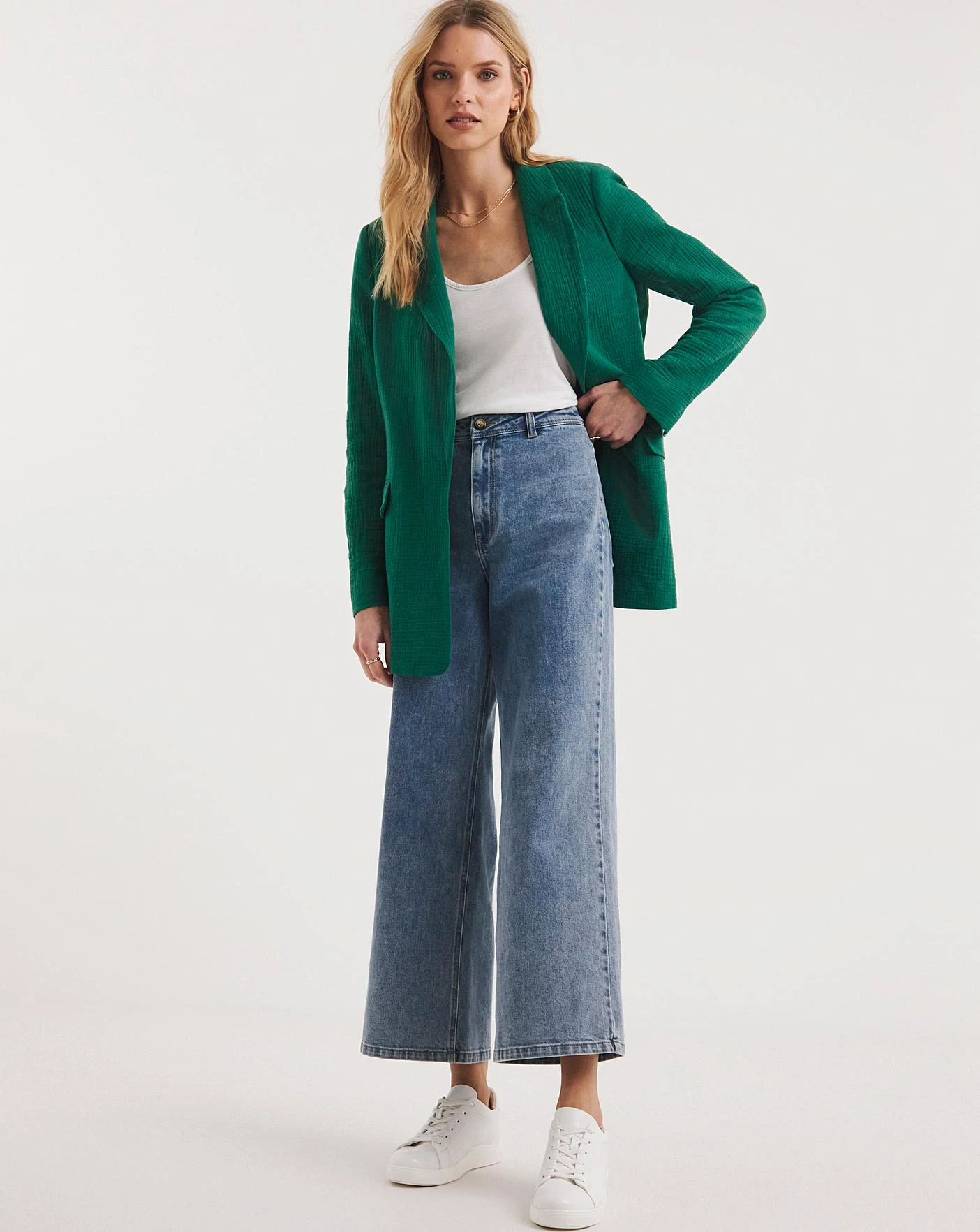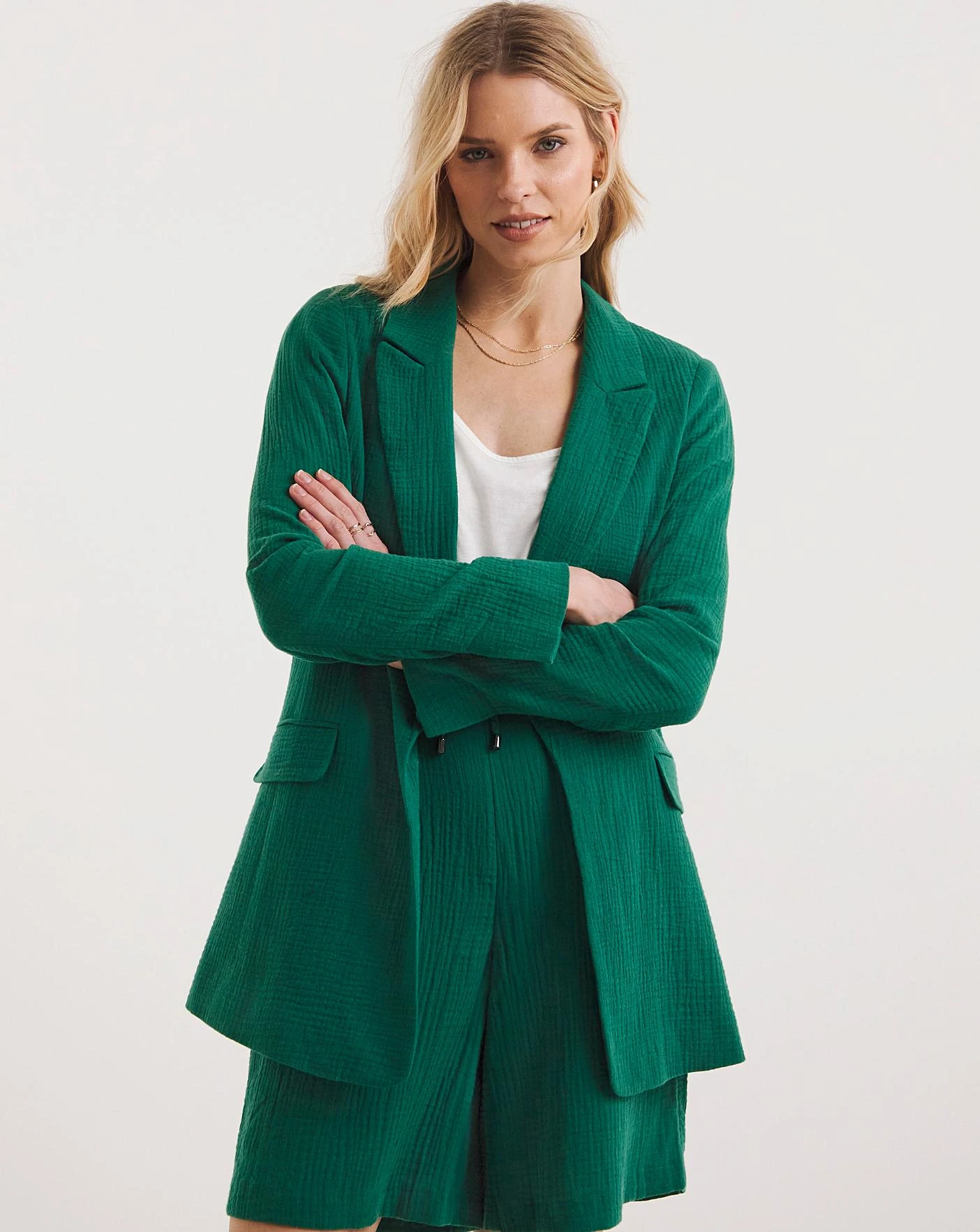 In a gorgeous Spring/Summer fabrication this striking blazer is a perfect statement. The lightweight cheesecloth fabric gives it a light and soft feel, ideal for the warmer months. Featuring flap pockets and notched lapels, this is an easy-to-wear throw-on style allowing maximum comfort. Complete the look with our matching edge to edge blazer for a stylish look.