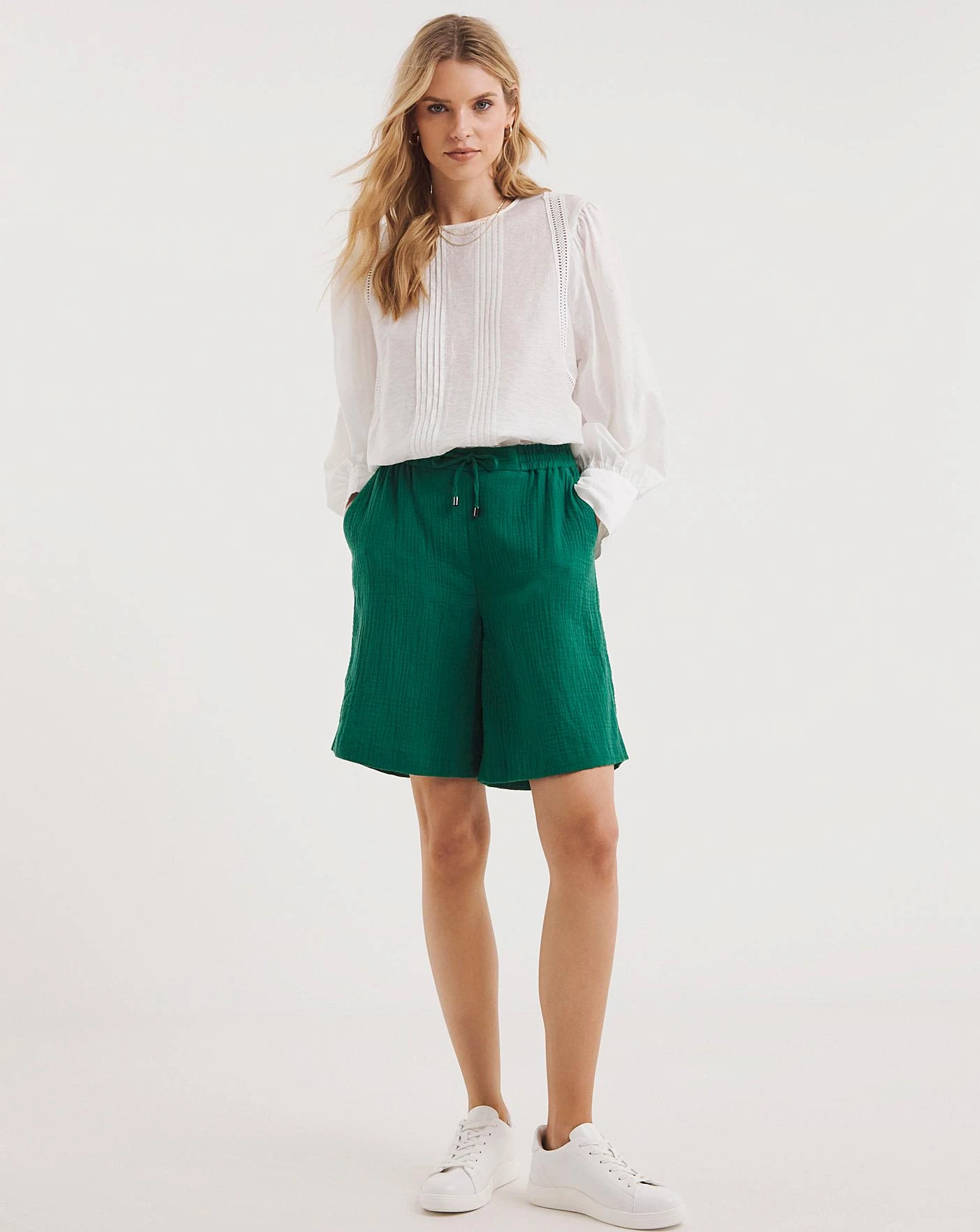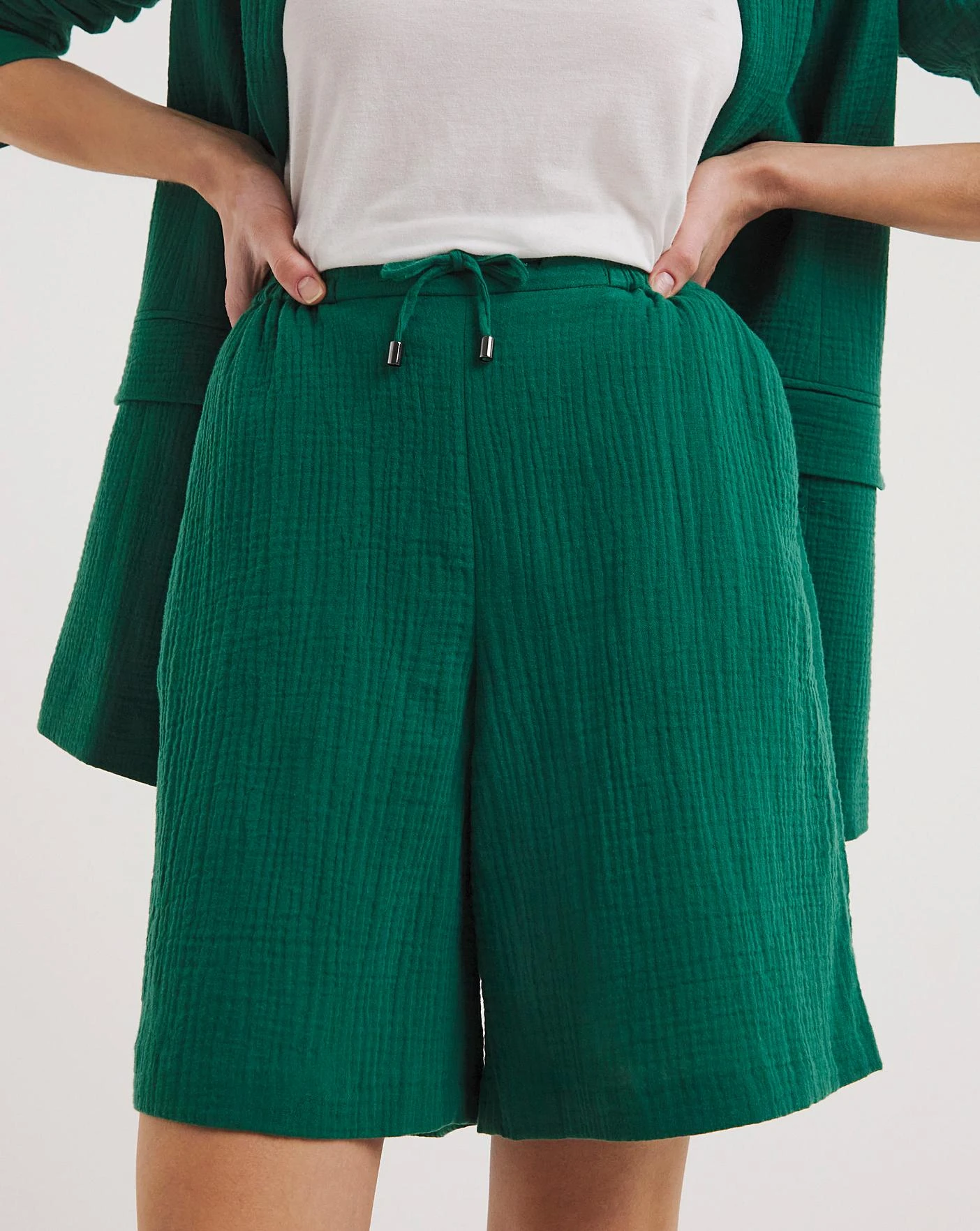 In a gorgeous Spring/Summer fabrication these striking shorts are a perfect statement. The lightweight cheesecloth fabric gives them a light and soft feel, ideal for the warmer months. Featuring an elasticated waistband with a drawstring waist and side pockets, these are an easy-to-wear pull-on style short allowing maximum comfort. Complete the look with our matching edge to edge blazer for a stylish look.