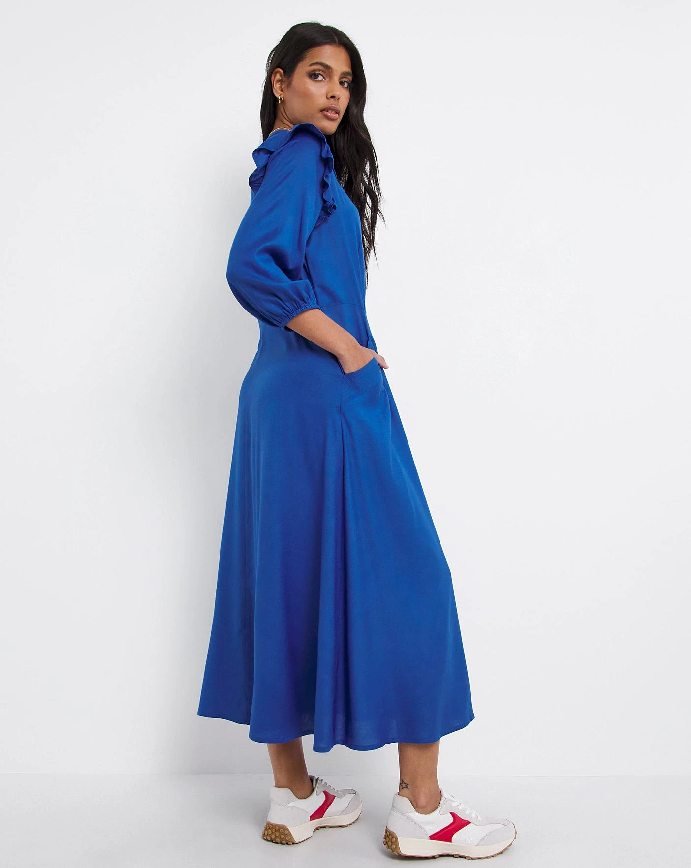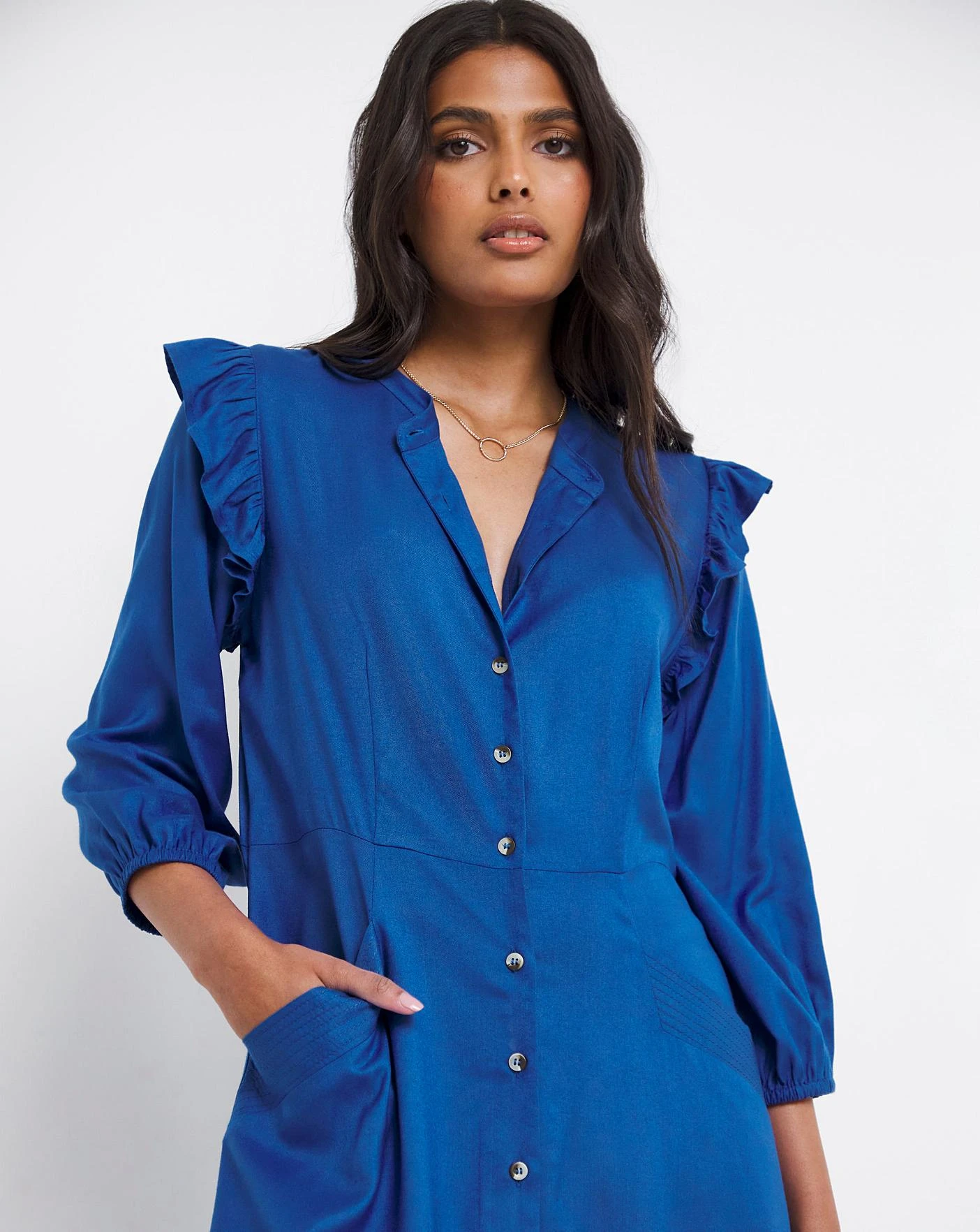 Update your wardrobe with this smart casual Viscose shirt dress. The flattering silhouette features a button down front, frill shoulders and topstitch detail to the front pockets. This easy versatile midi dress is perfect for everyday styling.