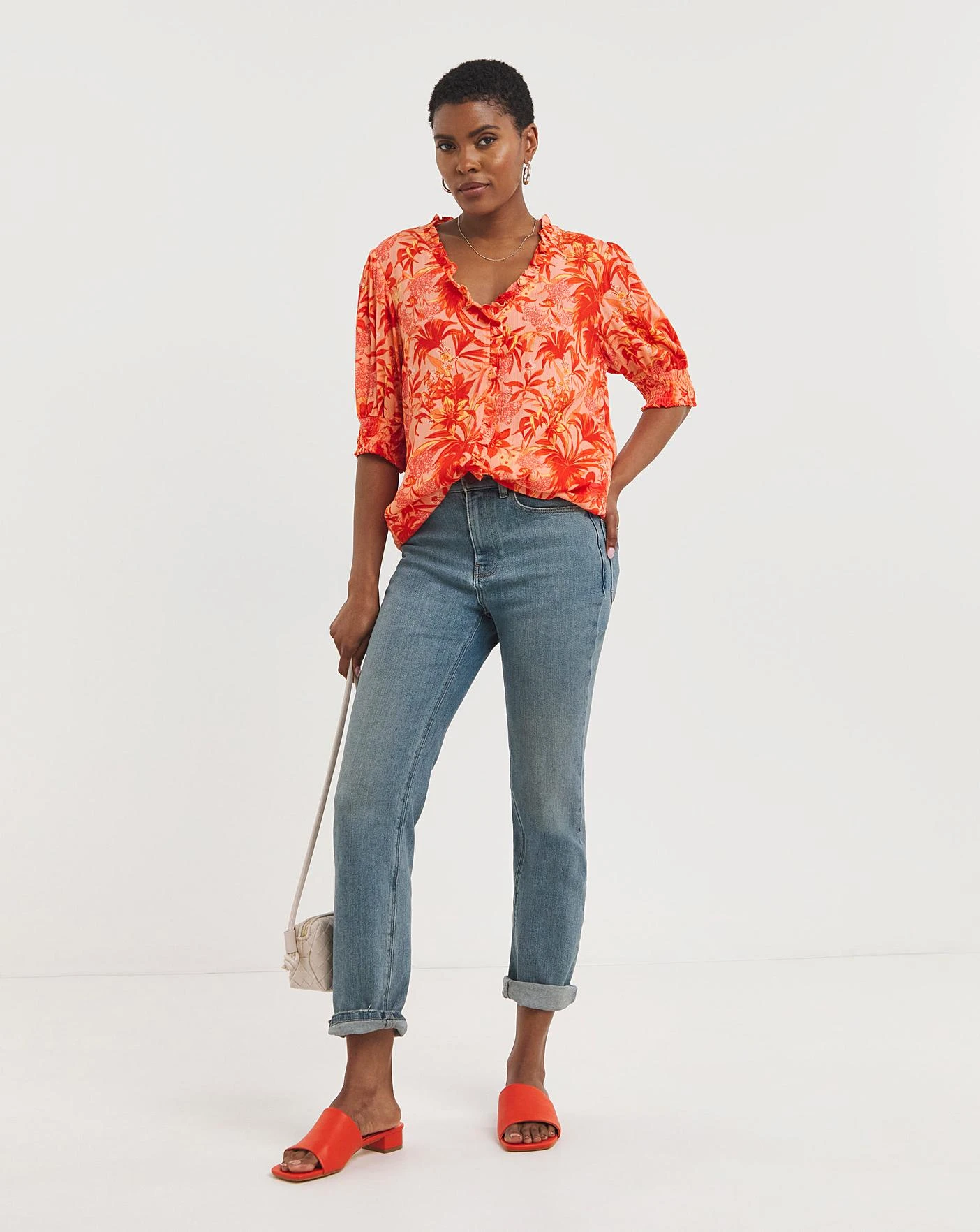 Featuring a v neckline and cuffed sleeves, our crinkle frill trim top can be paired easily with jeans or shorts.