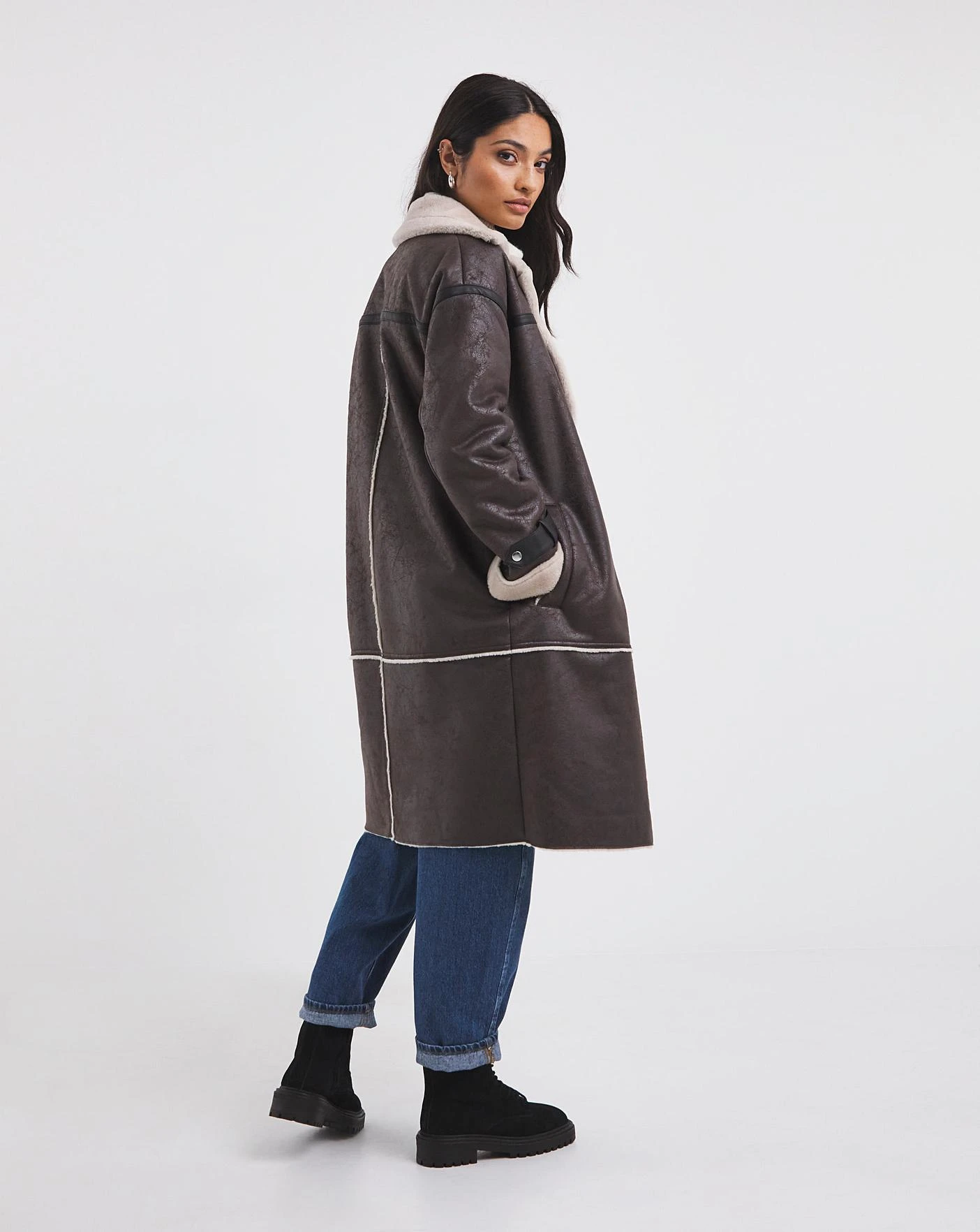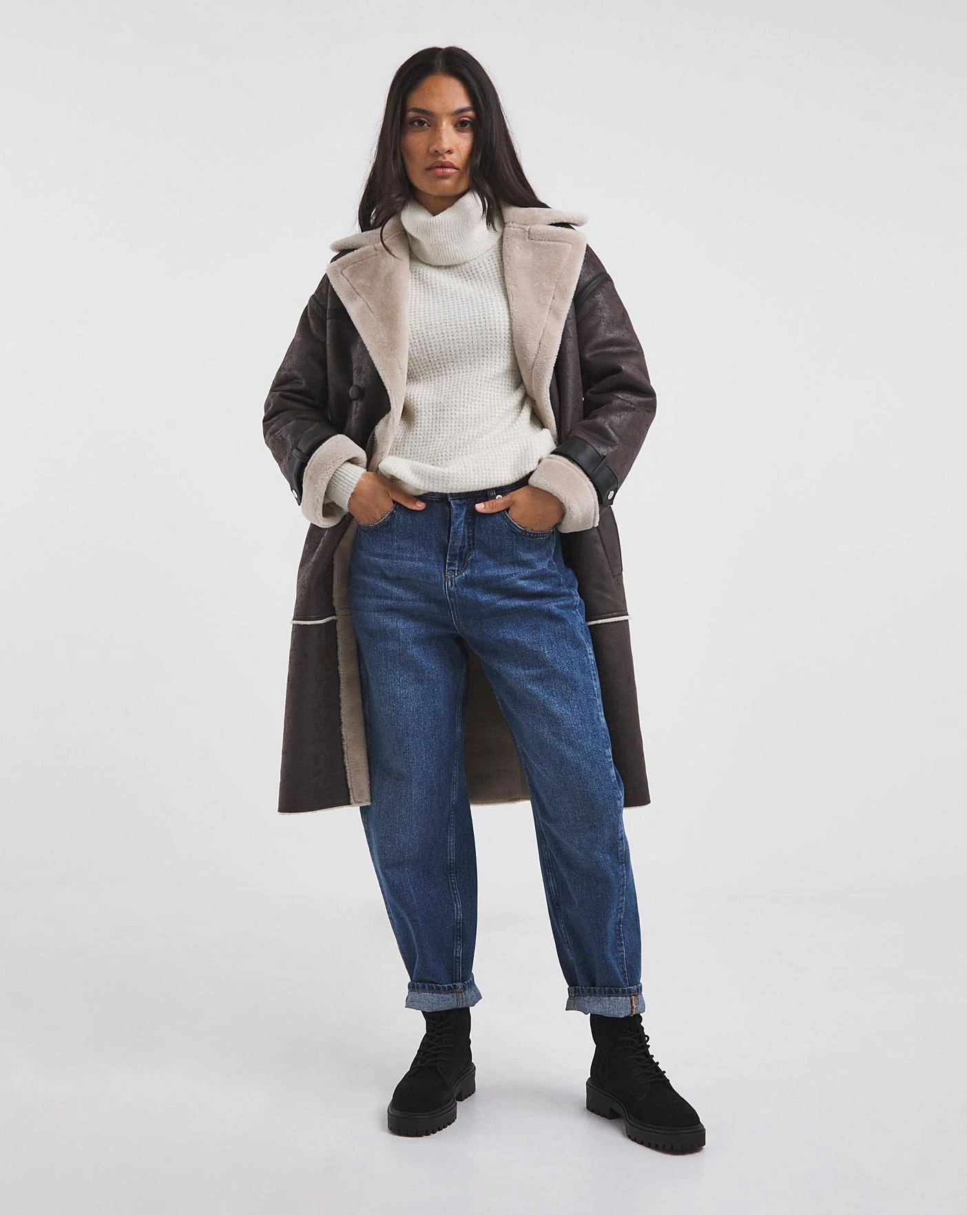 This gorgeous Longline Shearling Aviator is cosy and stylish, perfect for the colder months. Featuring a fur lining and fur trims, this jacket is guaranteed to keep you warm this Autumn/Winter. Try pairing with your favourite jeans and boots for a casual cosy winter look. Initial shedding may occur.