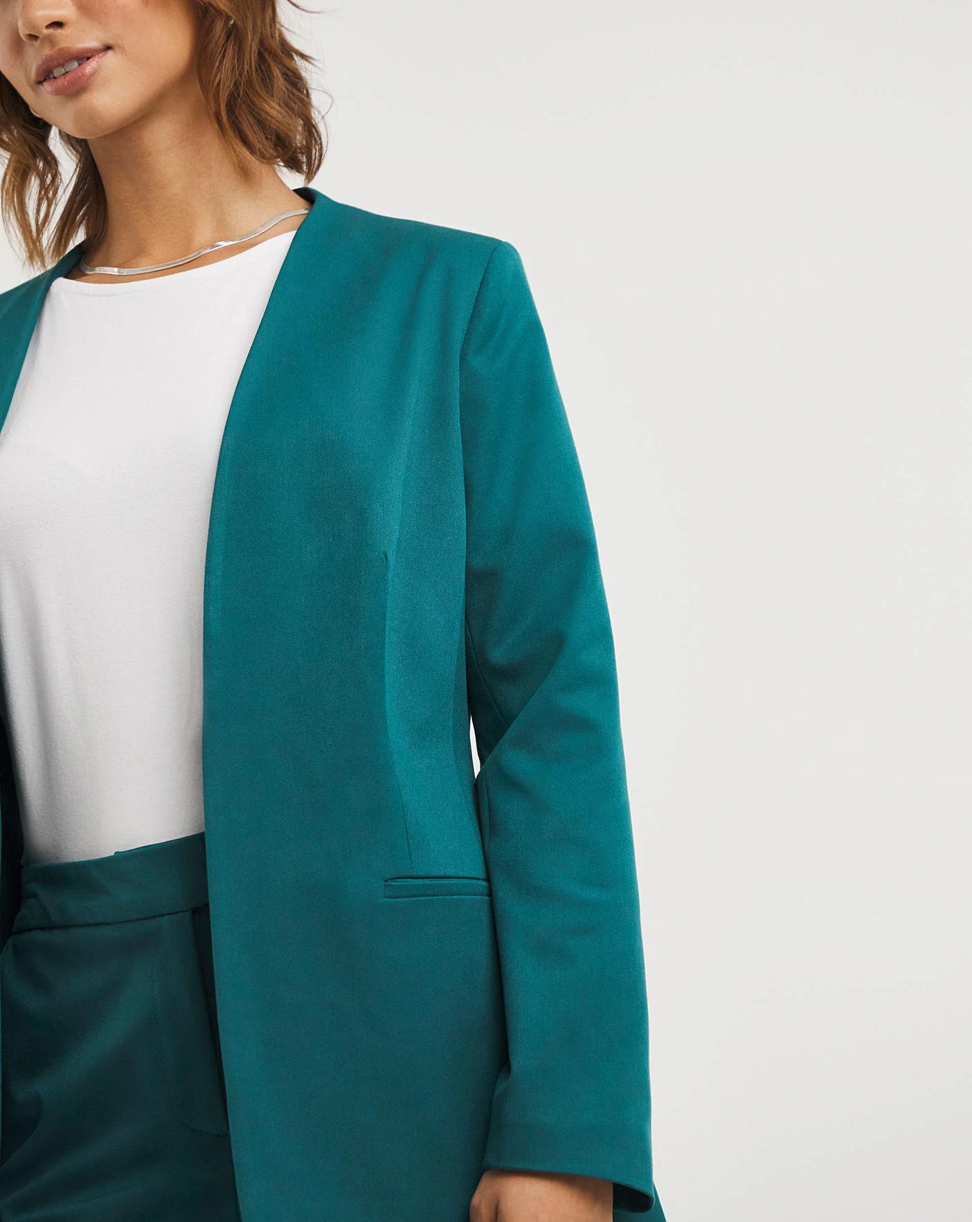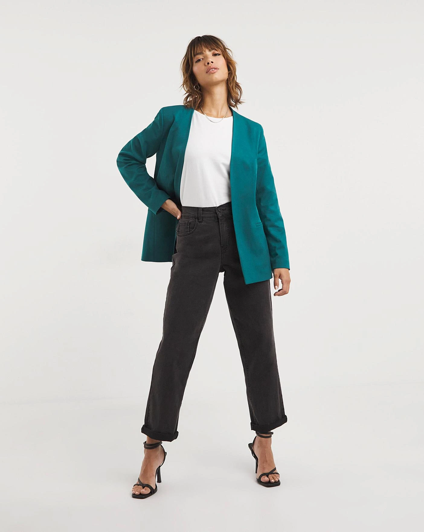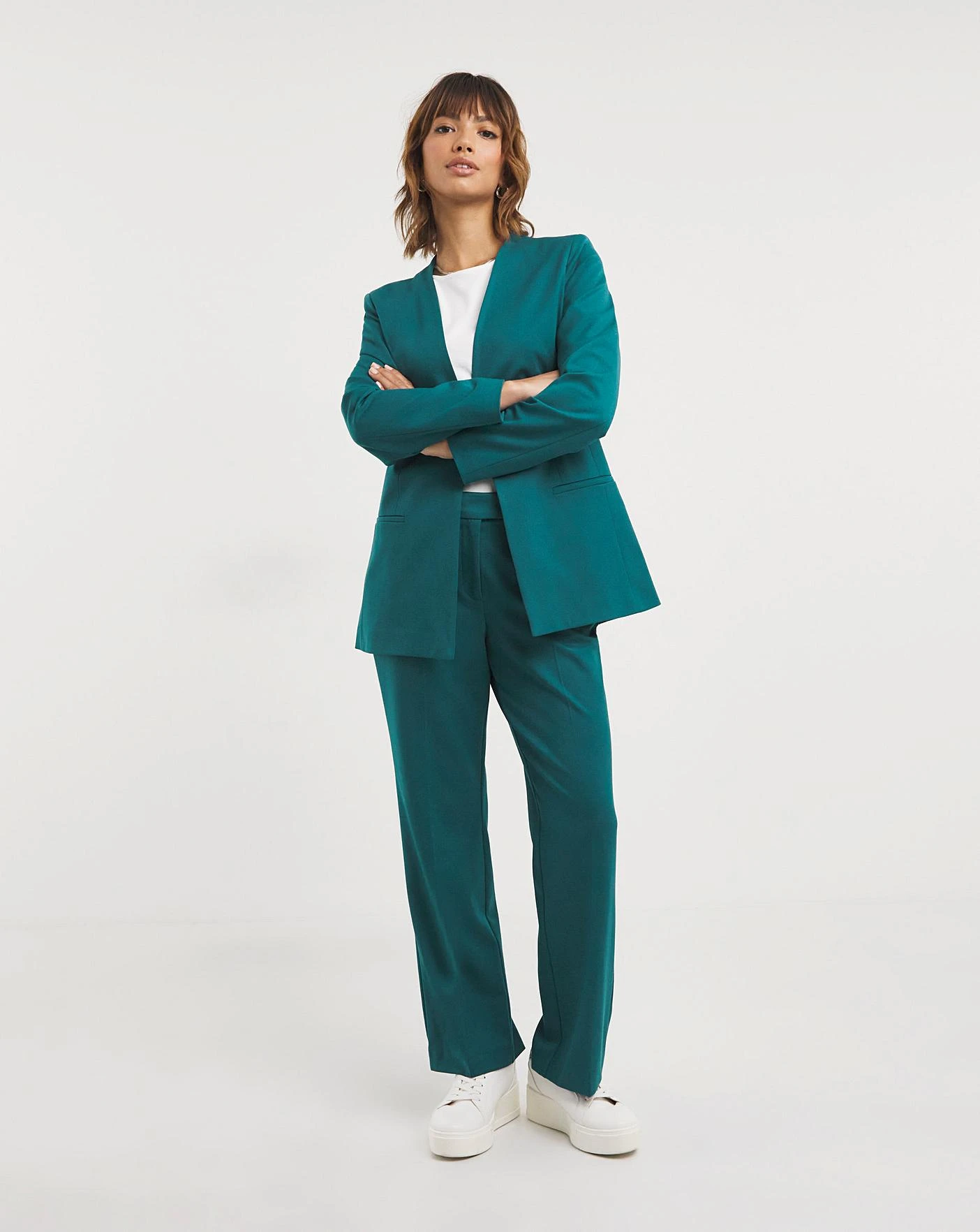 Cut to an elegant, collarless silhouette, this edge to edge blazer embraces day-to-night tailoring this season. In a Deep Teal, jewel tone this blazer features front jett pockets, seaming details to flatteringly shape the waist and is fully lined for additional comfort and structure. Pair back with the matching straight leg trousers for a tonal head to toe look or wear as a versatile separate back with your new season wardrobe.