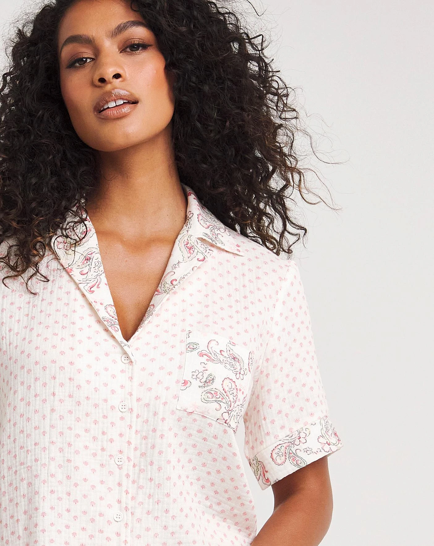 Brand New this season, this stunning shortie set is the perfect piece to help you keep cool and relaxed in the evenings. In a woven cotton fabrication, this set features a pink print with paisley trims and a super comfy elasticated waist.