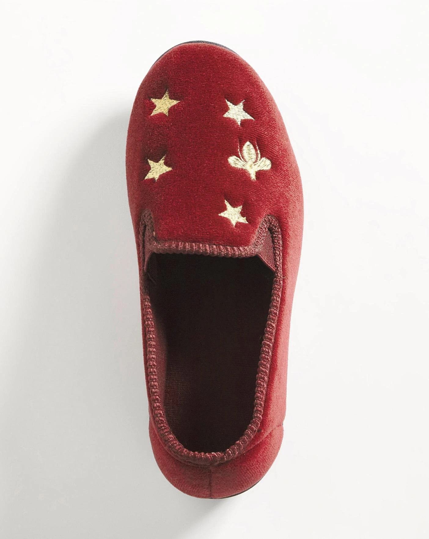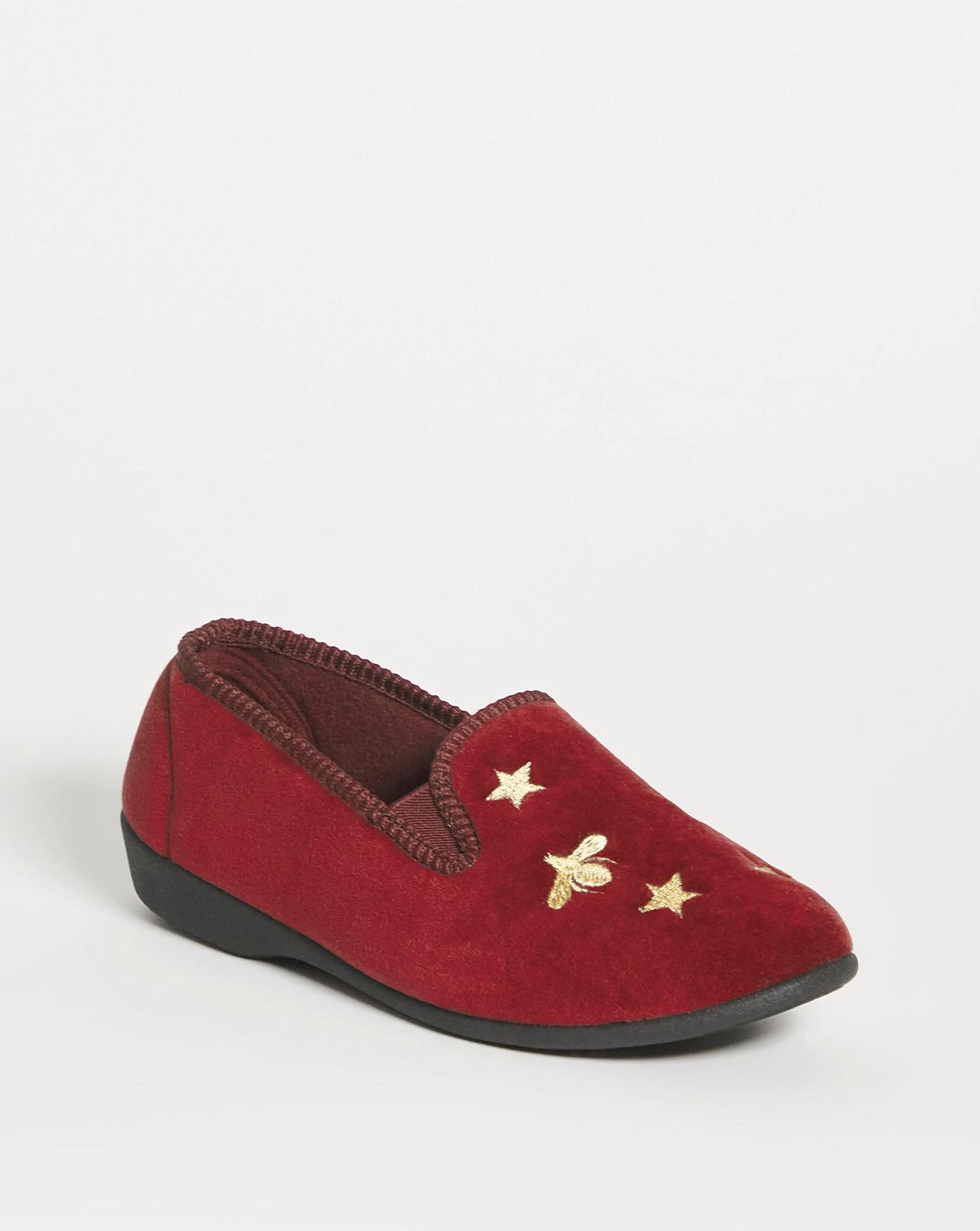 These embroidered slippers are soft to the touch and feature twin gussets to help slip them on and off.