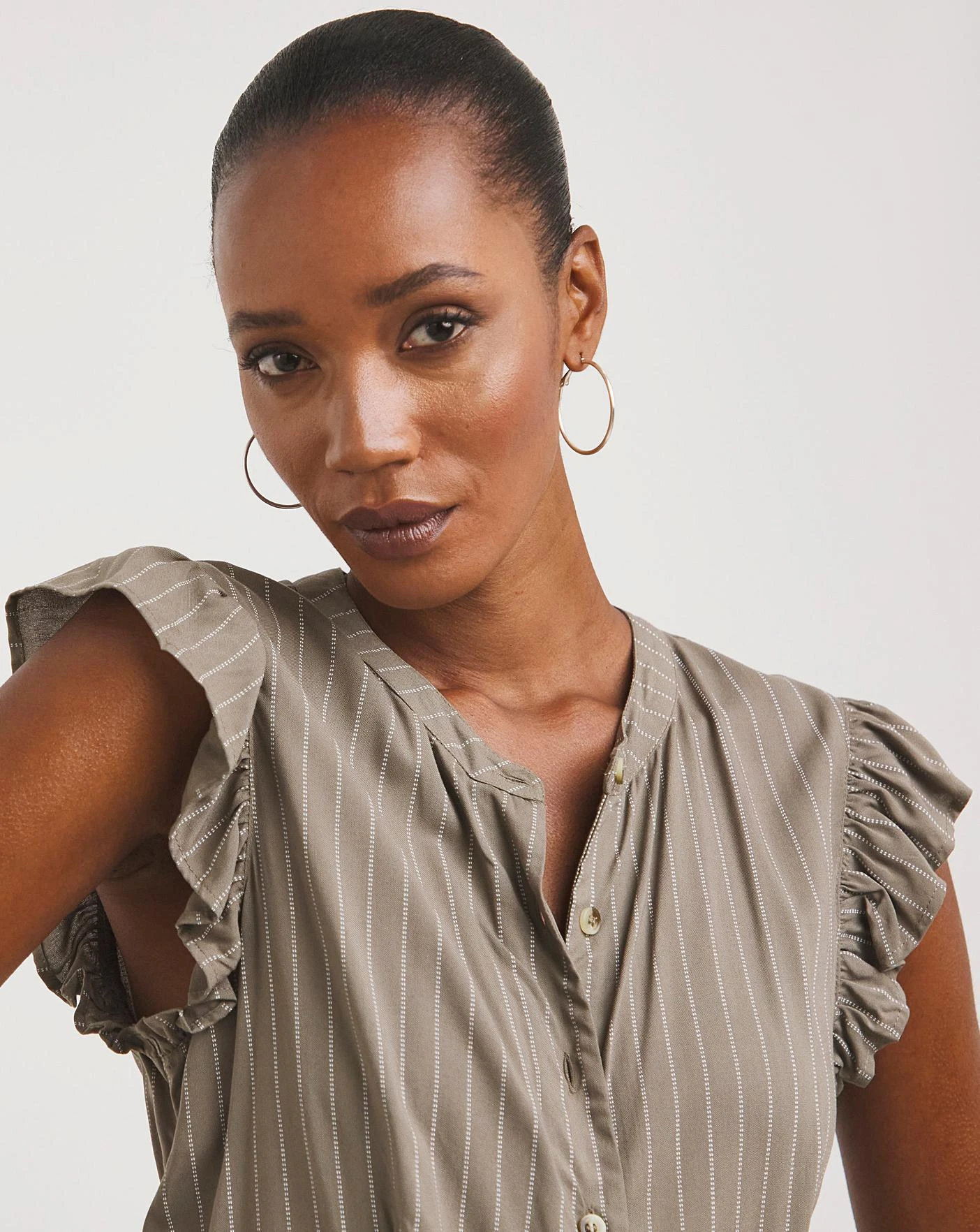 In a sophisticated taupe stripe, this dress is a our take on a classy summer shirt dress. Featuring frill detailing on the shoulder, a button down front, and two functional front pockets. Crafted from a super soft viscose fabrication. Pair with a chunky black sandal for a casual look.