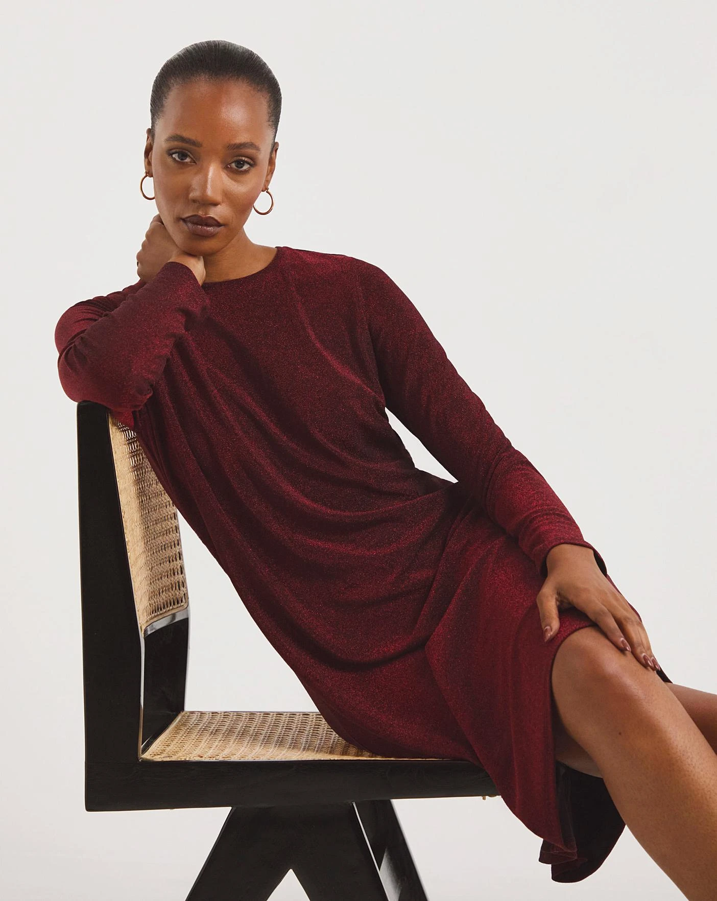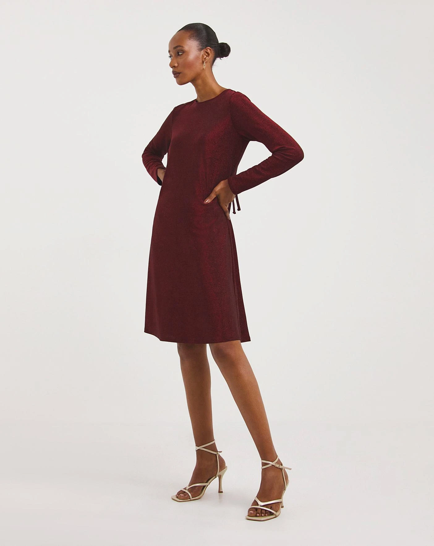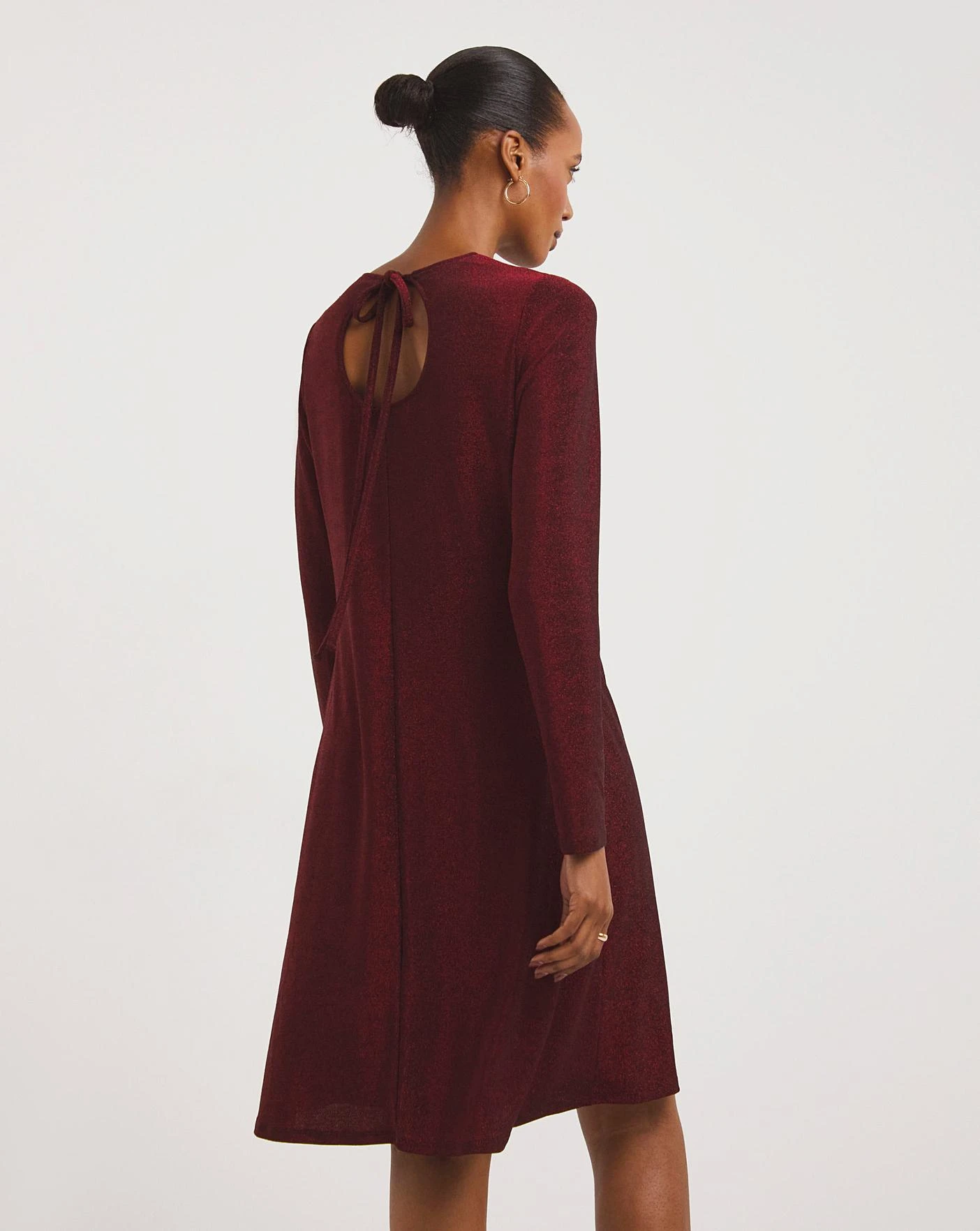 Shine bright in this party piece. Designed using a red glitter fabric, this dress is perfect for any party occasion which features a tie up neckline on the back and cut in a swing style shape to ensure comfort while you dance the night away.