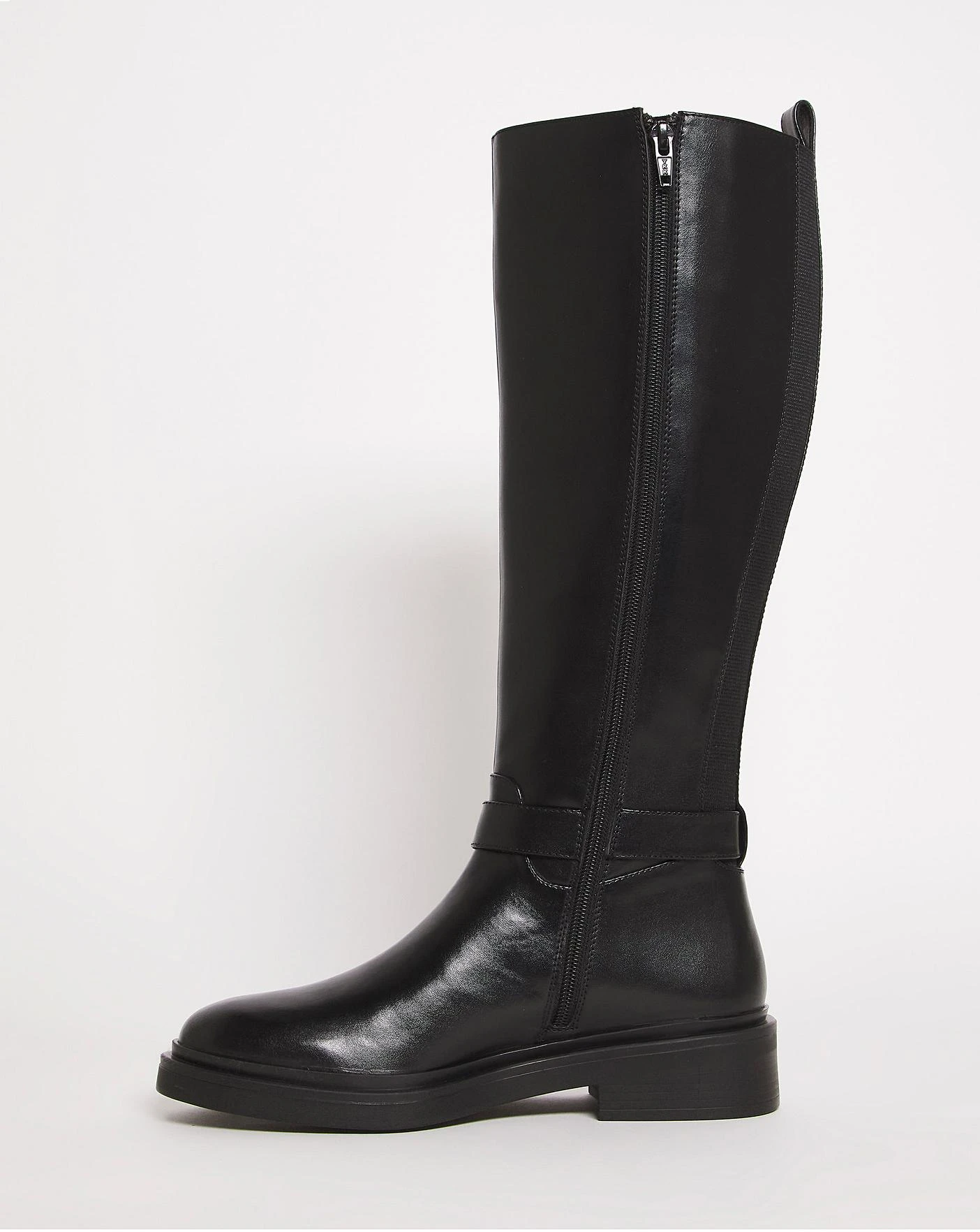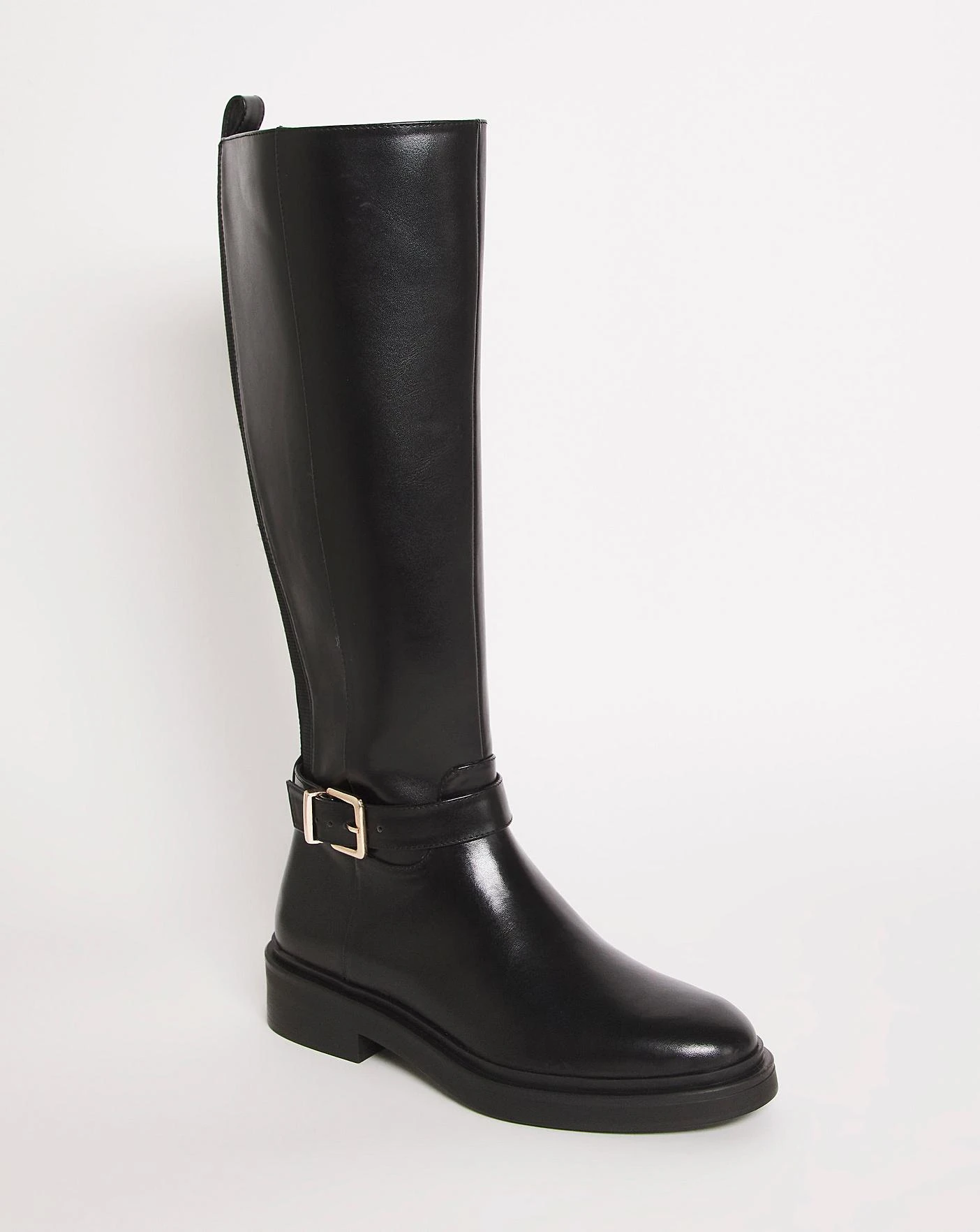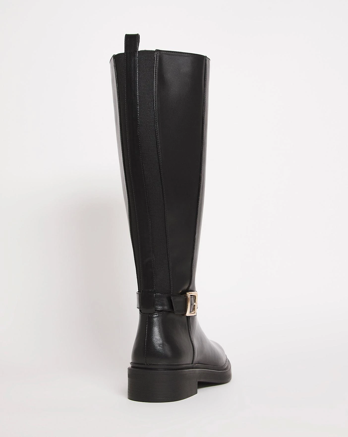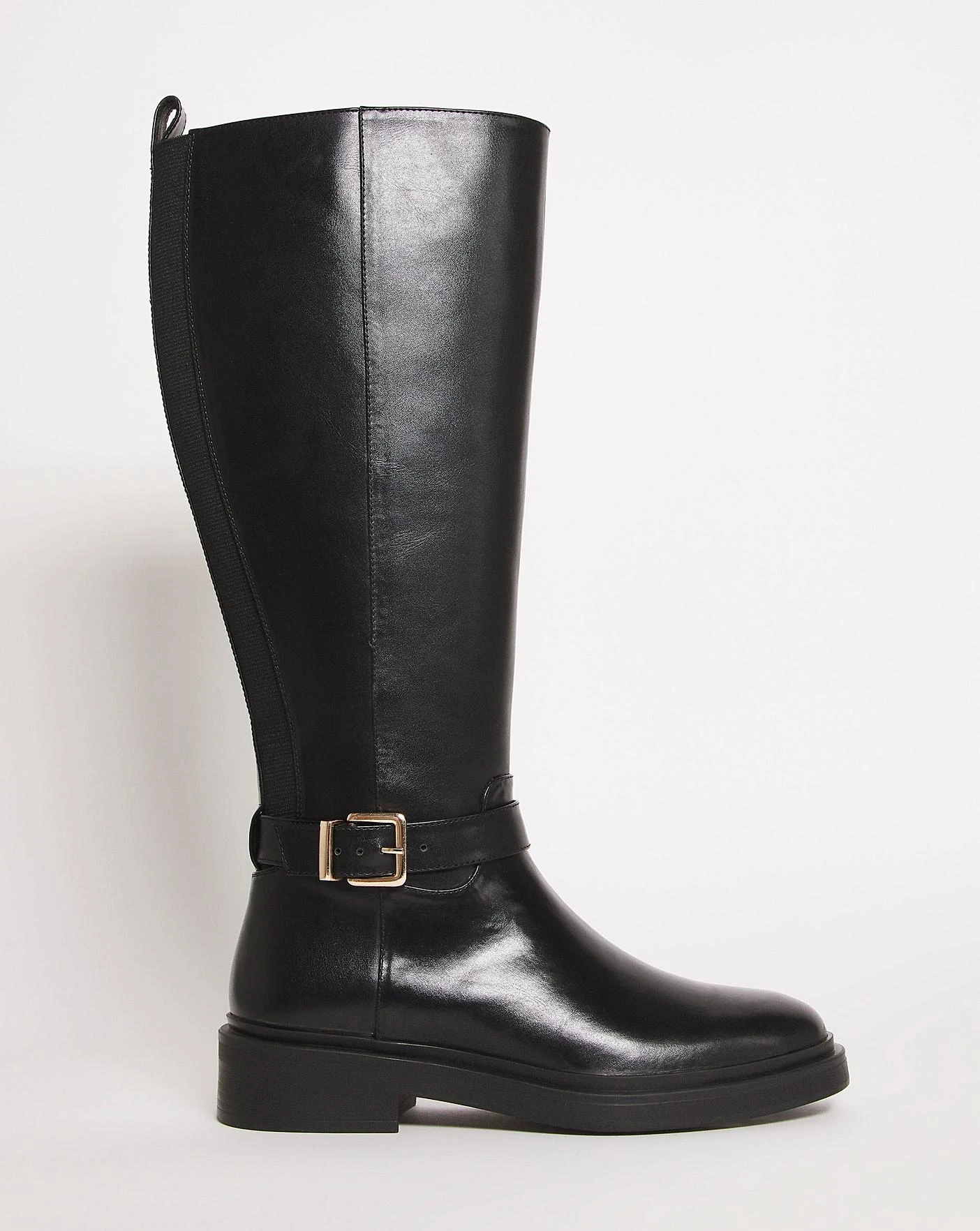This classic basic high leg boot is a must have this season. Designed for extra comfort with back elasticated panels with a side zip fastening and a buckle detail.
