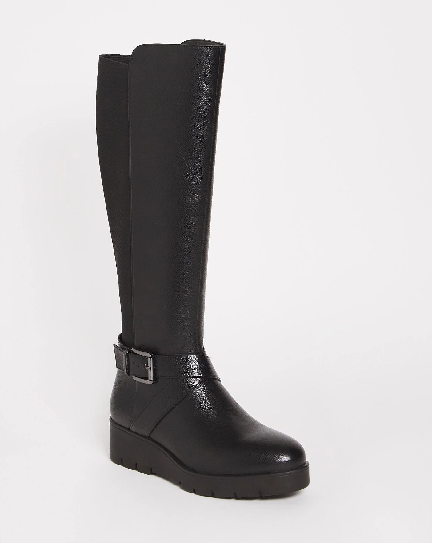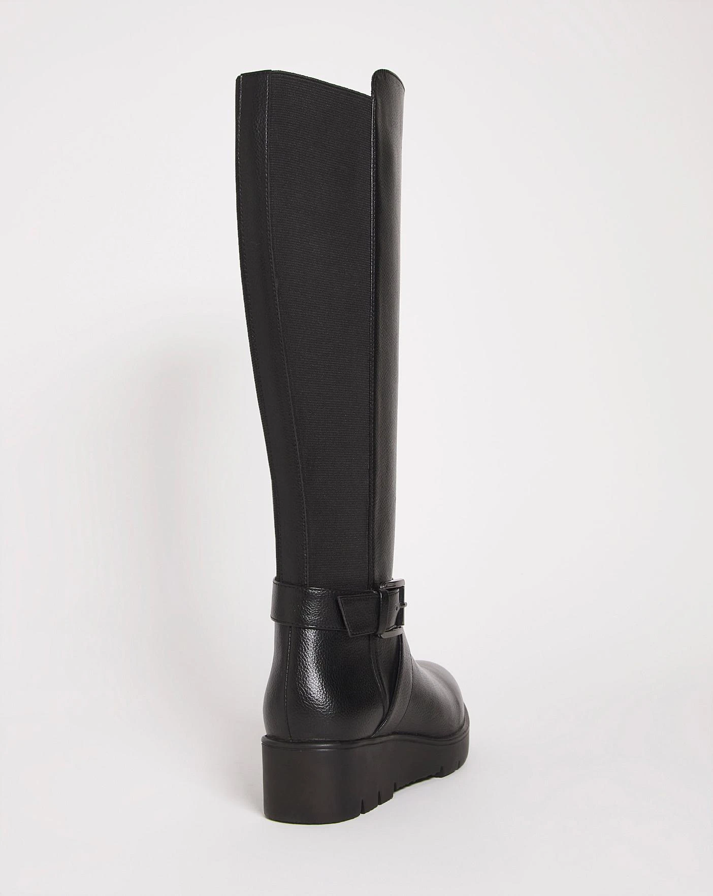 Elevate your outfit with our new high leg boots. Designed with elasticated back panel and a side zip for ultimate comfort and the wedge provides a subtle boost of height.