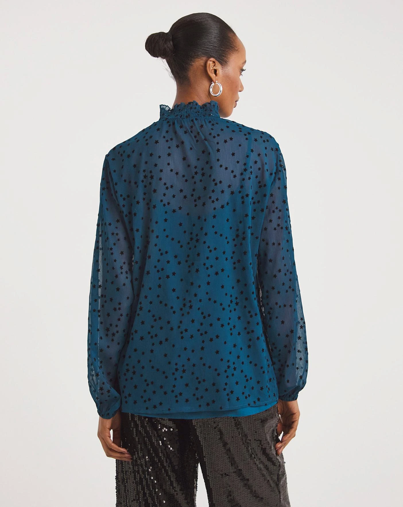 Feel glamourous in our high neck flocked top. In a flattering on trend print, pair this top with leather pants or a sequin trouser for a special occasion. This top comes in a relaxed fit so we would recommend sticking to your normal size. This top also comes with a cami.