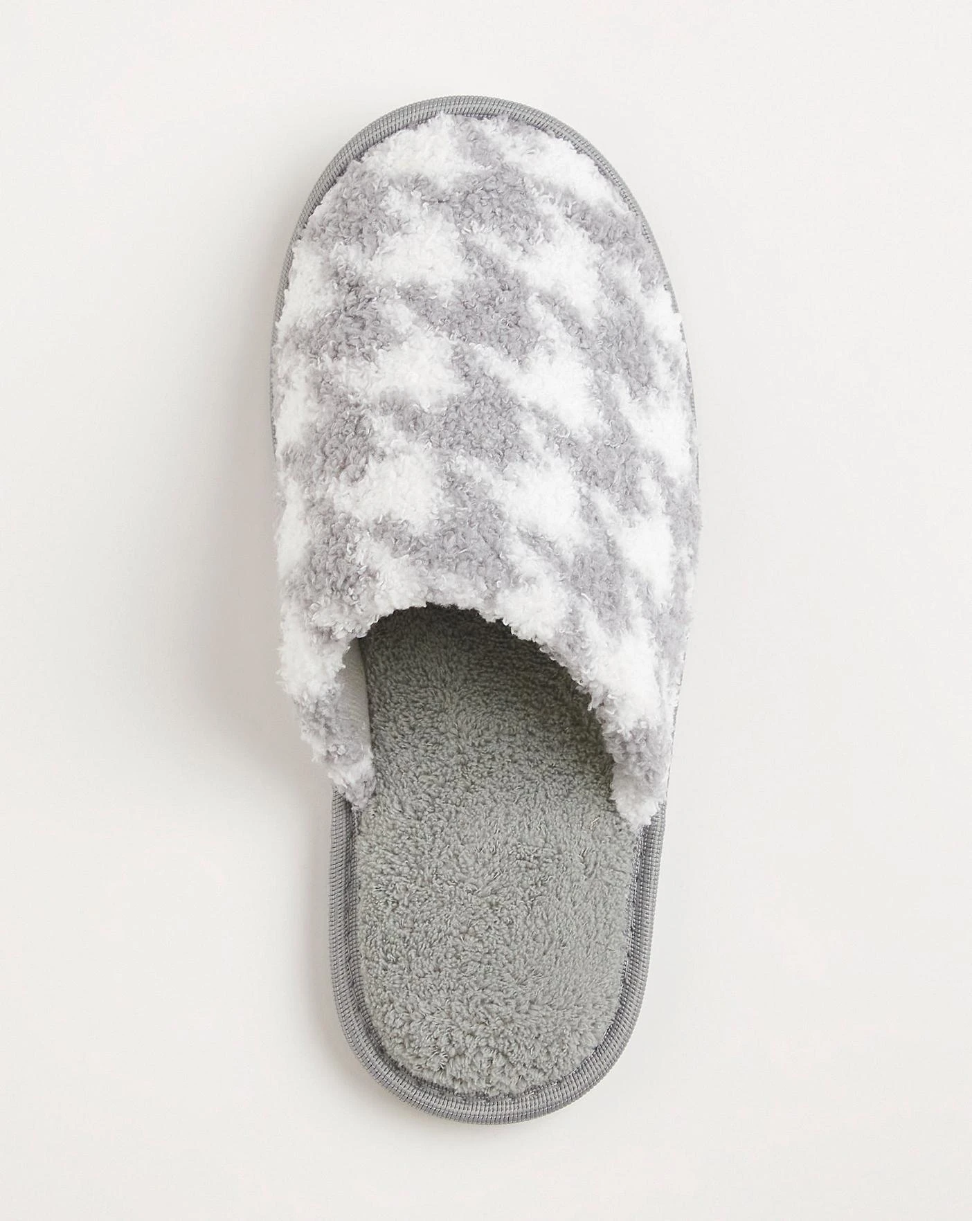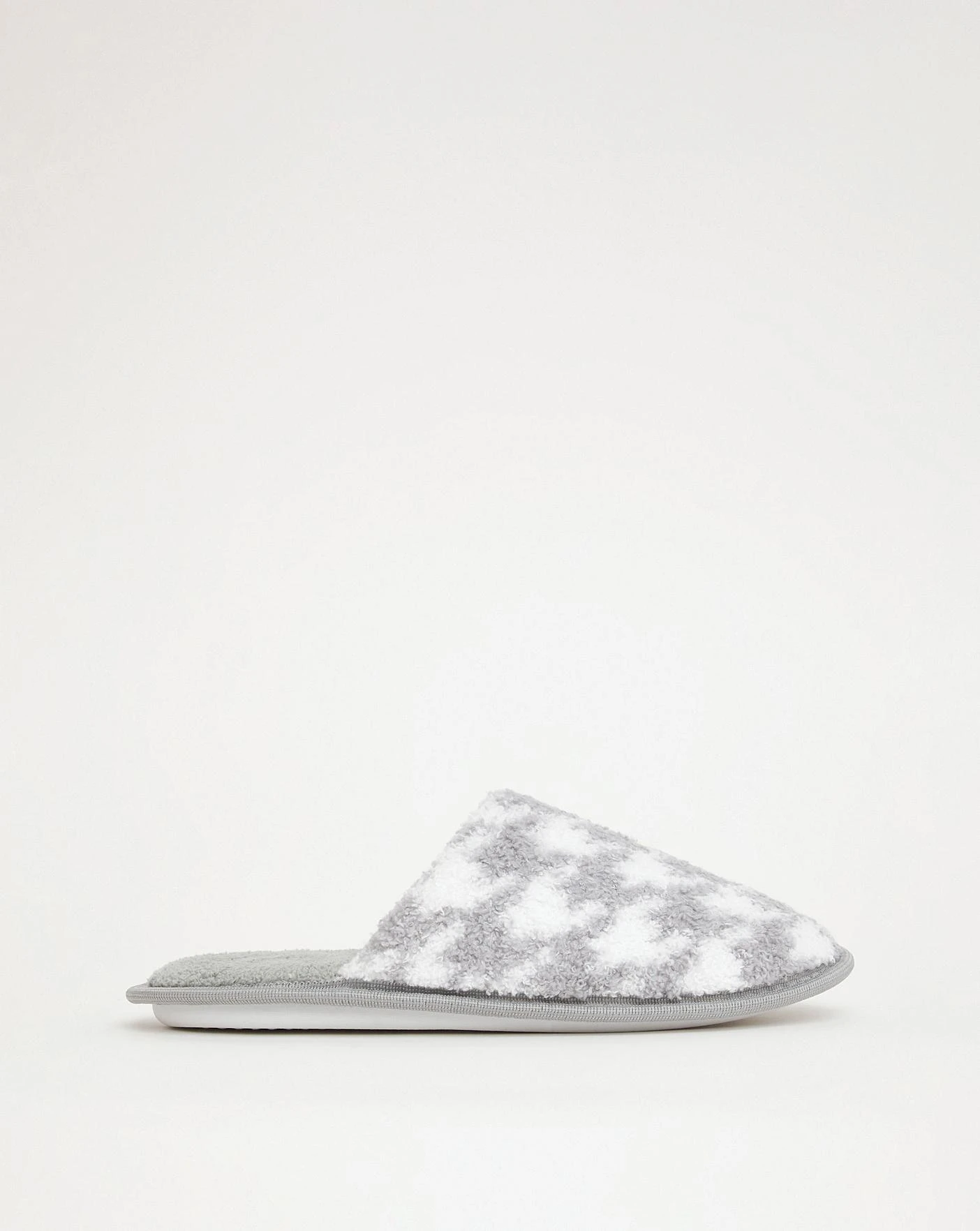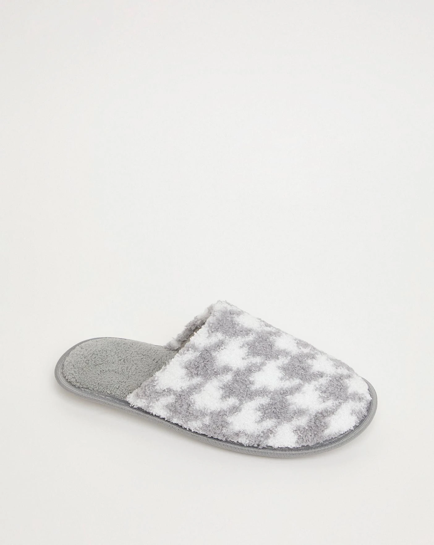 These classic mule slippers feature a soft upper in a dogtooth print, cushioned sock and plush lining.