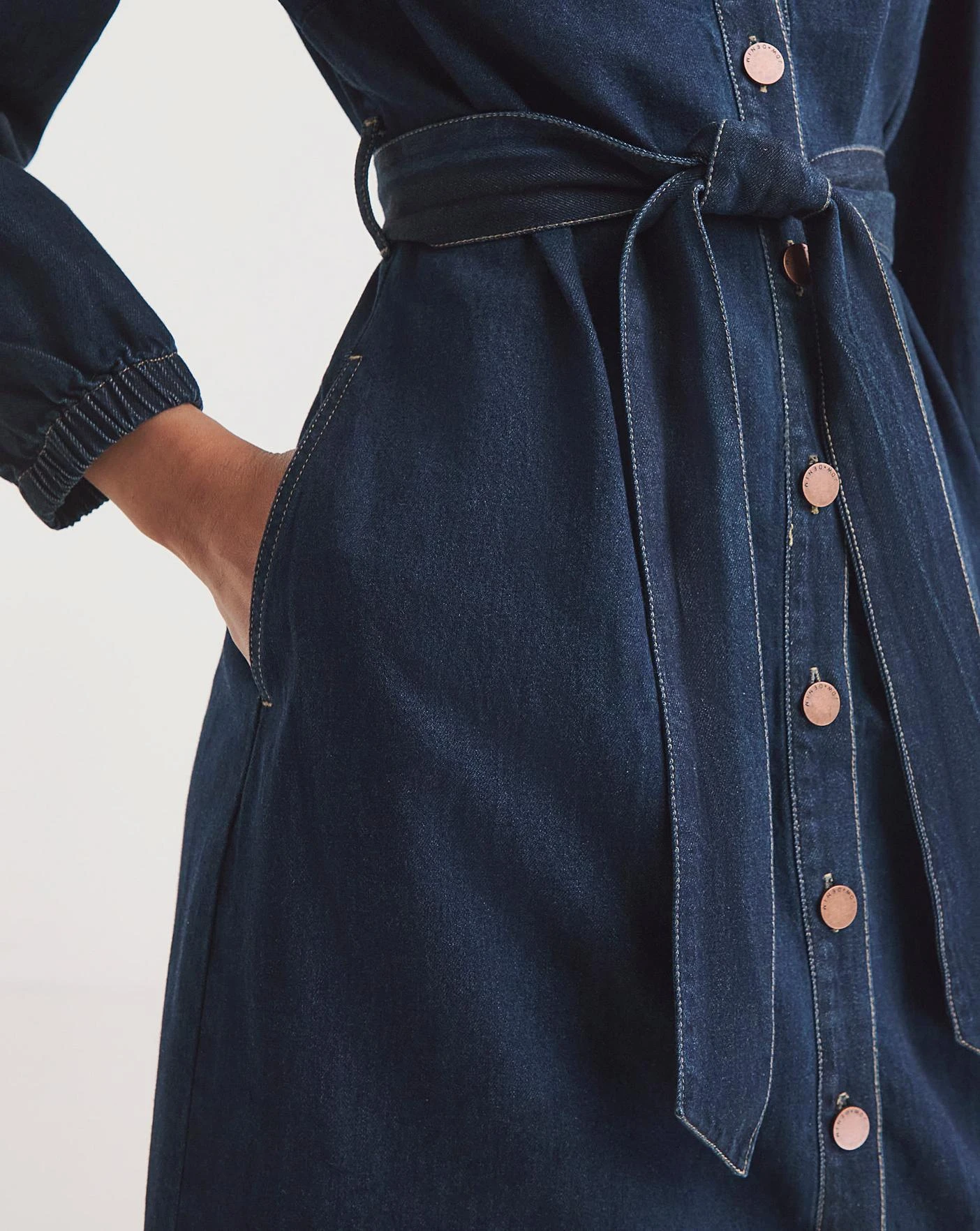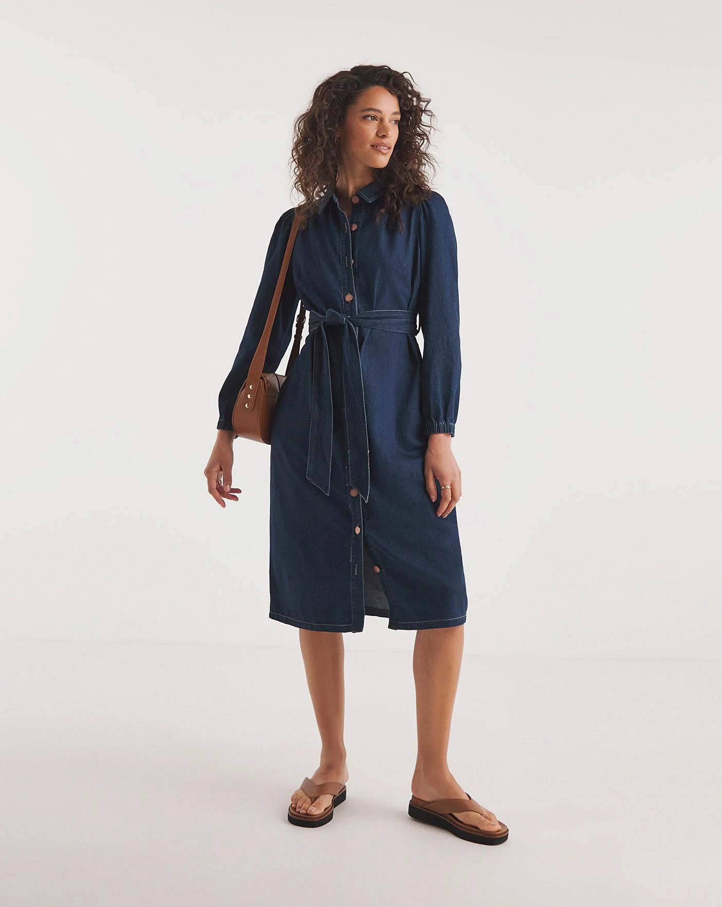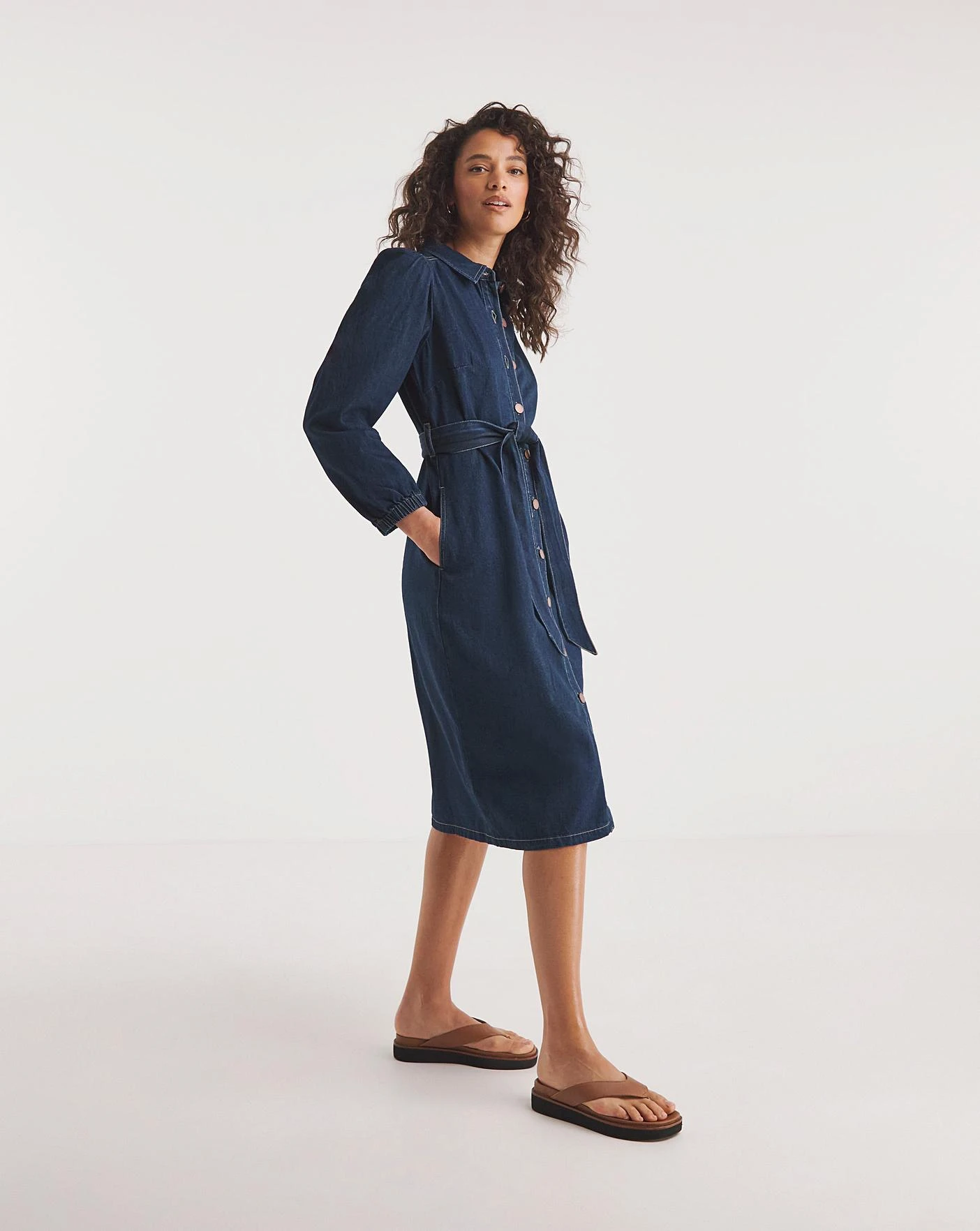 Made from ethically sourced cotton, our puff sleeve belted denim dress is elegant and perfect for any occasion. Featuring a midweight soft denim fabric, tie belt, button front and voluminous, puff sleeves. Dress up with a pair of heels or simply throw on boots for a timeless daytime look.