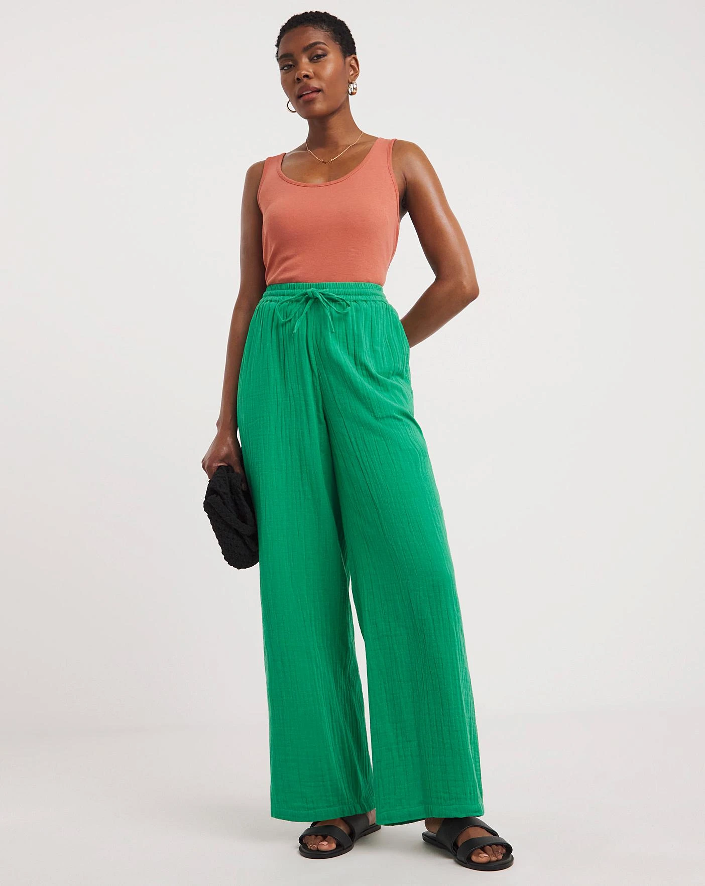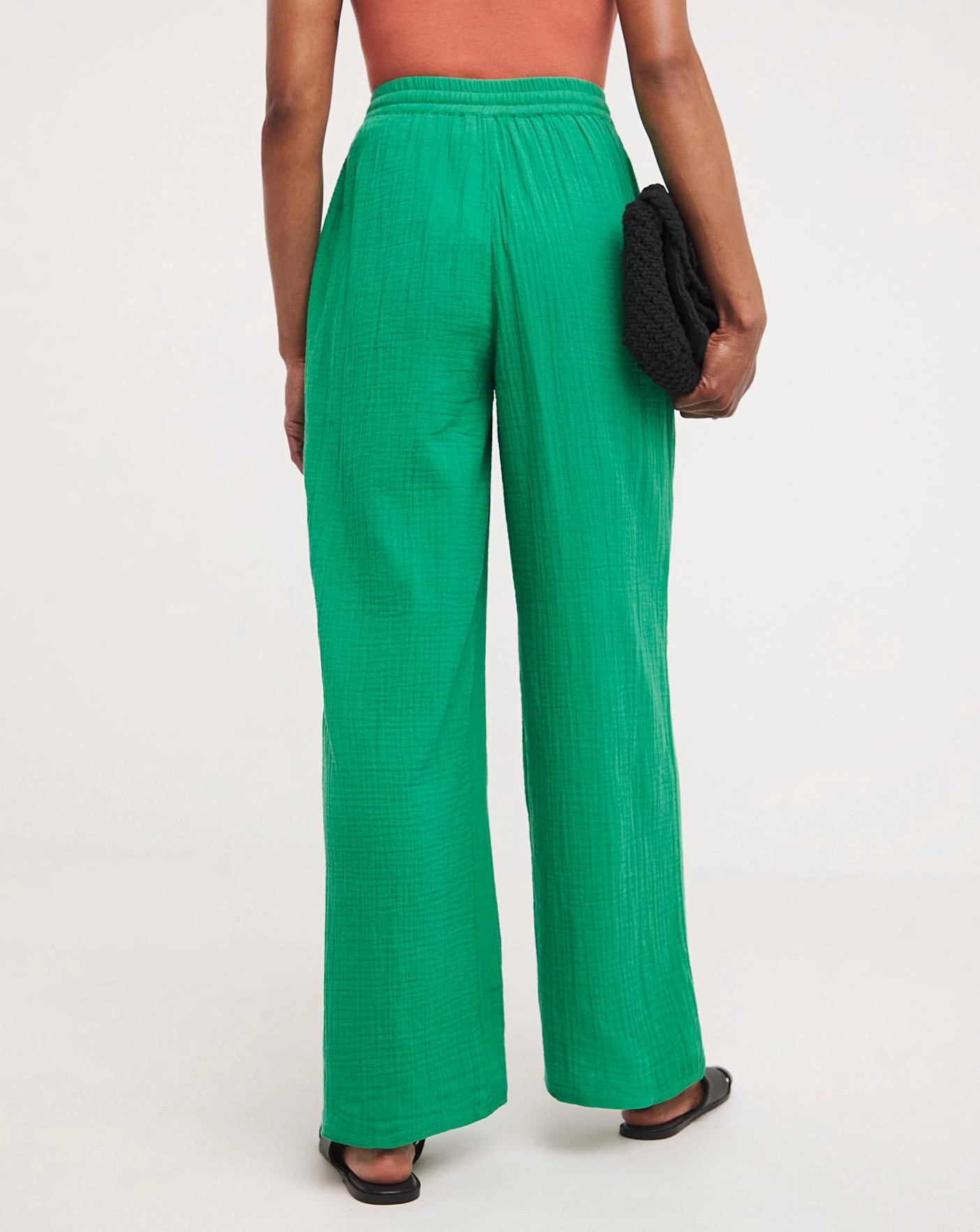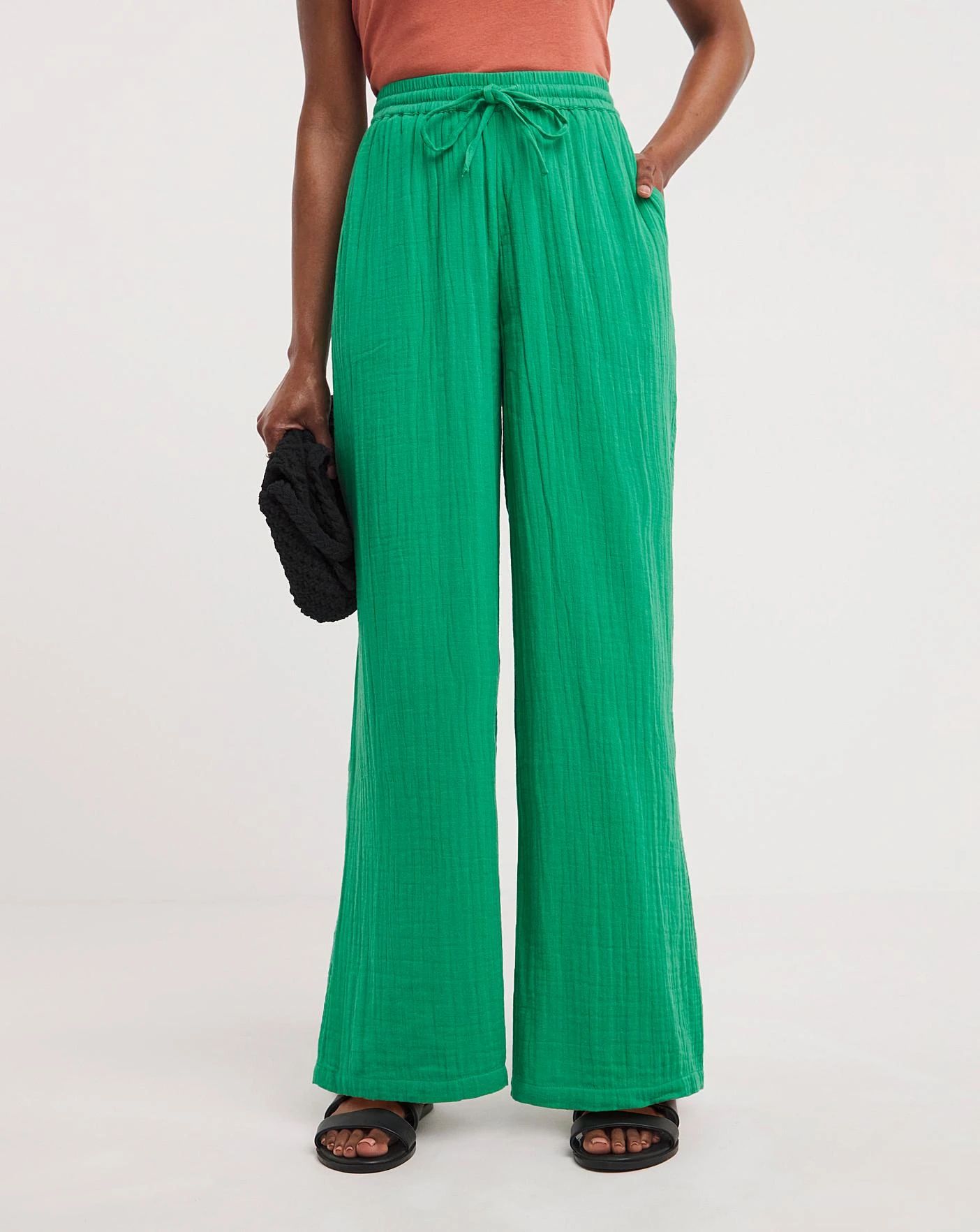 Our new double cloth cotton fabric is a wardrobe essential this season. The crinkle texture of the fabric means it doesn’t crease and is perfect for packing for your holidays. Lightweight and super easy to wear, these cheesecloth wide leg trousers are a wardrobe essential and can be paired back with any top for a summertime look. A pull on style with an elasticated waistband for additional comfort, these trousers are effortless, timeless and super stylish.