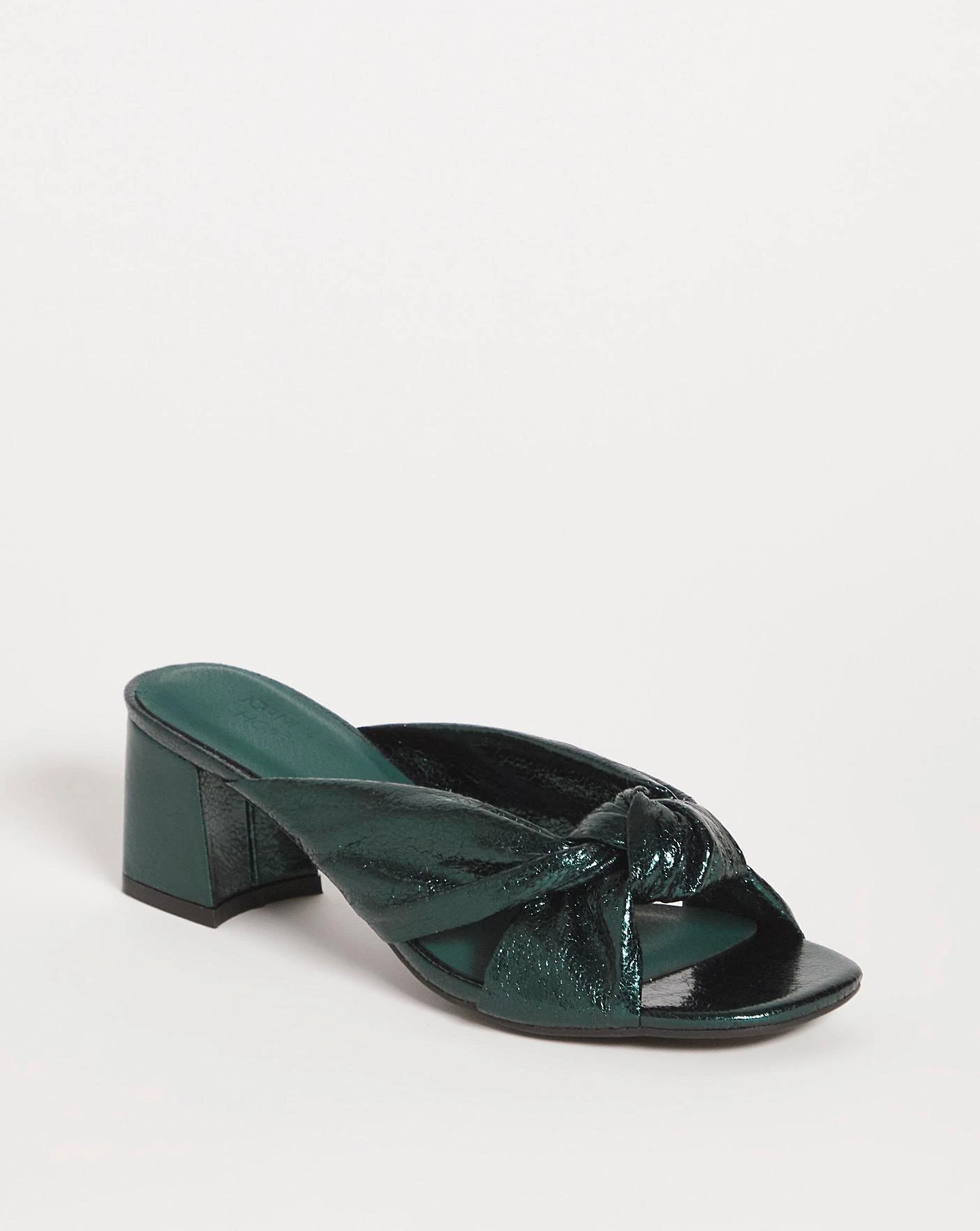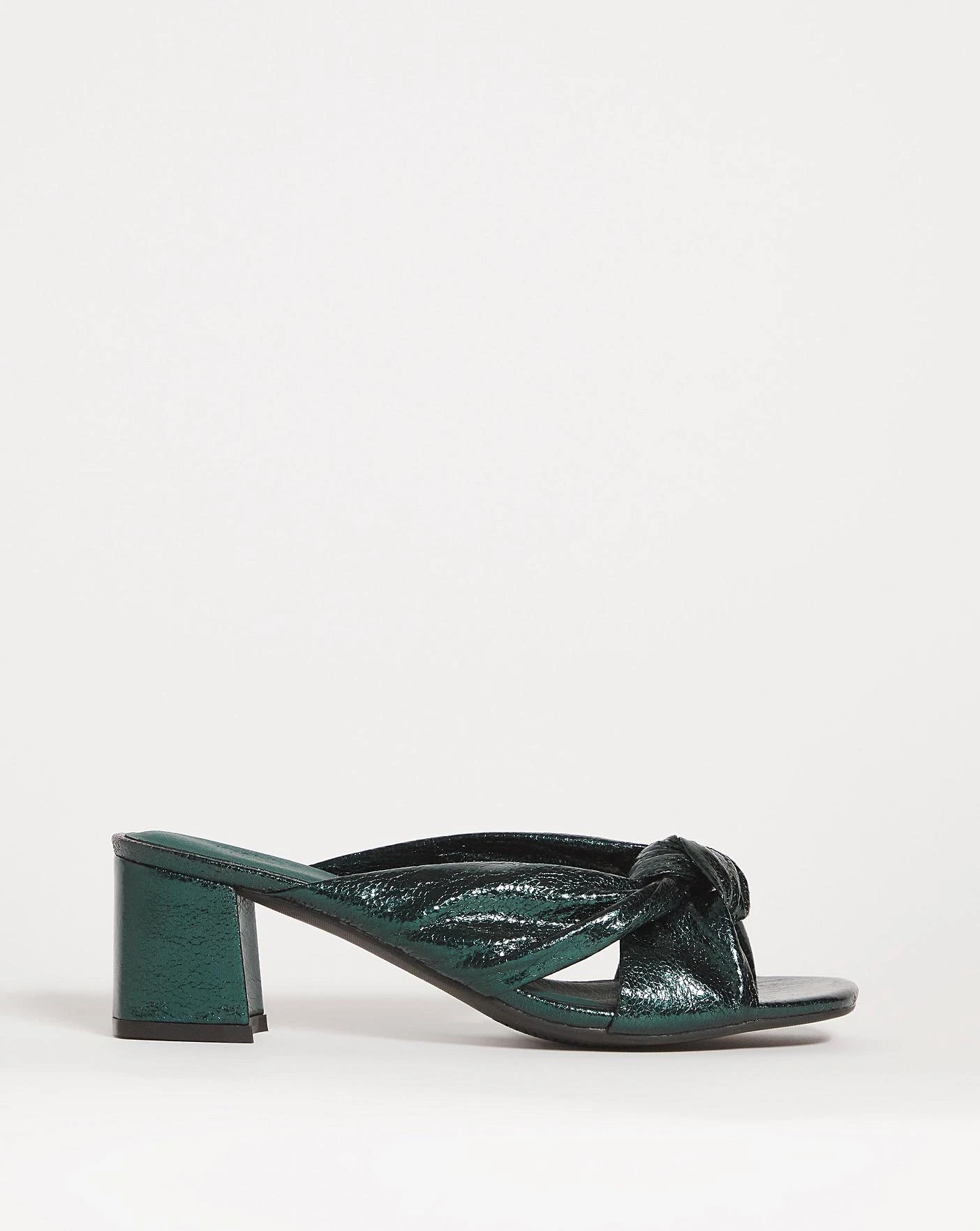 This stylish Joanna Hope heeled mule sandal features a metallic leather look upper with intricate top knot detail, medium stacked heel and easy slip on fit. Wear with denim or dresses.