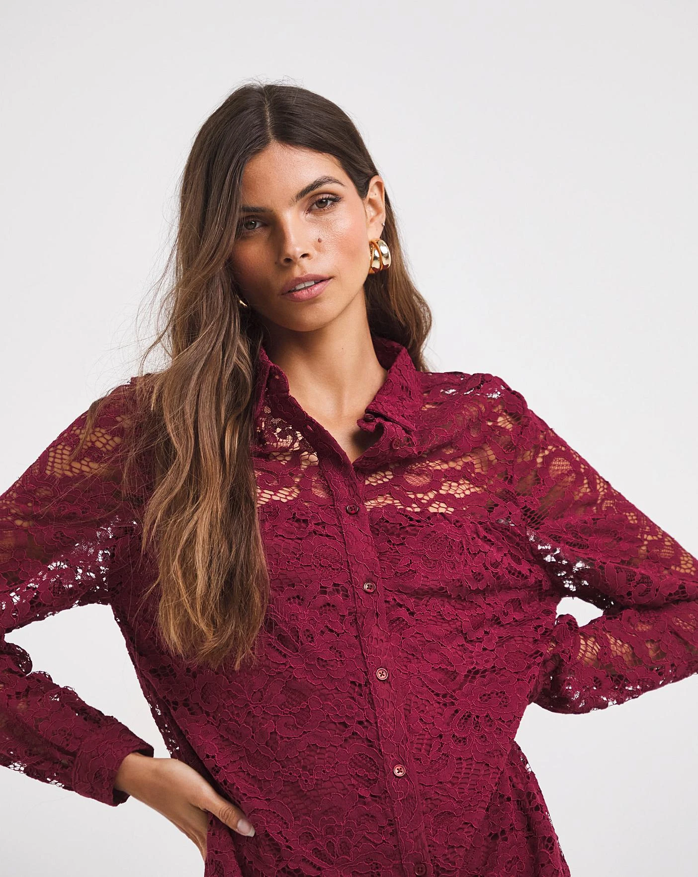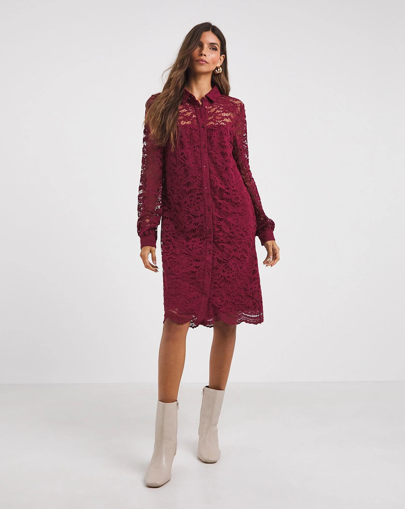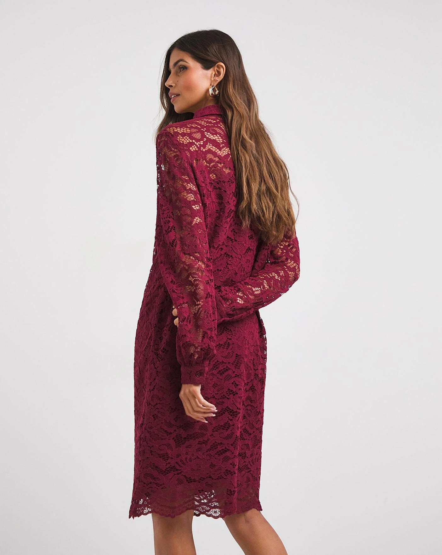 Jazz up your wardrobe with this refreshing burgundy lace shirt dress. This dress is cut to a relaxed fit making it perfect for day and night. Featuring a button-down front with long cuffed sleeves in a contemporary lace fabric.