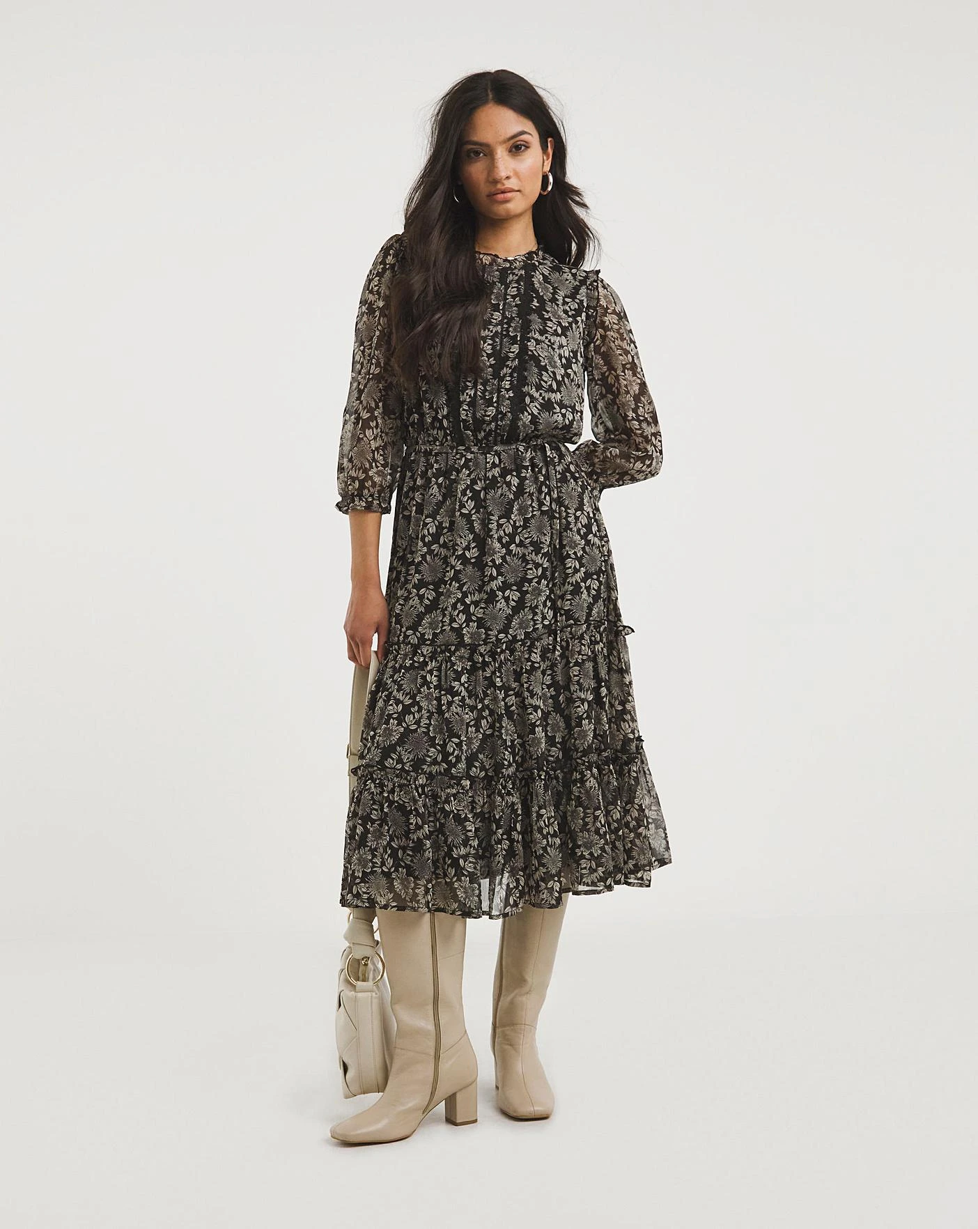 Made from recycled Polyester, dress to impress in our Lace Trim Waisted Tea Dress. On a romantic chiffon base, and in a contemporary mono floral print, this dress is full of design details. Featuring frill details on the sleeves, skirt and the neckline, black lace trims, and three quarter length sleeves. Falling at our midi length.
