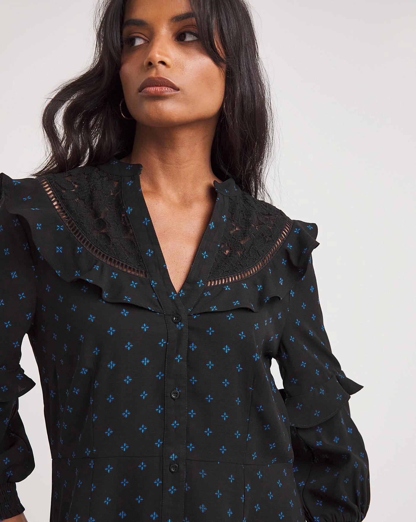 An essential staple for any day occasion, this blue print maxi dress features an elegant yoke lace adding feminine detailing. The flattering long sleeve dress has a statement sweeping skirt and frill trims to add extra unique detail to a beautifully designed dress.