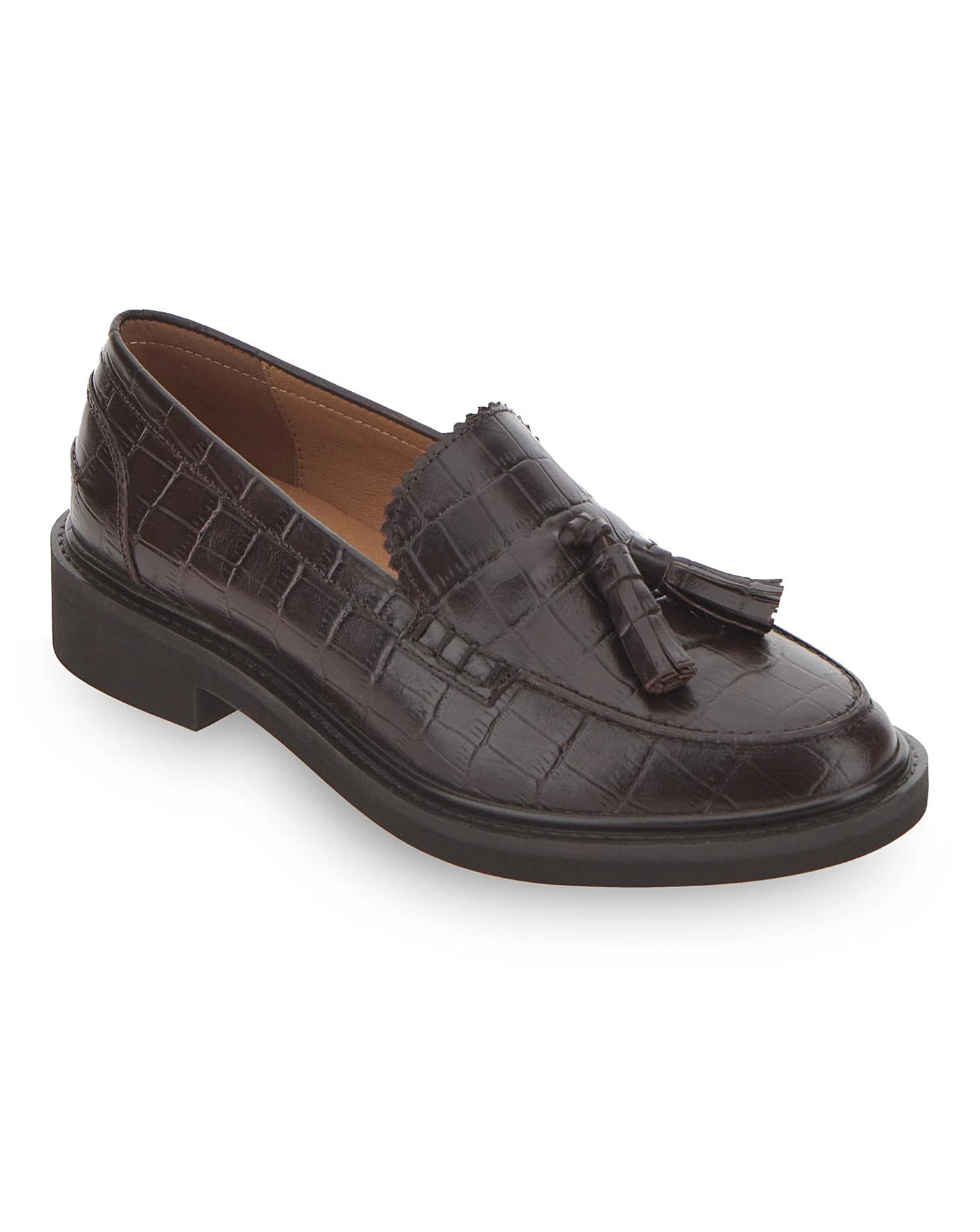 A traditional style that works in every womens wardrobe. the Tassel Loafer. This version features a croc print real leather upper, tassel detail and lighweight sole. Wear with denim or dresses for a casual look.
