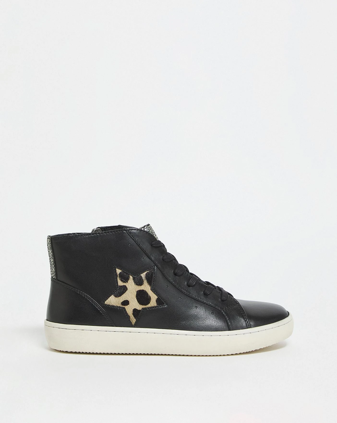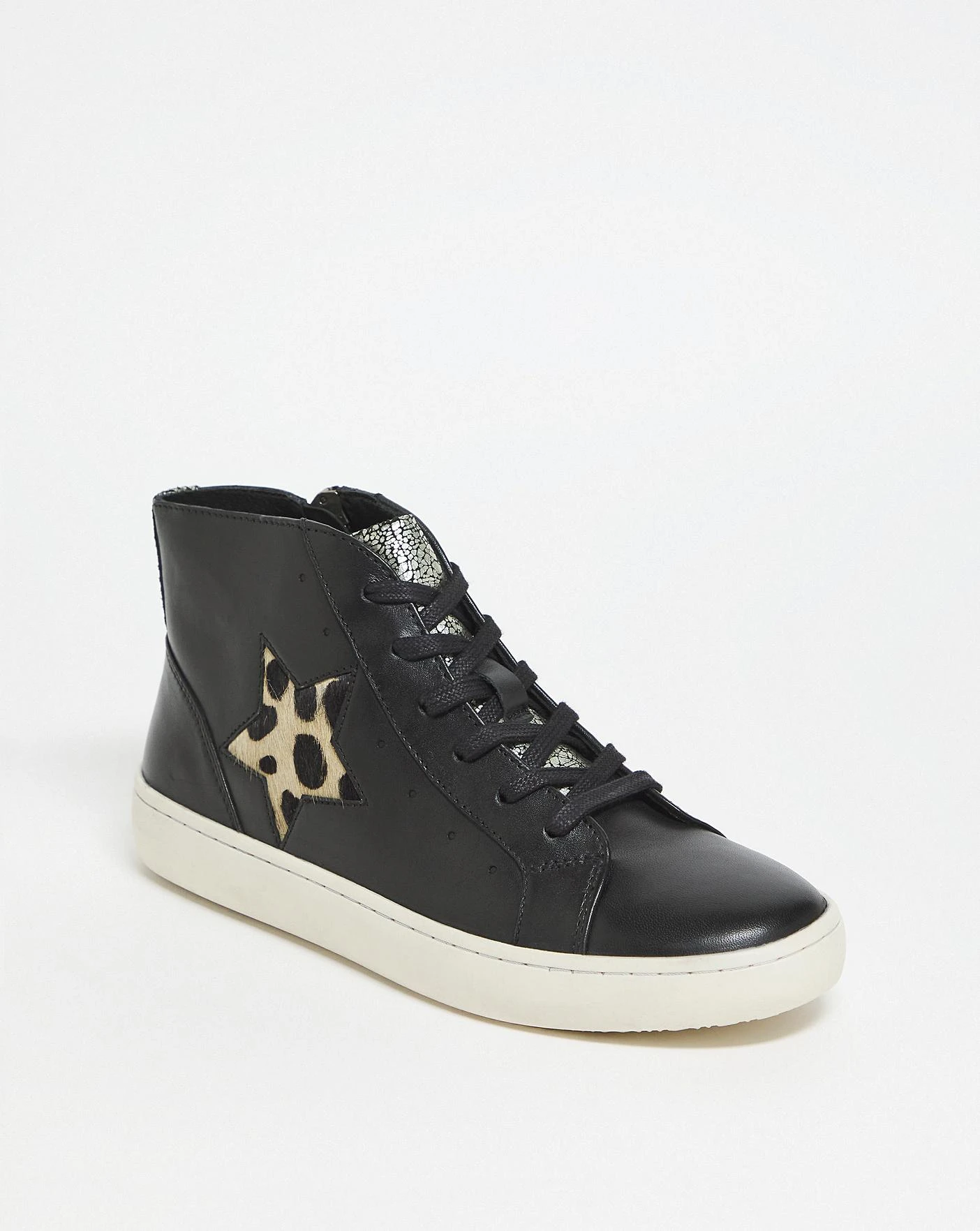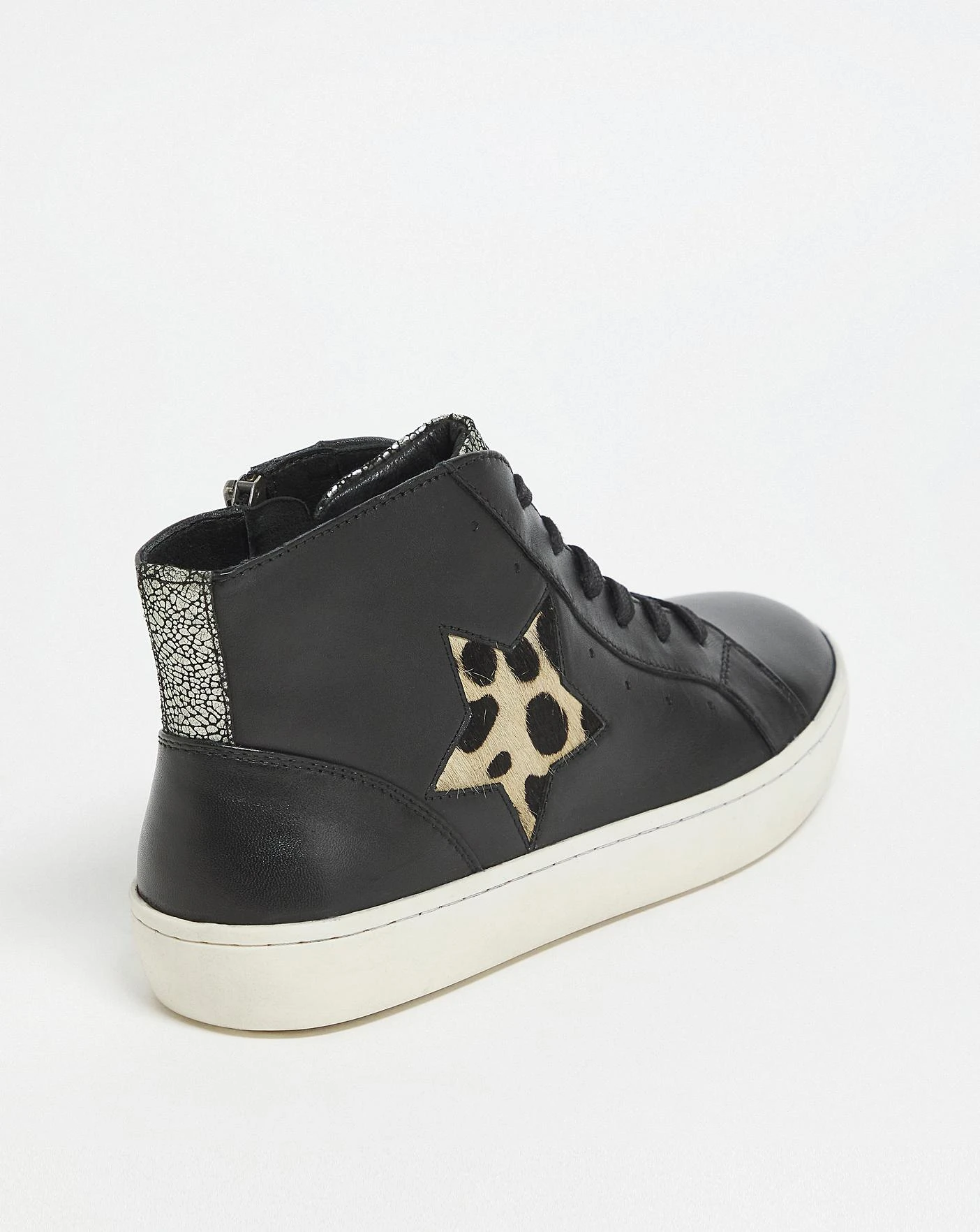These contemporary distressed leather star hi top trainers are a must have! Detailed with mixed materials and metallic colouring, pair these with your favourite denim for an elevated look.