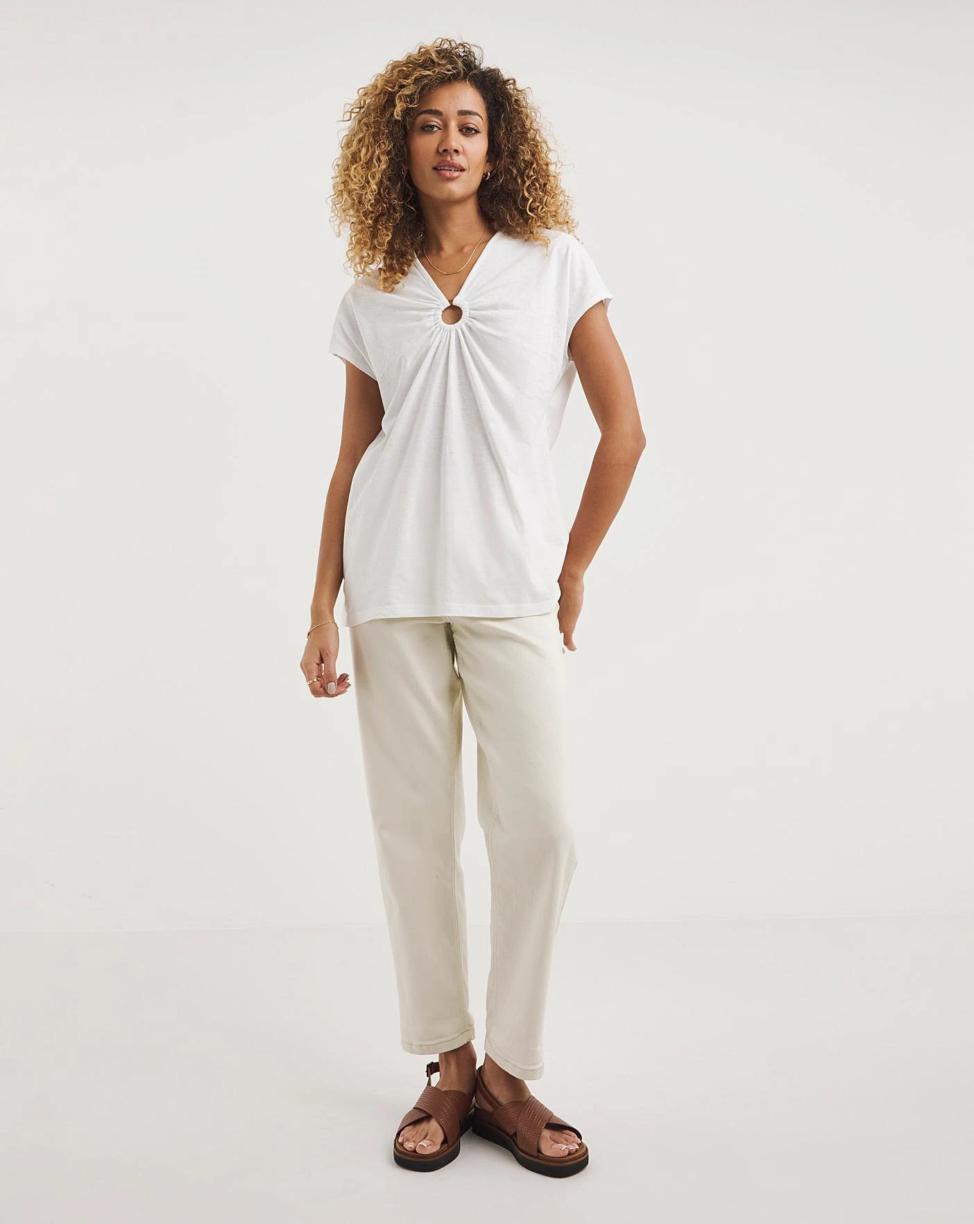 Our short sleeved linen top is the perfect day time piece and the fabric is comfortable and perfect for pairing with jeans for a casual look. This top comes in a relaxed fit.