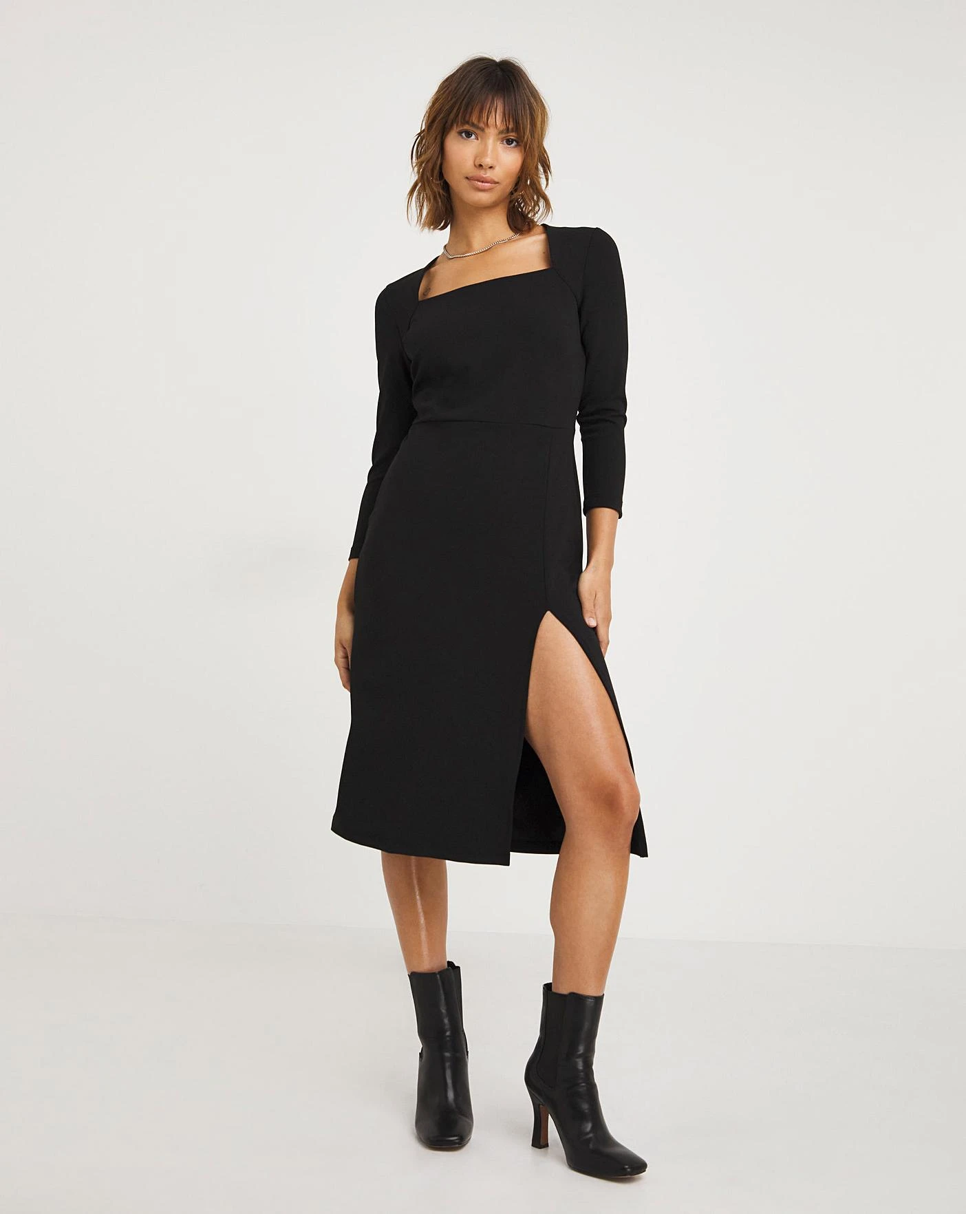 Our gorgeous sophisticated Marylin body skimming dress has a flattering silhouette to take you seamlessly from desk to dinner. Featuring a modern square neckline to elevate the look and a leg slit adding detail. Crafted from a scuba crepe jersey with stretch, the fit will cinch you in whilst allowing you to remain comfortable throughout.