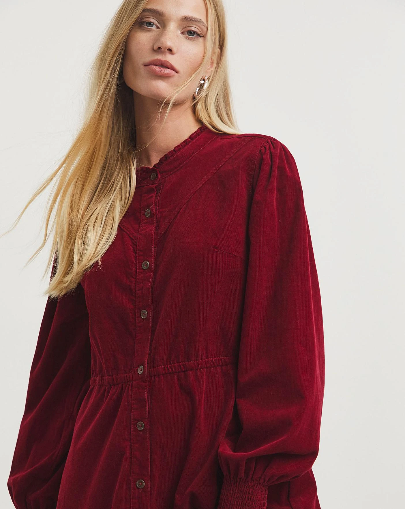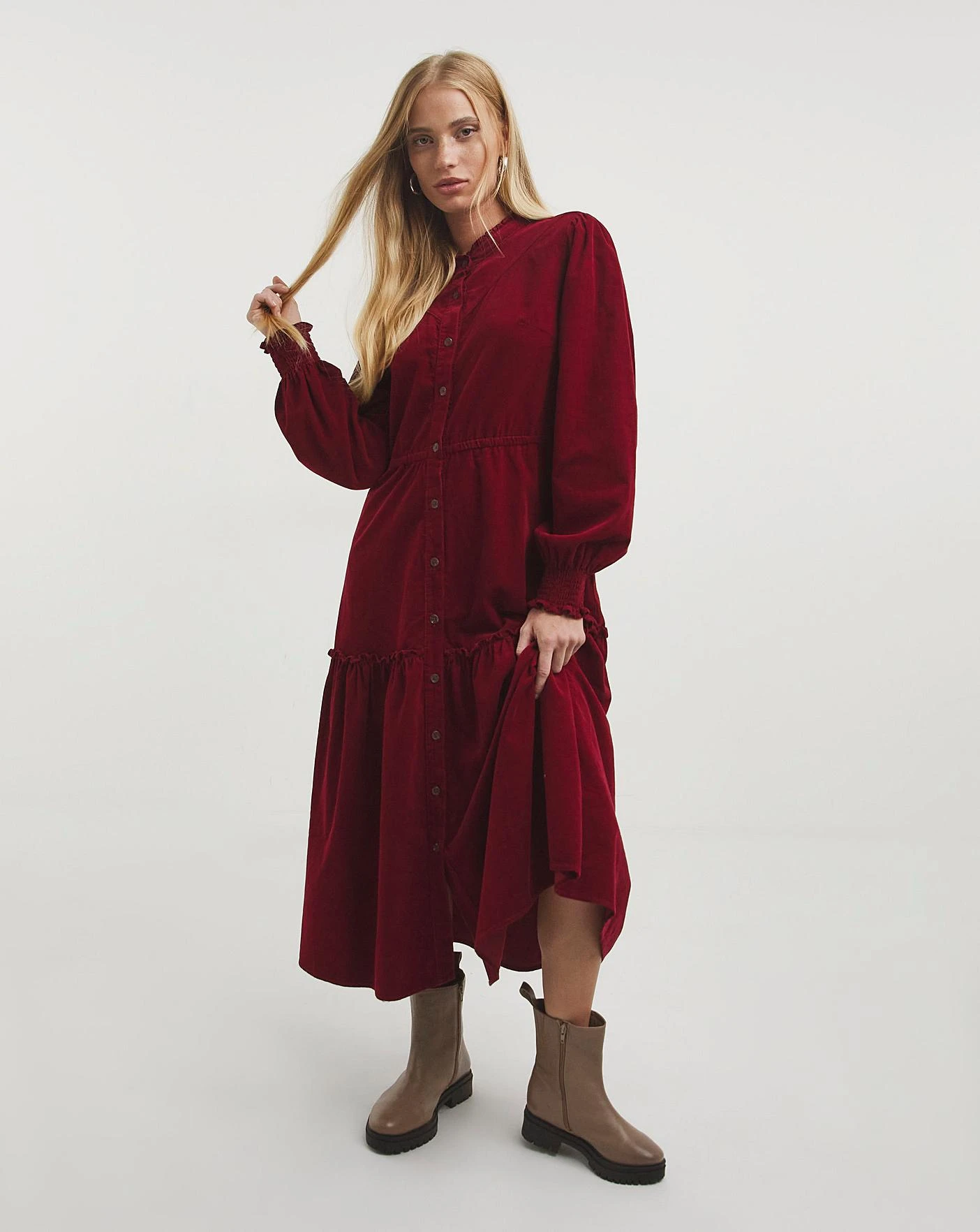 Our stunning new cord midaxi western dress is the perfect throw on for this season. Made from our soft burgundy cord, it features button front, long sleeves, and comfortable shirred cuffs. The dress is finished with seam detailing and a tiered hem. Dress with boots for classic autumnal look.