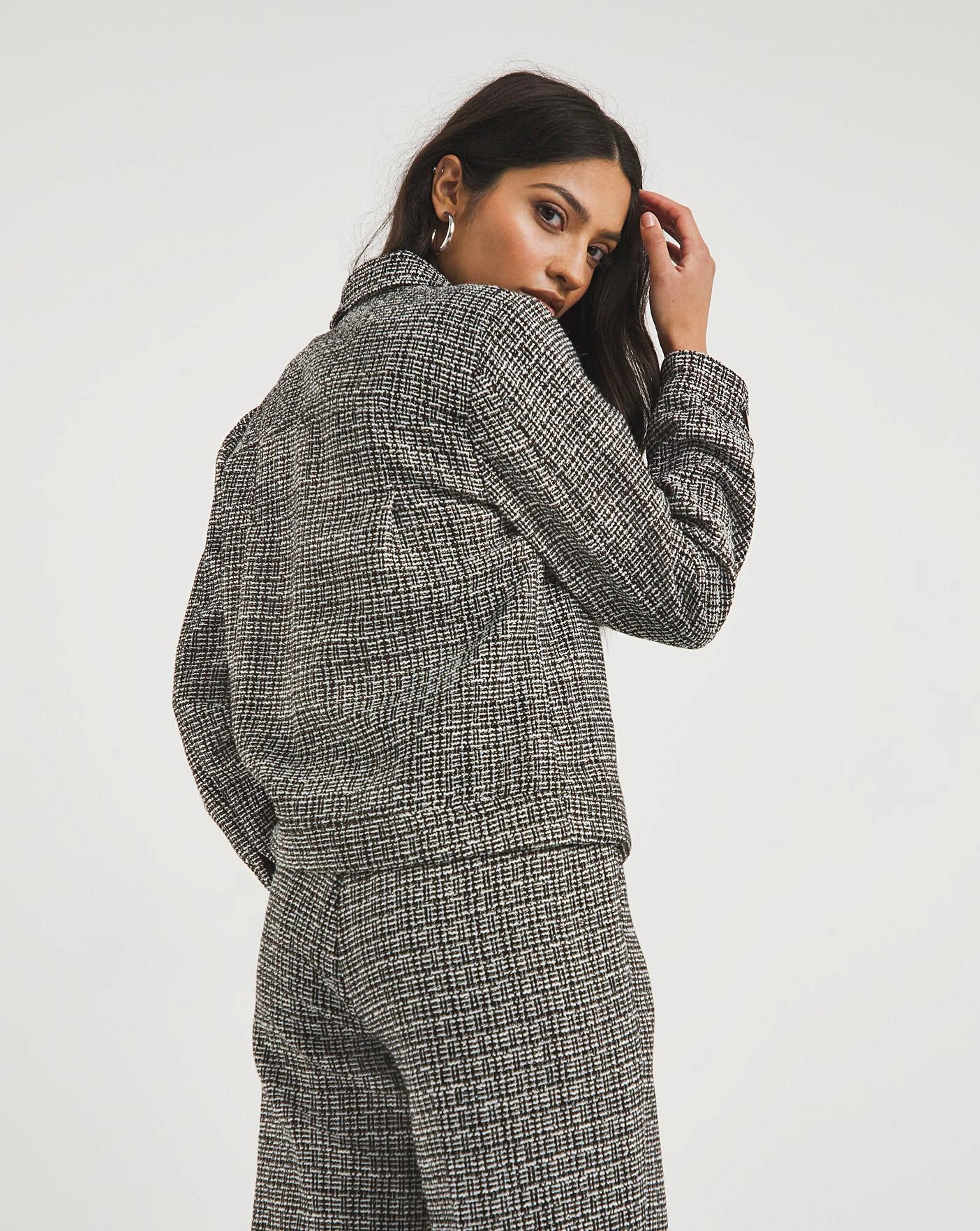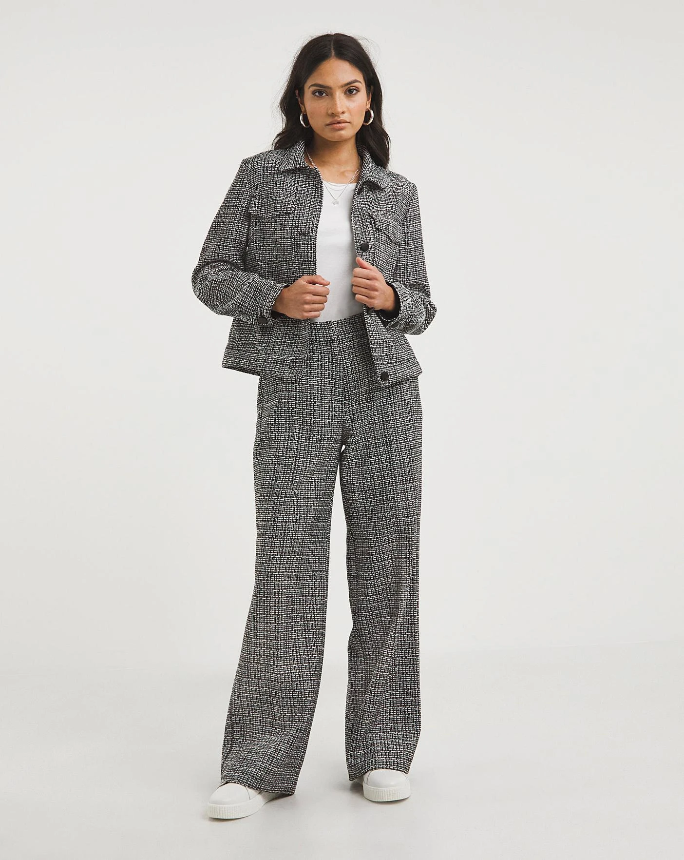Our Mono Check Cropped Patch Pocket Jacket is the perfect versatile layering piece to add to your everyday wardrobe. In a mono check tweed fabrication, elevated with feminine Lurex yarns, this relaxed cropped jacket features front flap pockets, button through front and is fully lined in a stretch lining for additional comfort and structure. Pair with our matching Mono Check Wide Leg Trousers or layer over our Mono Check Pinafore Midi dress to add a smart, tailored touch to any outfit this season.