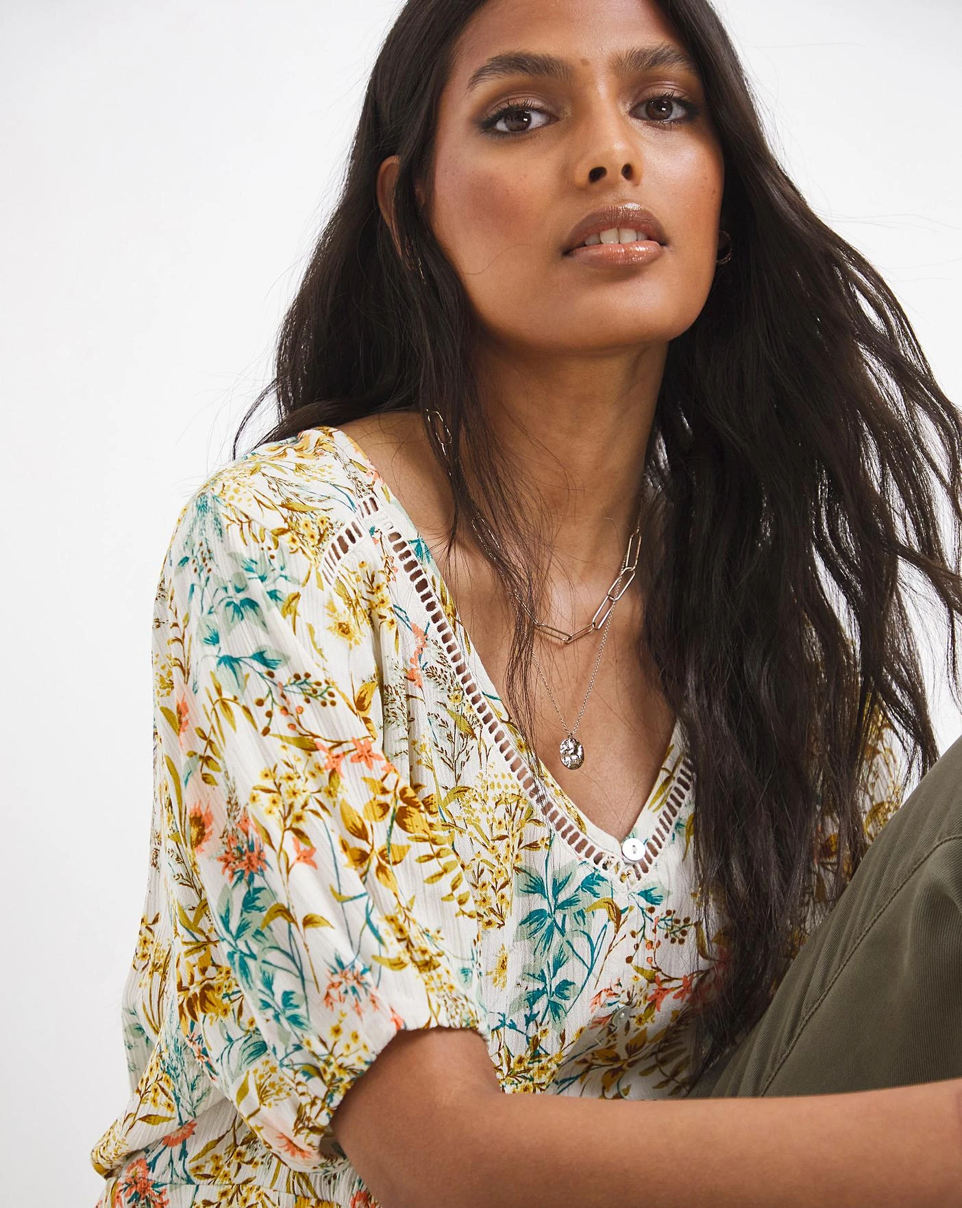 In a flattering floral print, add our ladder trim crinkle top to your wardrobe for a sprinkle of newness. With a ladder trim detail and short sleeves, this top is great for a day date and can be paired easily with jeans. This top offers a relaxed fit.