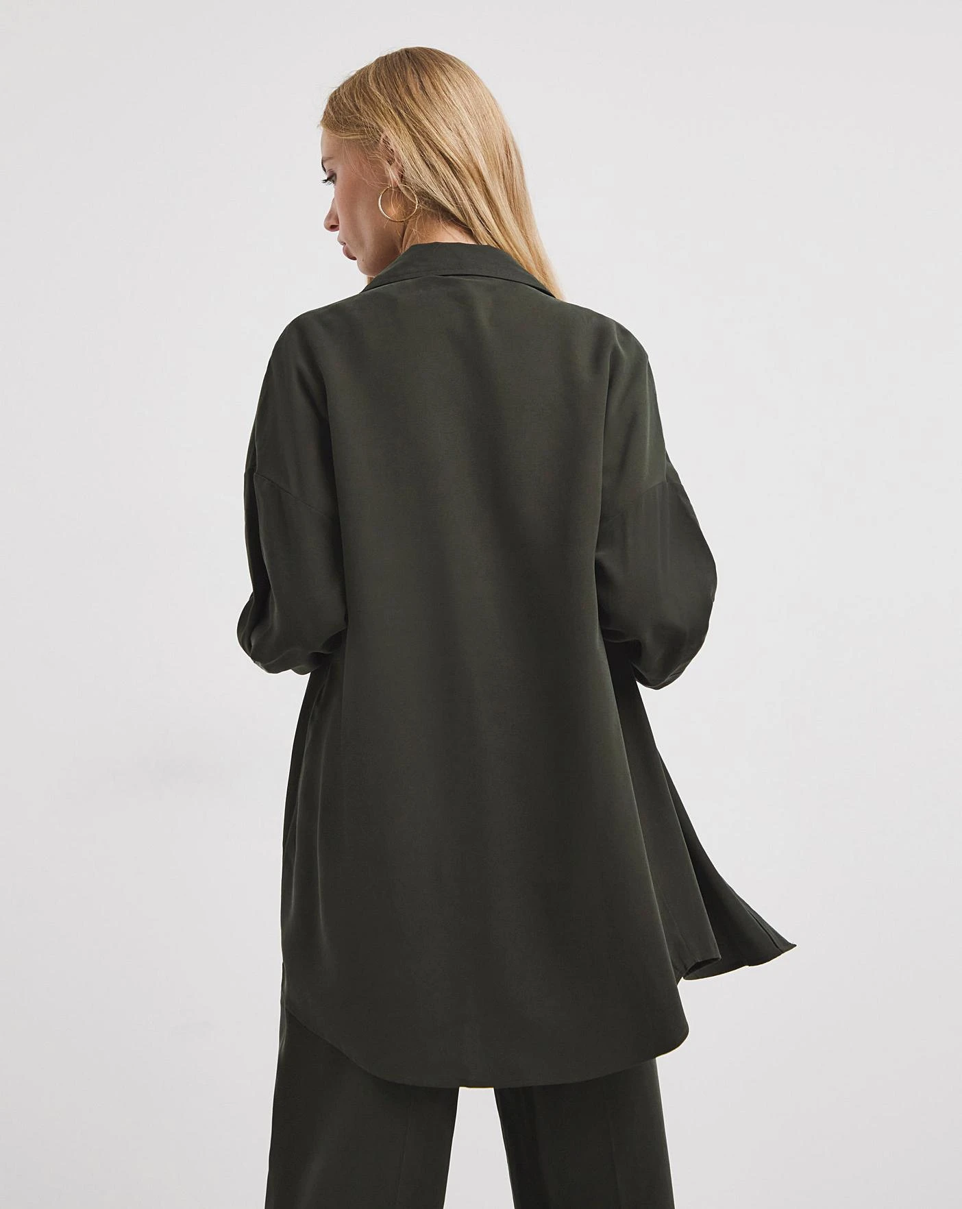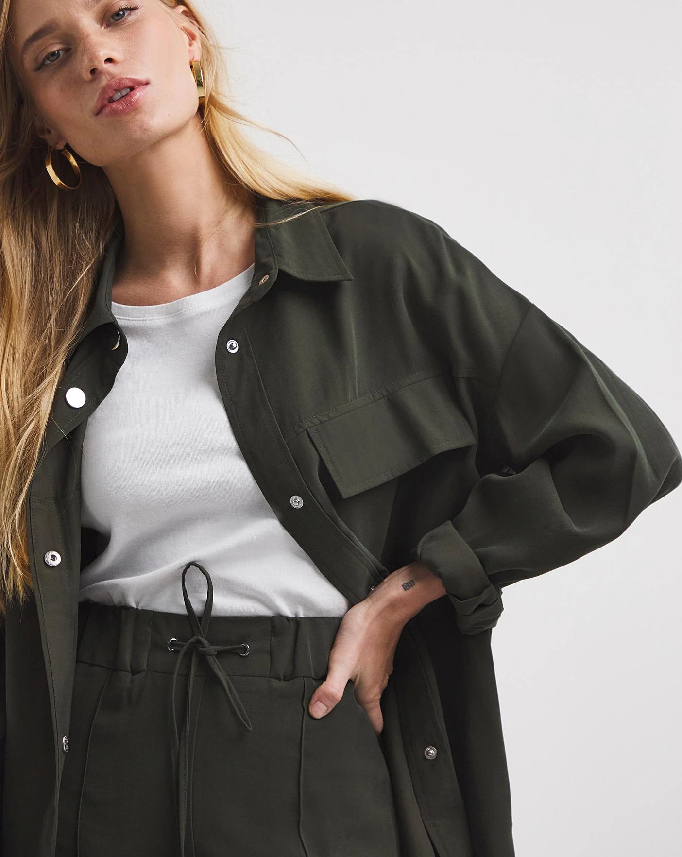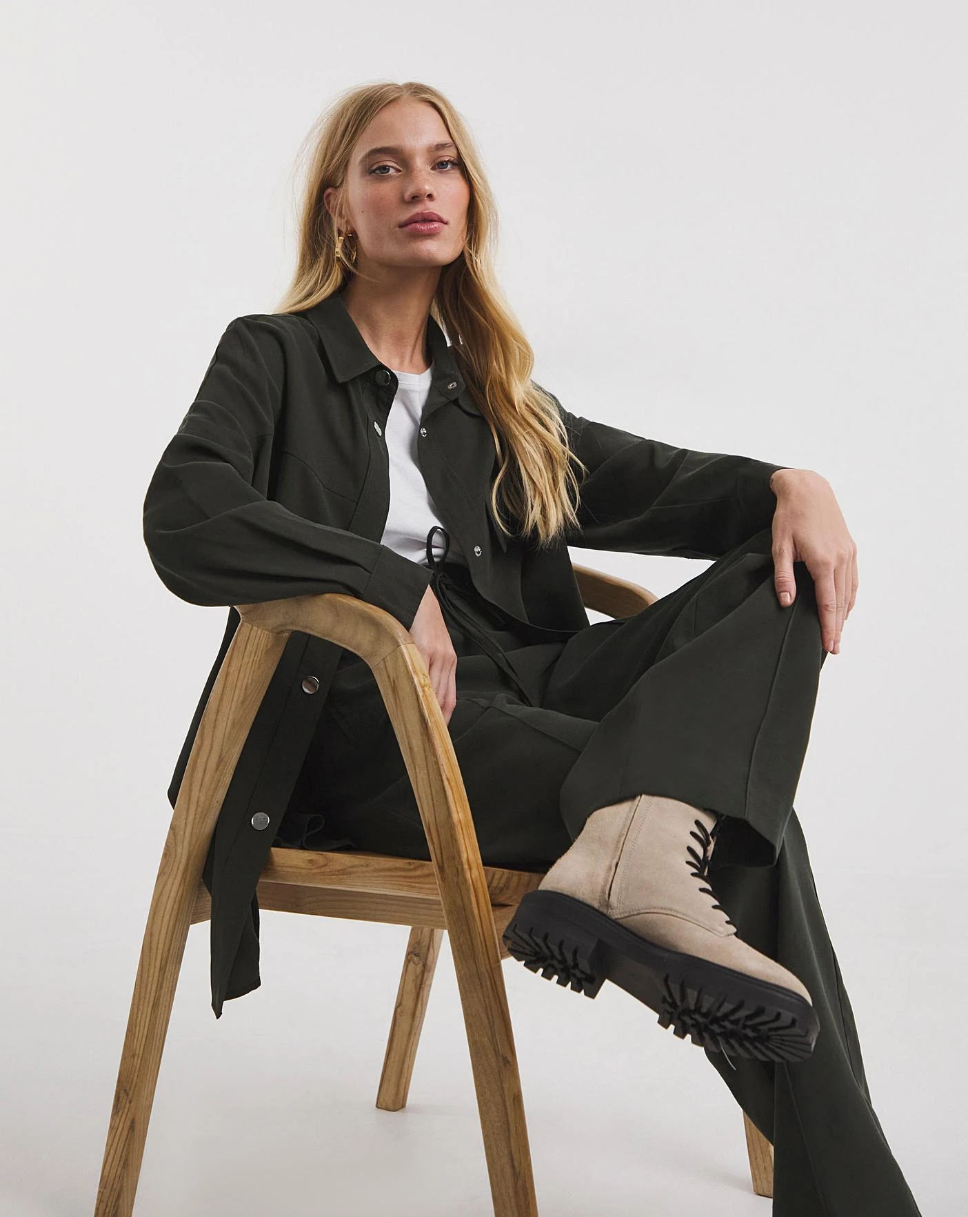 Create an effortless tailored look with our Olive Twill shacket this season. Featuring a collared neckline, poppers down the front, a faux chest pocket and two poppers at each cuff, our shacket is cut to a relaxed fit to ensure plenty of room for layering. In a Twill fabric to give texture and a fluid drape, this shacket has a flattering curved hem. Pair with the matching Olive Twill wide leg trousers for a chic tailored co-ord or wear as a versatile layering separate with your A/W wardrobe staples.