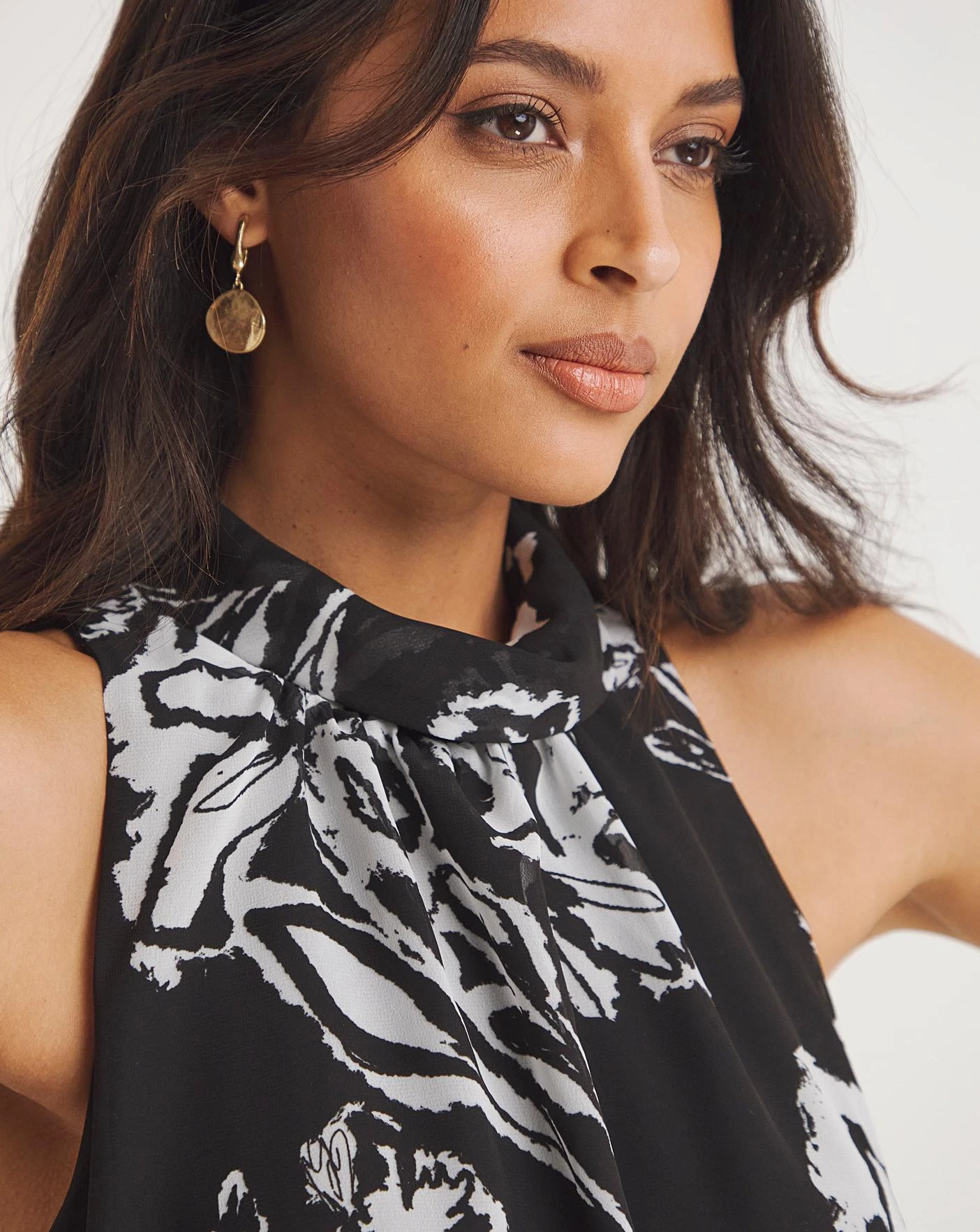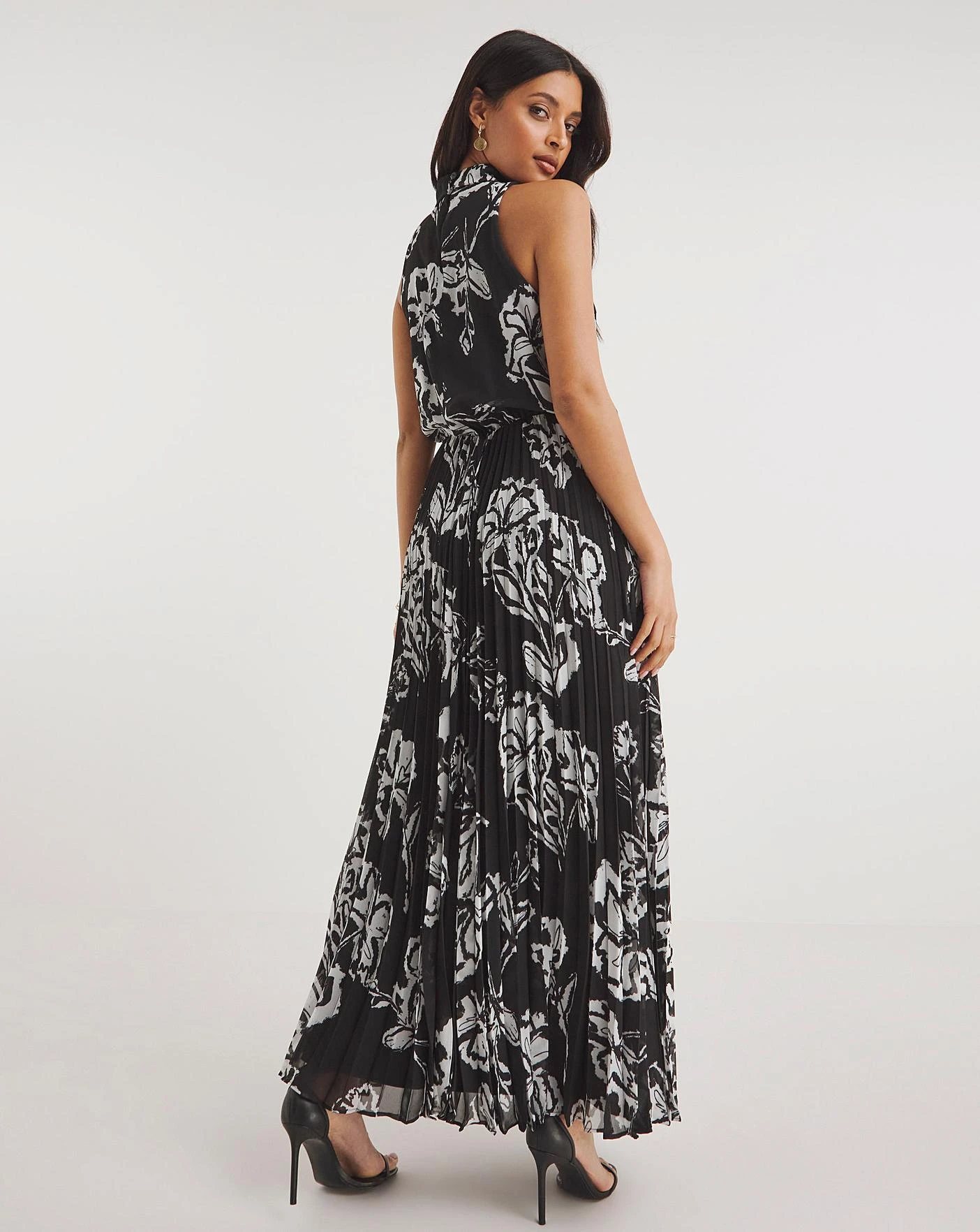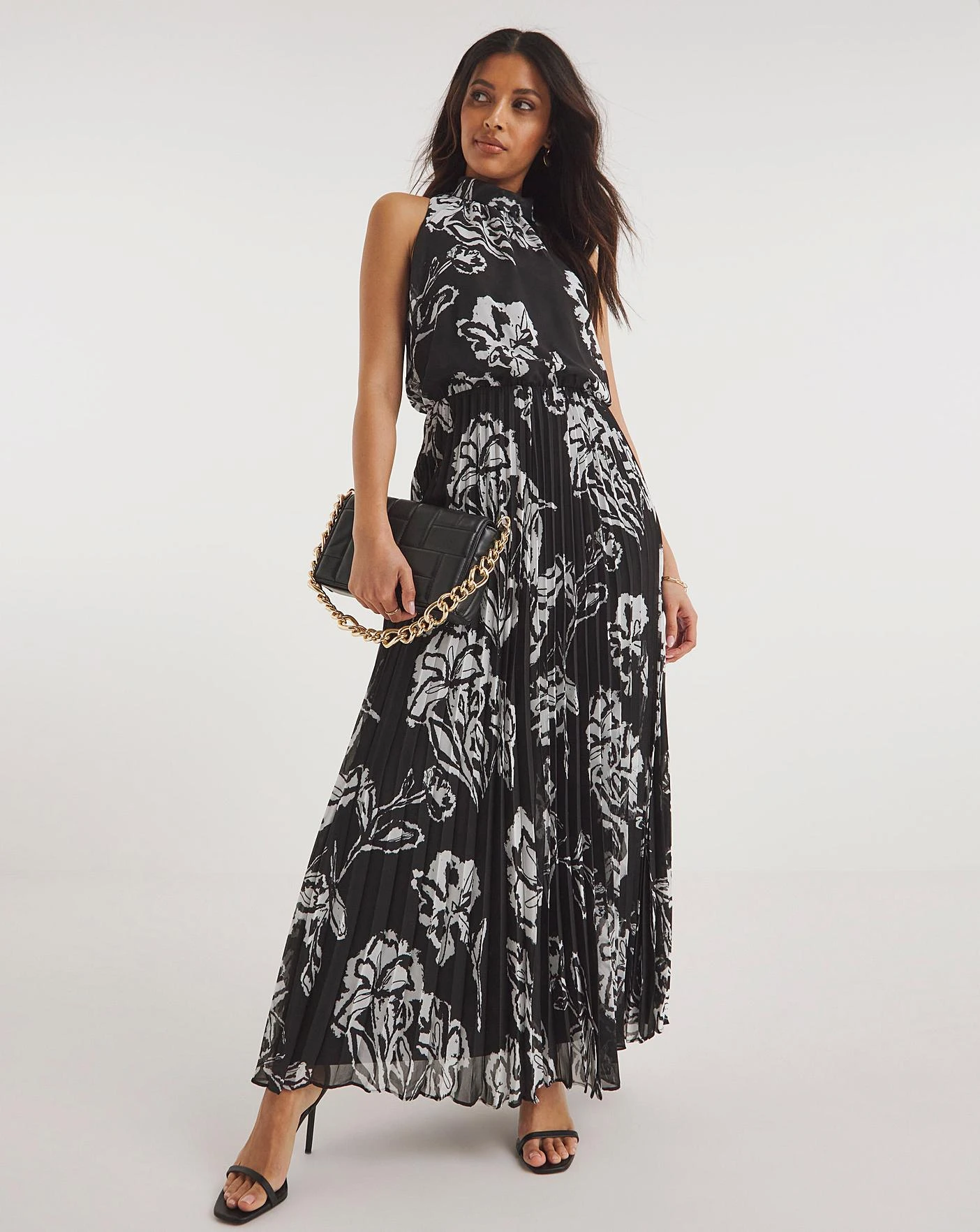 This pretty summer dress is a wardrobe must have. In a maxi dress, this dress features a pleated, full skirt, and high neckline. Style with heels for a black heeled sandal to complete the look.