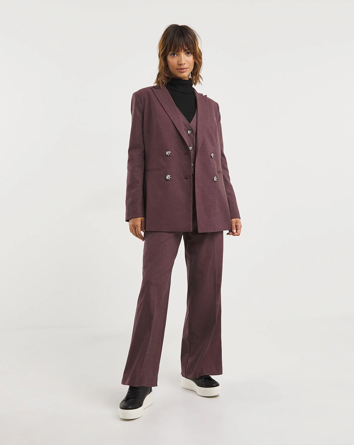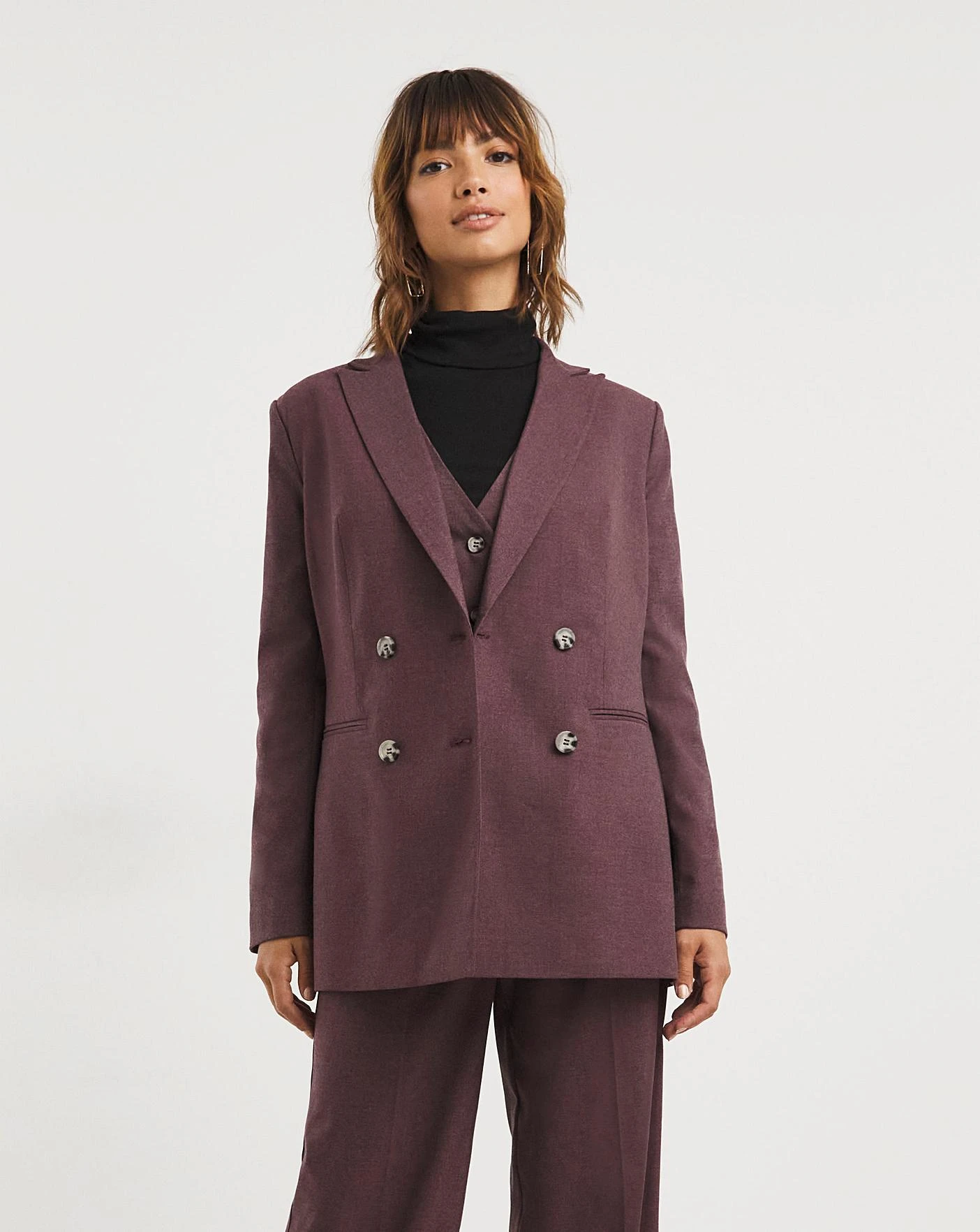 This Plum Marl blazer is the perfect layering piece to wear from season to season. Crafted in a mid stretch fabrication that responds to and moves with your curves, this relaxed double breasted blazer features mock horn buttons, front pockets, back vent and is fully lined for additional comfort and structure. Pair with our matching Plum Marl Waistcoat and Trousers as a tonal, contemporary three piece suit or as a versatile separate to take you from day to night.