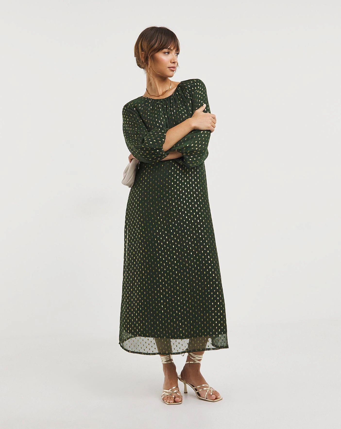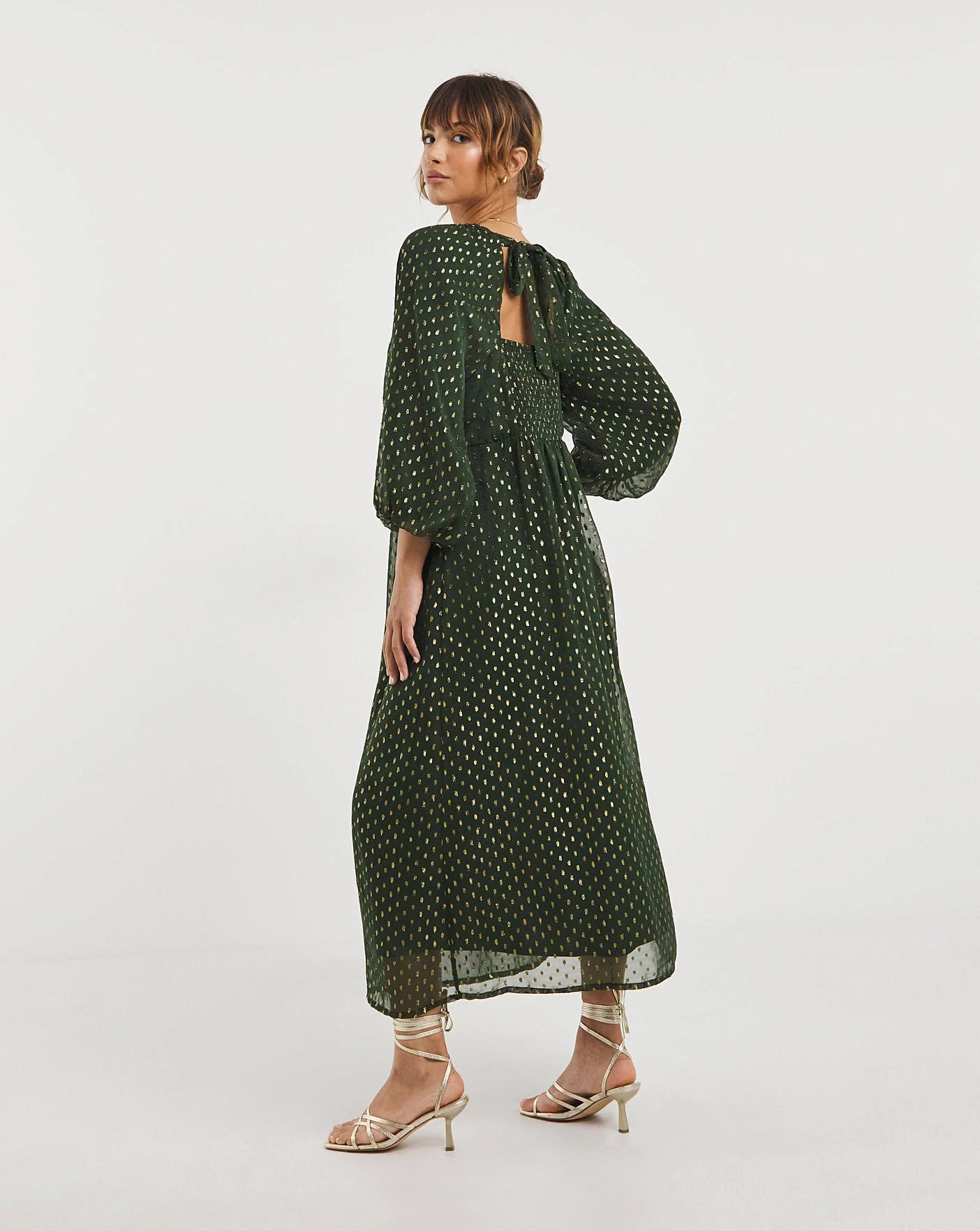 Our best-selling shape – this elevated midi dress has been re-imagined in a striking green dobby fabric with gold lurex spot. Full of design details, featuring elegantly puffed sleeves, a modern open tie back and a shirred back panel for that perfect fit. This feminine silhouette will take to stylishly to every occasion.