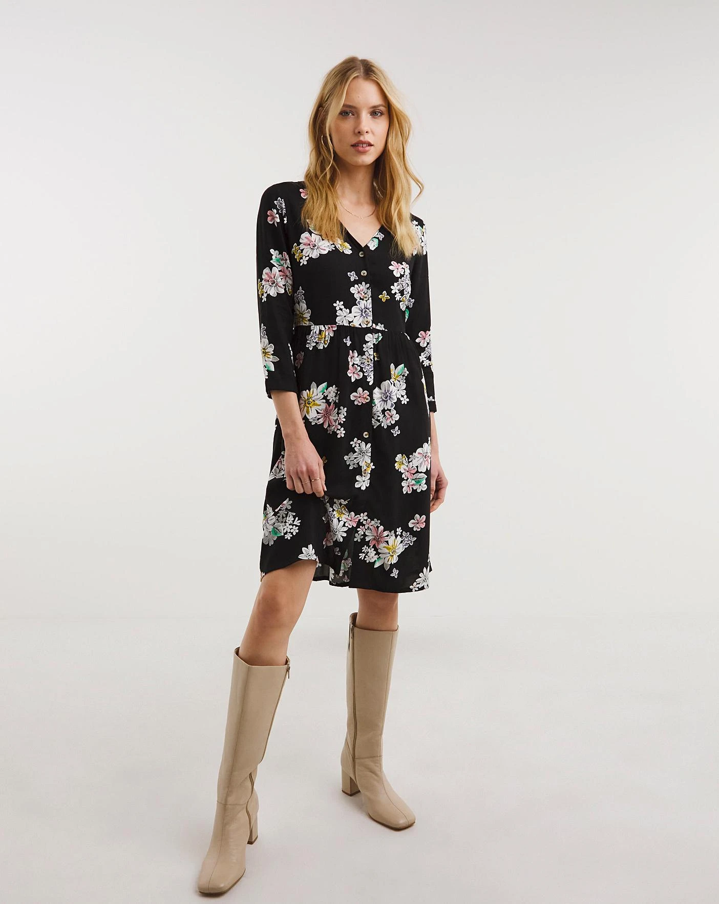 Designed in a sustainably sourced Viscose, this dress is a great day dress. Its relaxed shape makes it an easy throw on! Featuring a button through front, a simple V neck and 3/4 sleeves. Falling at our knee length, perfect for the new season ahead.