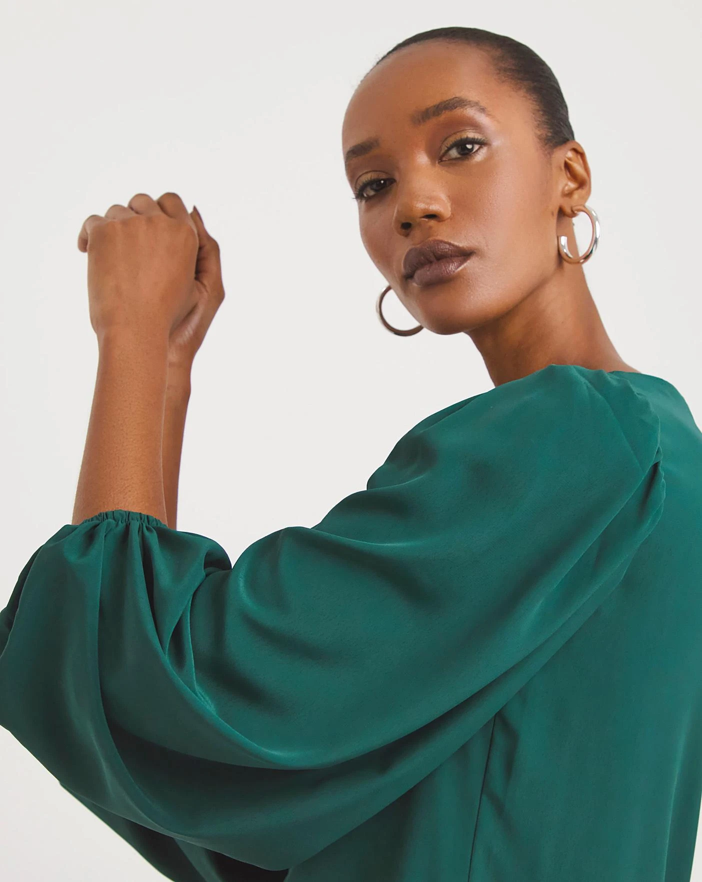 For a sophisticated going out look, choose our ruched front balloon sleeve satin top. Featuring a v neckline, ruched detailing at the front and three quarter sleeves, this top can be paired easily with a pair or leather pants or black trousers. In a relaxed fit, we would recommend sticking to your usual size.