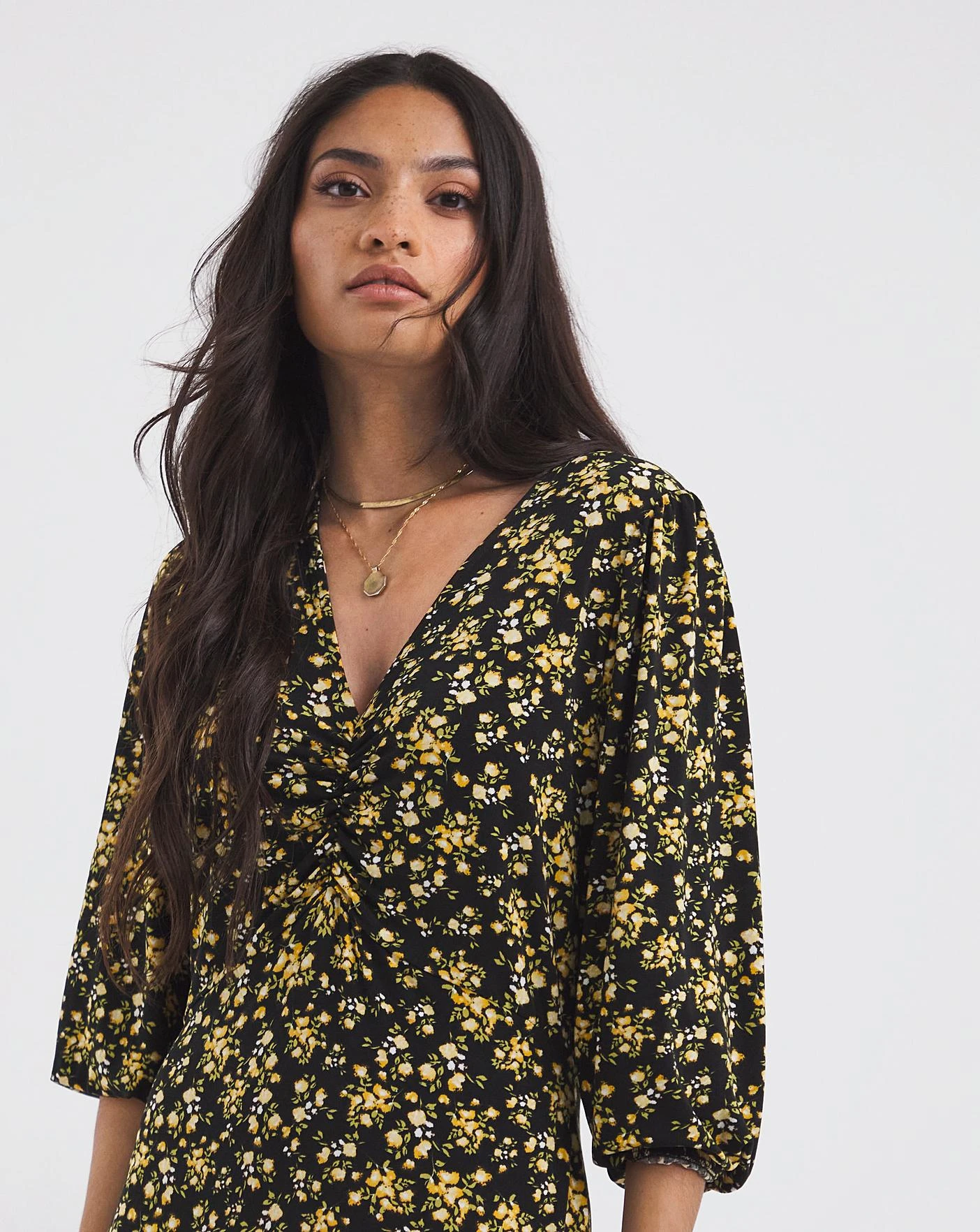 In a cute yellow floral print, this dress features a ruched front with a V neckline and ¾ sleeves. In a stretchy material, this dress is comfortable without compromising style so you can enjoy your day while looking fabulous.