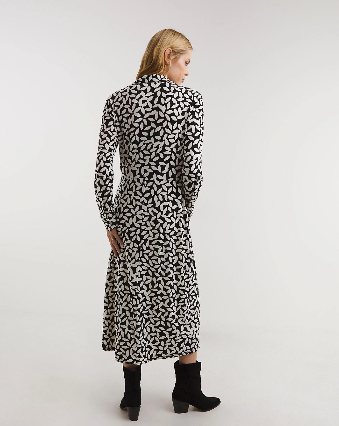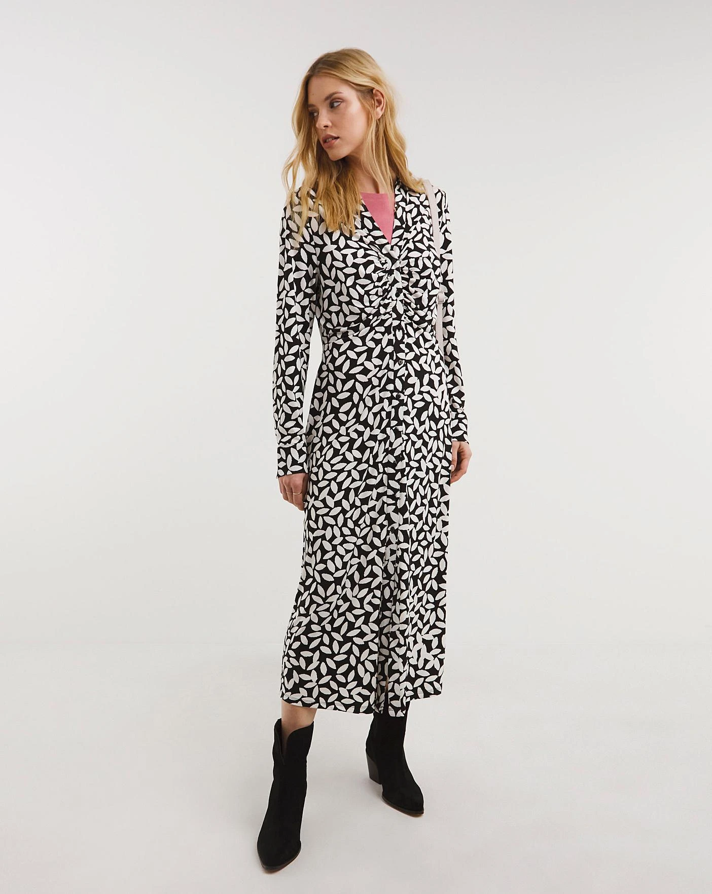 In a slinky stretch jersey fabrication, this midi dress is a smart yet comfortable design that will take you effortlessly from desk to dinner. The modern graphic mono print is cut in a feminine shirt shape featuring a button-down front with flattering rouching.