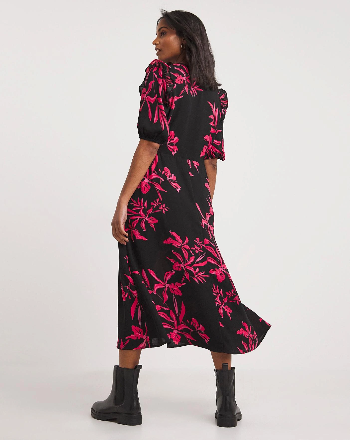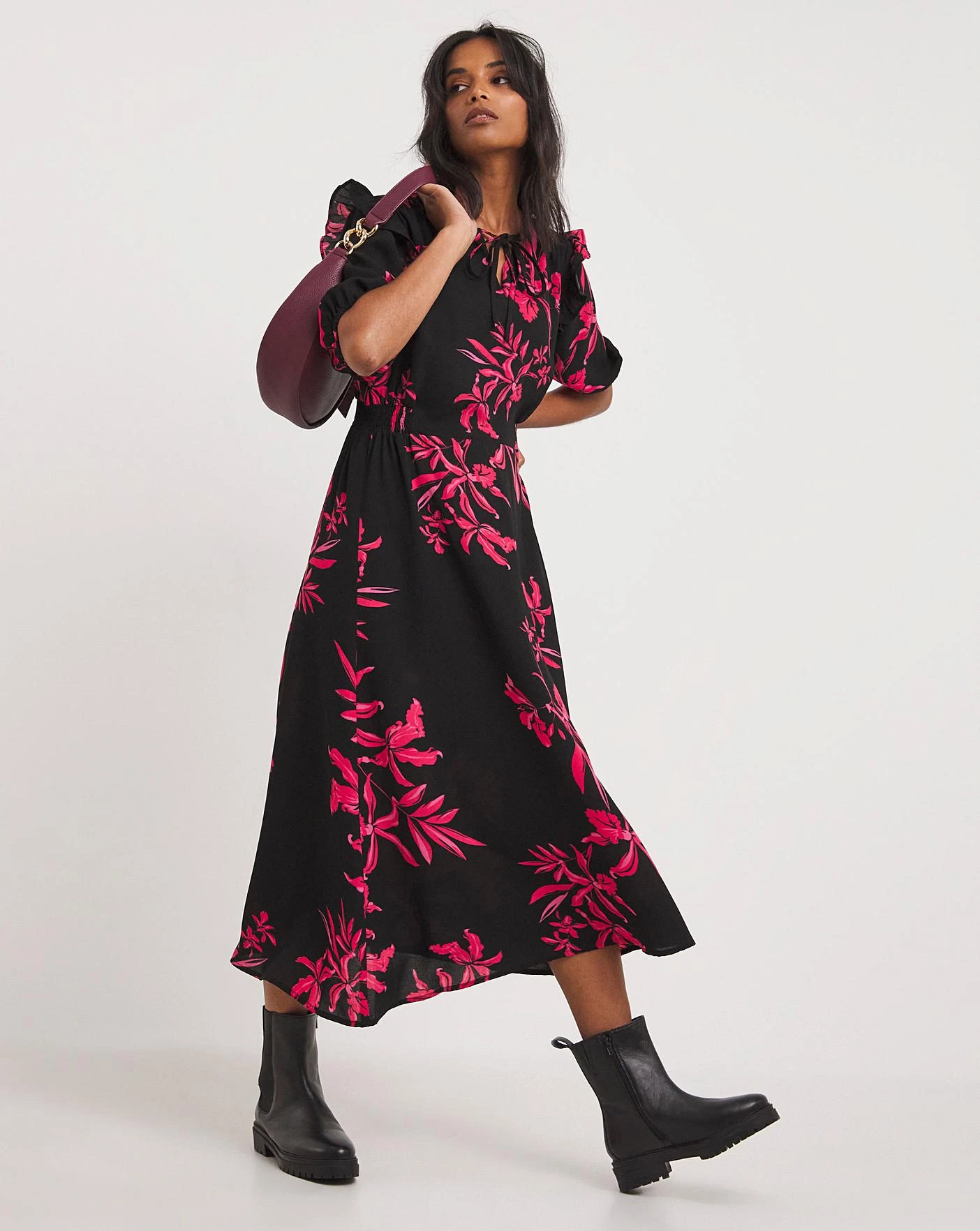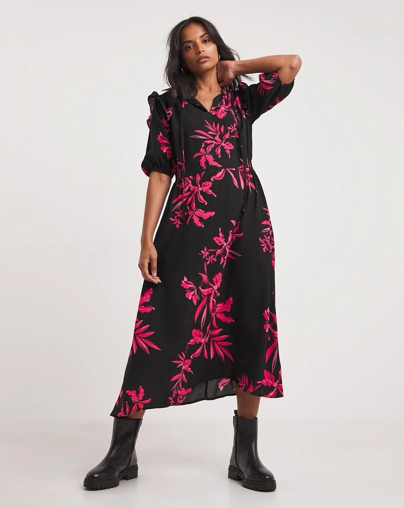 This gorgeous black and pink printed tie neck tea dress is perfect for any occasion. Features include a an elasticated gathered waist to add femininity and detail, a tie neck with a key hole neckline and short elasticated cuff sleeves- all while maximising comfort.