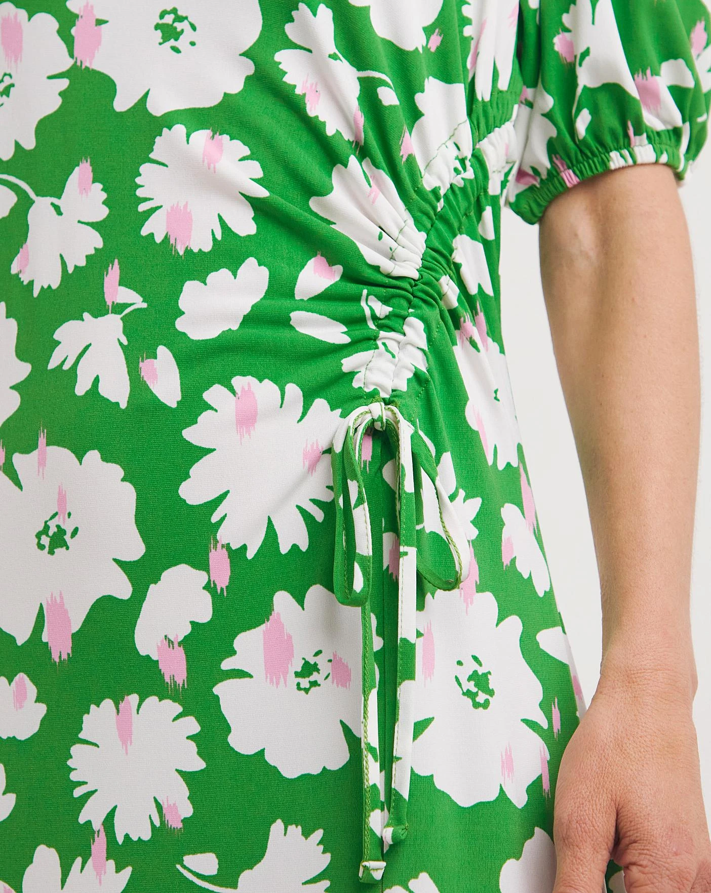 This gorgeous dress is perfect for the summer months. In a midi length, this dress features a flattering runched side and short voluminous sleeves.
